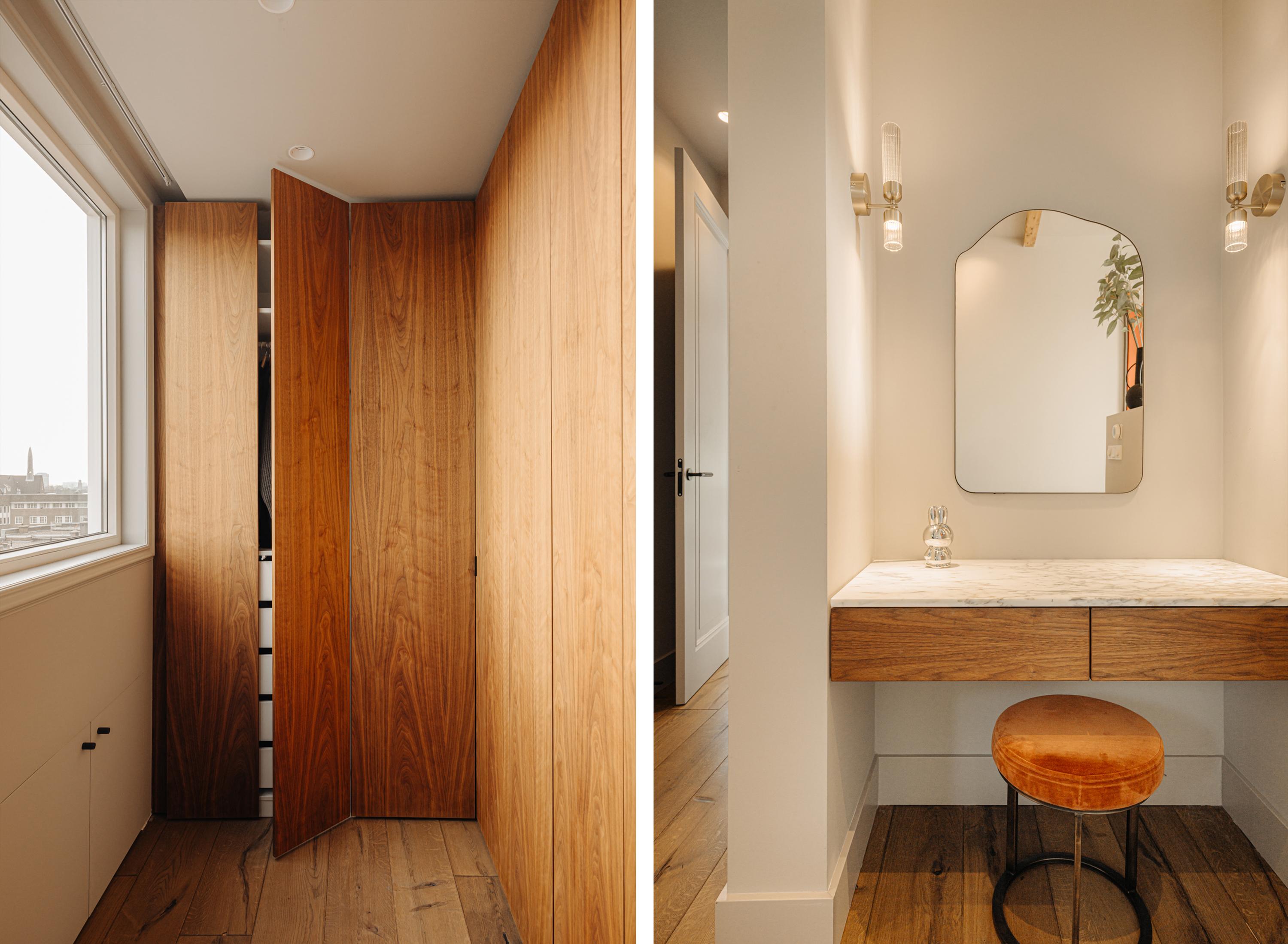 Het penthouse beschikt over drie ruime slaapkamers, twee daarvan voorzien van op maat gemaakte inbouwkasten en een airco installatie. De master bedroom beschikt over een balkon gelegen op het zuiden en een en-suite badkamer, uitgerust met een vrijstaand bad, een inloopdouche en een dubbele wastafel met meubel. Om de hoek vindt u nog een fraaie make-up tafel en een separaat toilet met fontein.