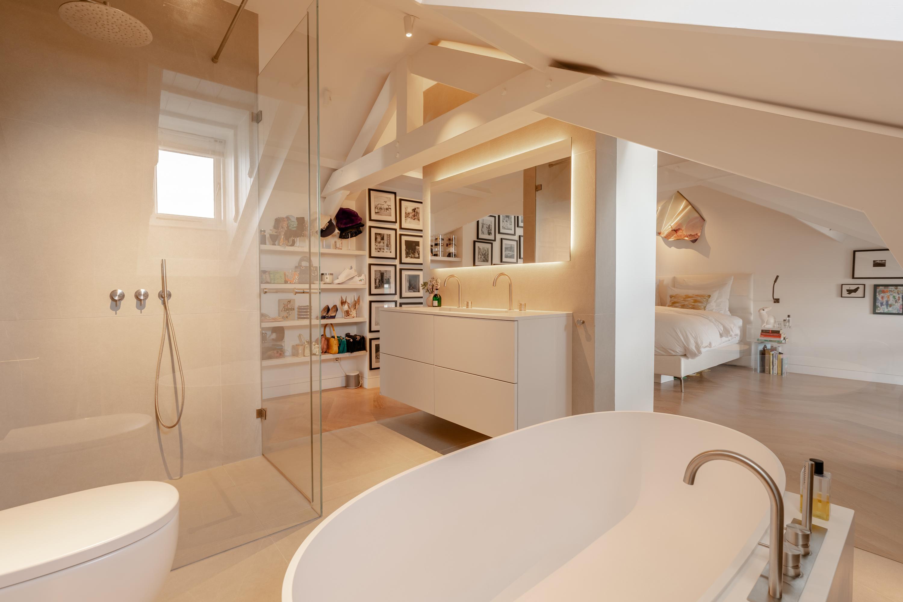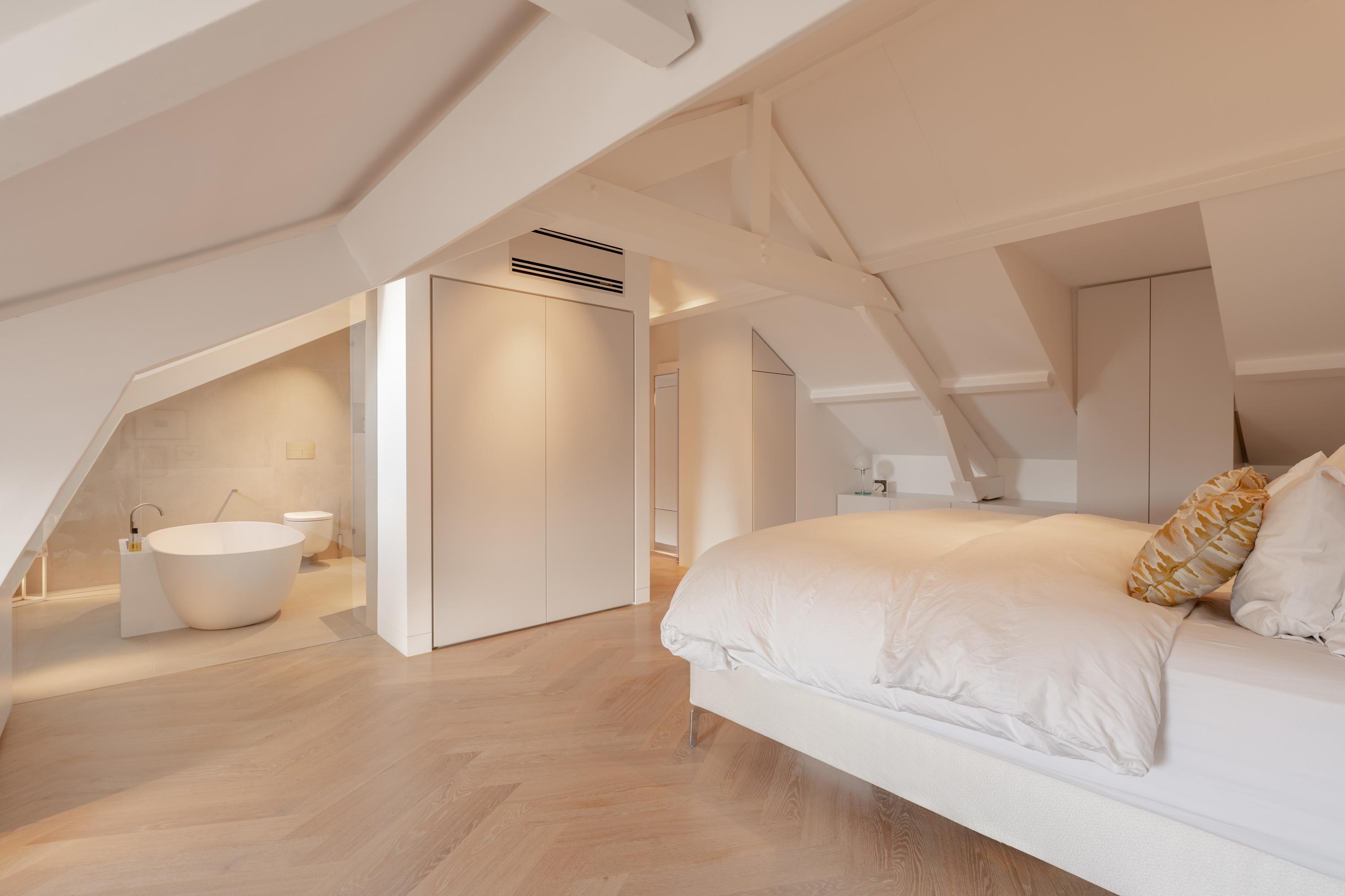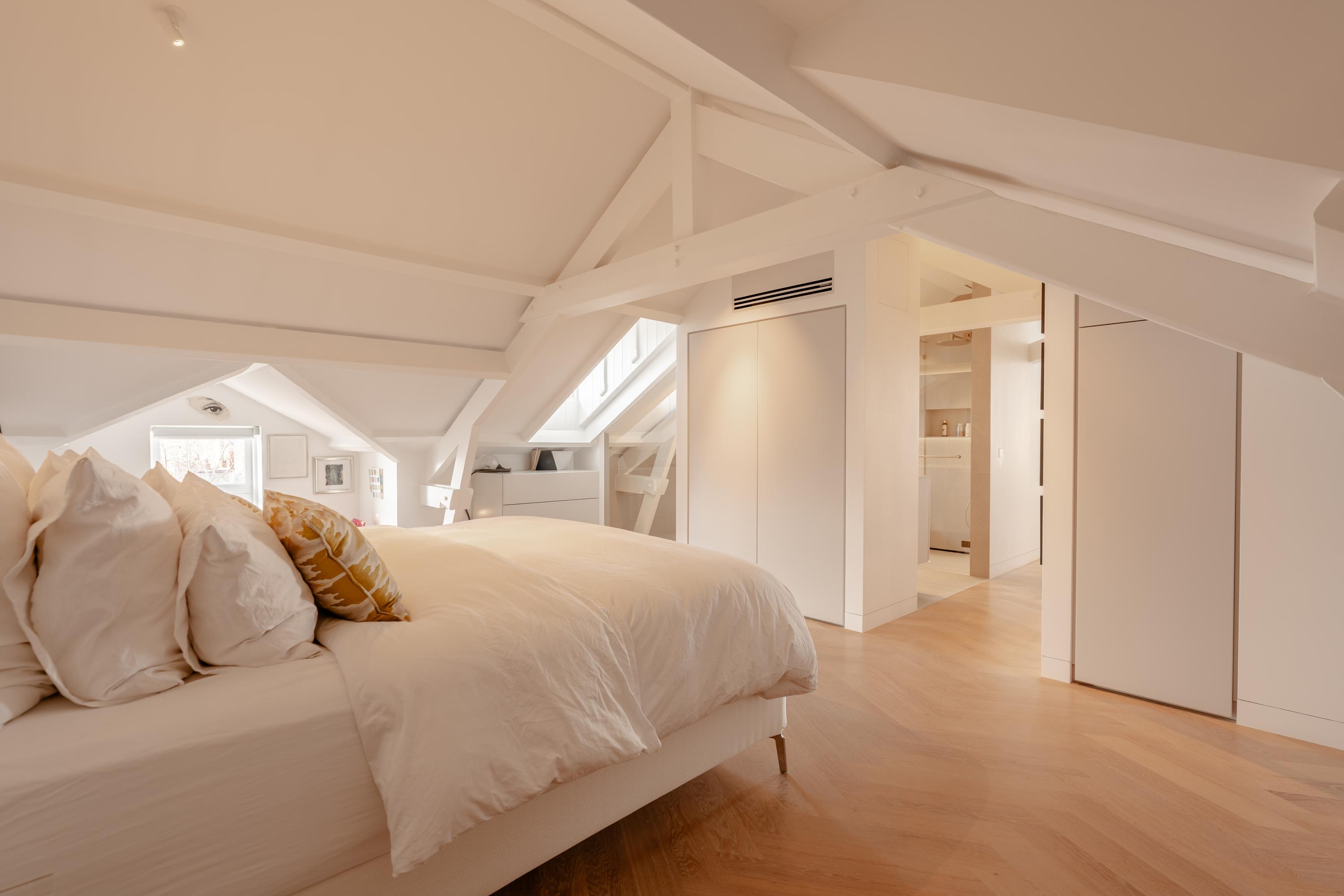 De royale master bedroom, bereikbaar vanuit de woonkamer, straalt rust en luxe uit. De zichtbare balken geven de ruimte een speels en karaktervol accent, terwijl de slimme inbouwkasten en maatwerkoplossingen onder de schuine wanden zorgen voor optimaal gebruik van de ruimte. Ook hier is airconditioning aanwezig voor maximaal comfort. Aangrenzend bevindt zich de ensuite badkamer, die is ruim opgezet en hoogwaardig afgewerkt. Hier vindt u een dubbele wastafel met meubel, een vrijstaand ligbad, een royale inloop regendouche en een toilet.