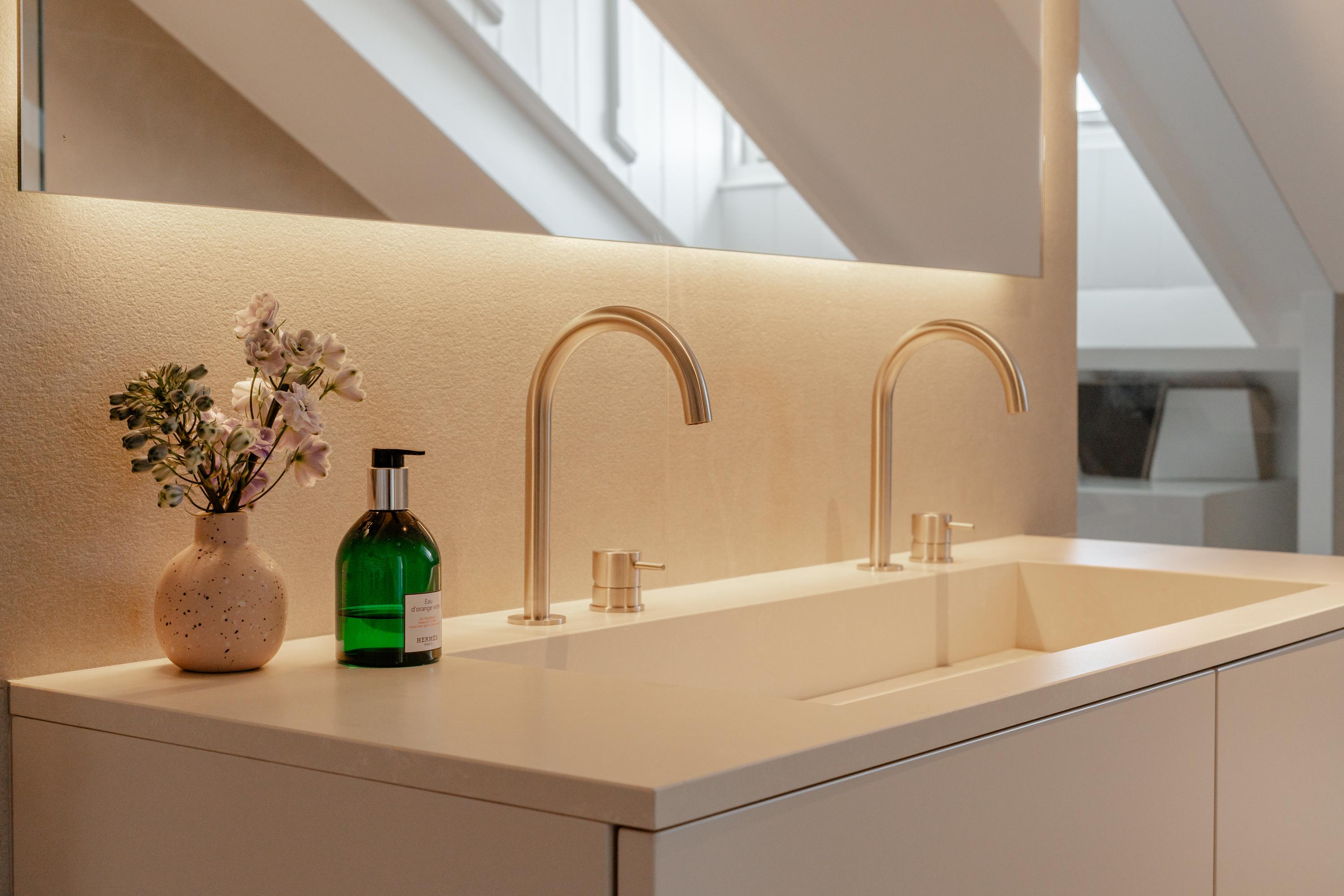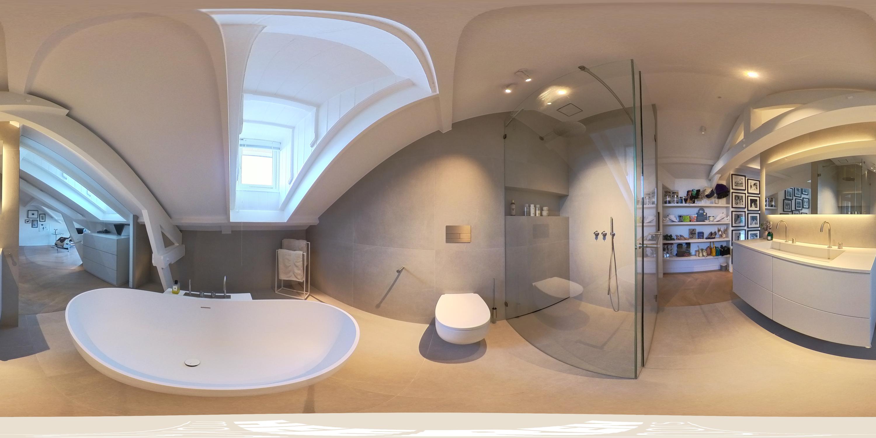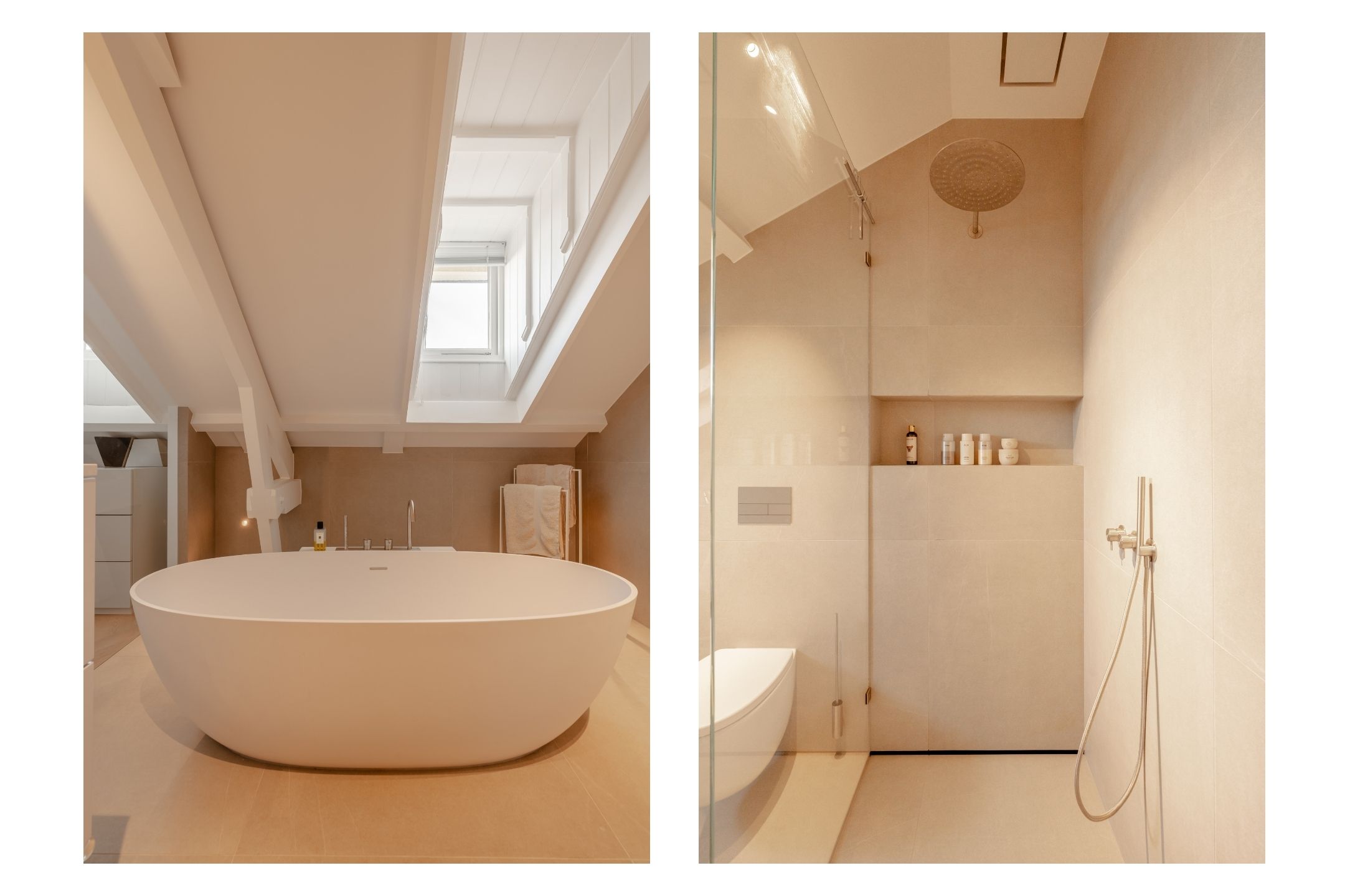 De royale master bedroom, bereikbaar vanuit de woonkamer, straalt rust en luxe uit. De zichtbare balken geven de ruimte een speels en karaktervol accent, terwijl de slimme inbouwkasten en maatwerkoplossingen onder de schuine wanden zorgen voor optimaal gebruik van de ruimte. Ook hier is airconditioning aanwezig voor maximaal comfort. Aangrenzend bevindt zich de ensuite badkamer, die is ruim opgezet en hoogwaardig afgewerkt. Hier vindt u een dubbele wastafel met meubel, een vrijstaand ligbad, een royale inloop regendouche en een toilet.