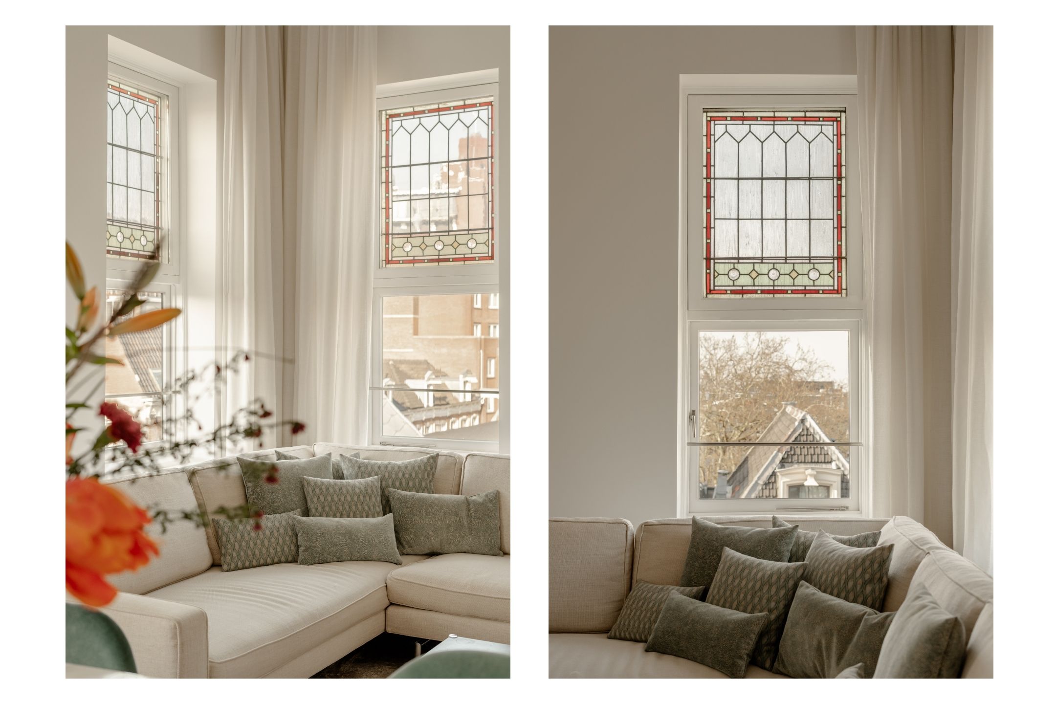 Via de gang loopt u door naar de woon- en zitkamer, gelegen op de hoek van het appartement, die eveneens beschikt over grote ramen en hoge plafonds, wat zorgt voor een lichte en ruimtelijke sfeer en een weids uitzicht over de stad. De ramen zijn voorzien van sfeervolle glas-in-looddetails, wat bijdraagt aan het karakter van de woning. Daarnaast beschikt de woonkamer over een ingebouwd tv-meubel en een gashaard, die samen zorgen voor een warme en elegante ambiance. Vanuit de gang heeft u tevens toegang tot een praktische bergruimte die erg ruim is en voor veel opslag ruimte zorgt en diverse inbouwkasten, ideaal voor extra opslag. Middels schuifdeuren kan de keuken desgewenst van de gang worden afgesloten.