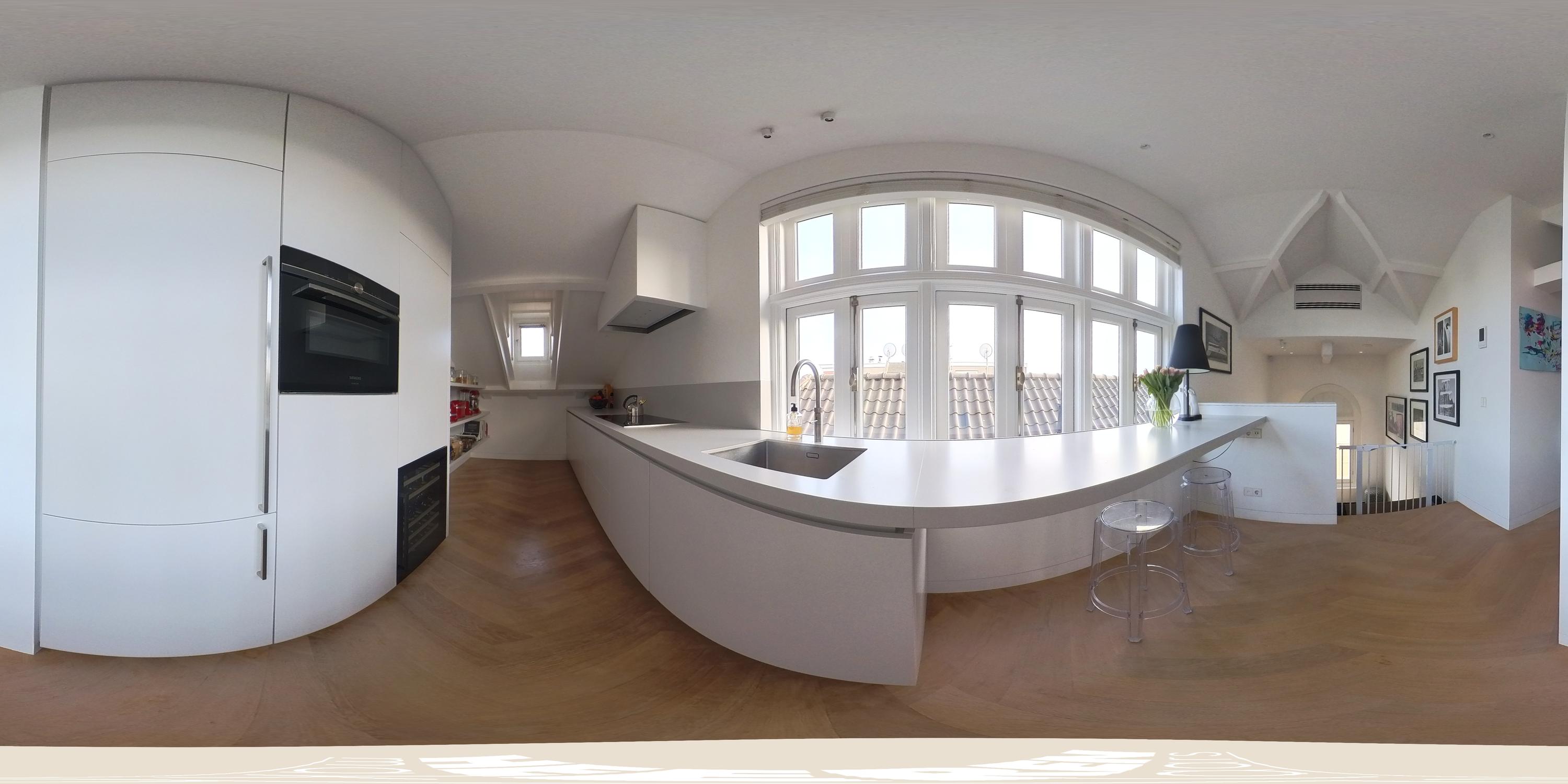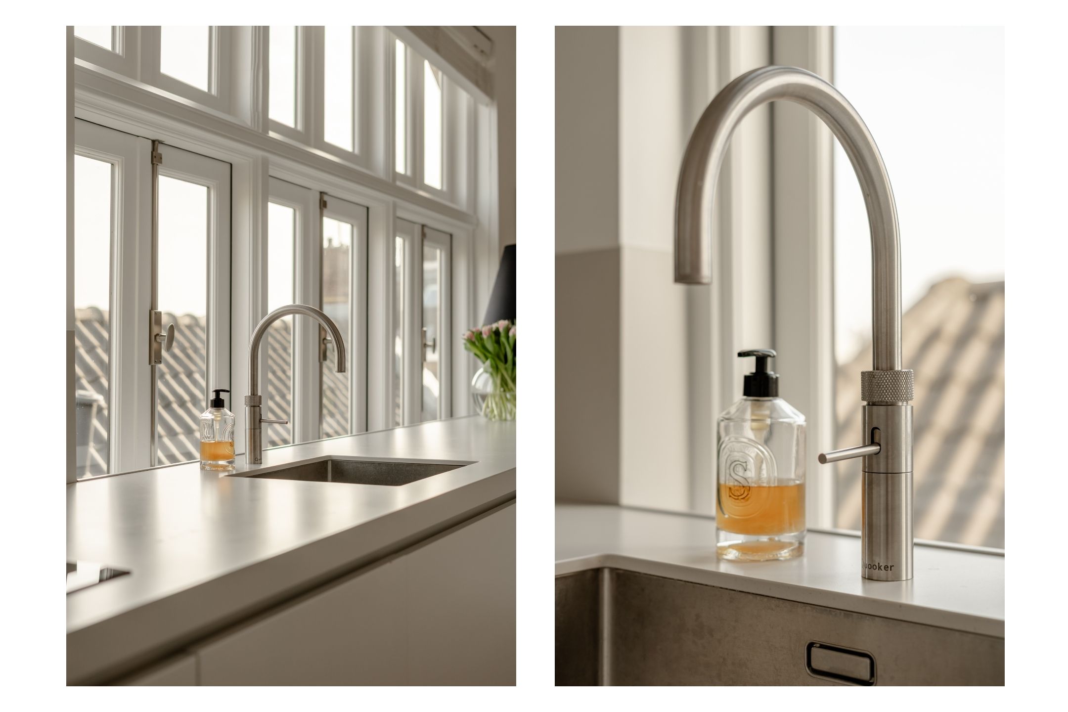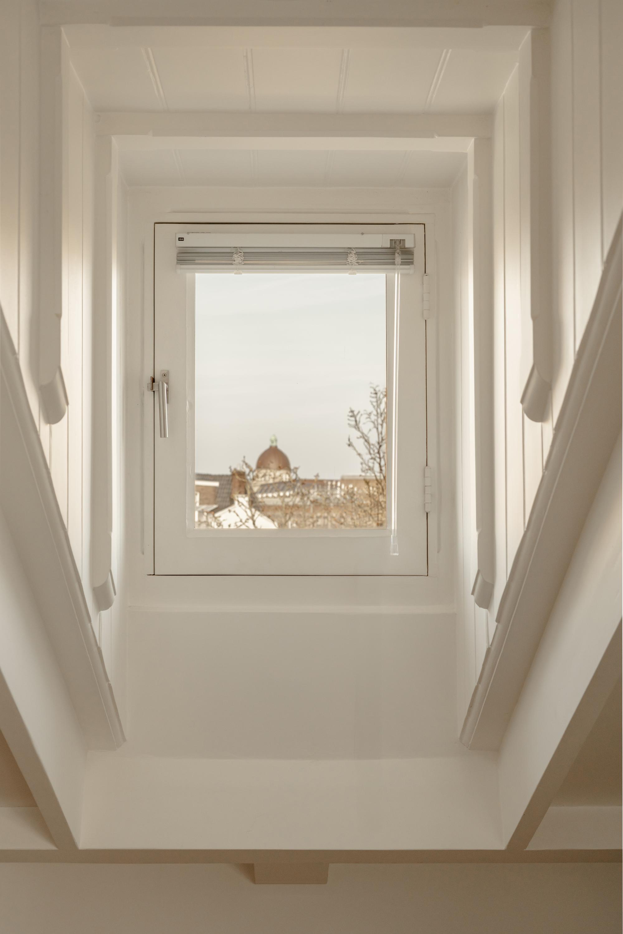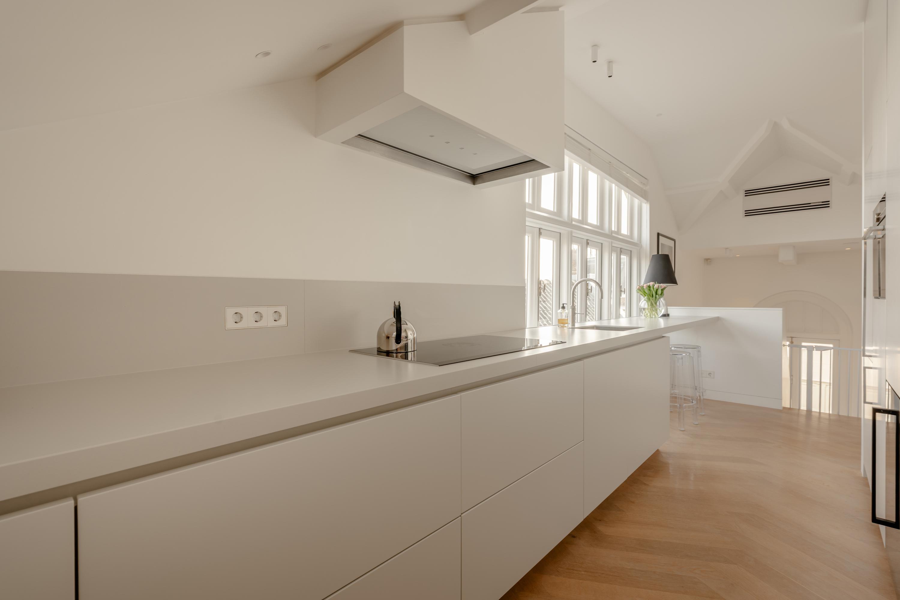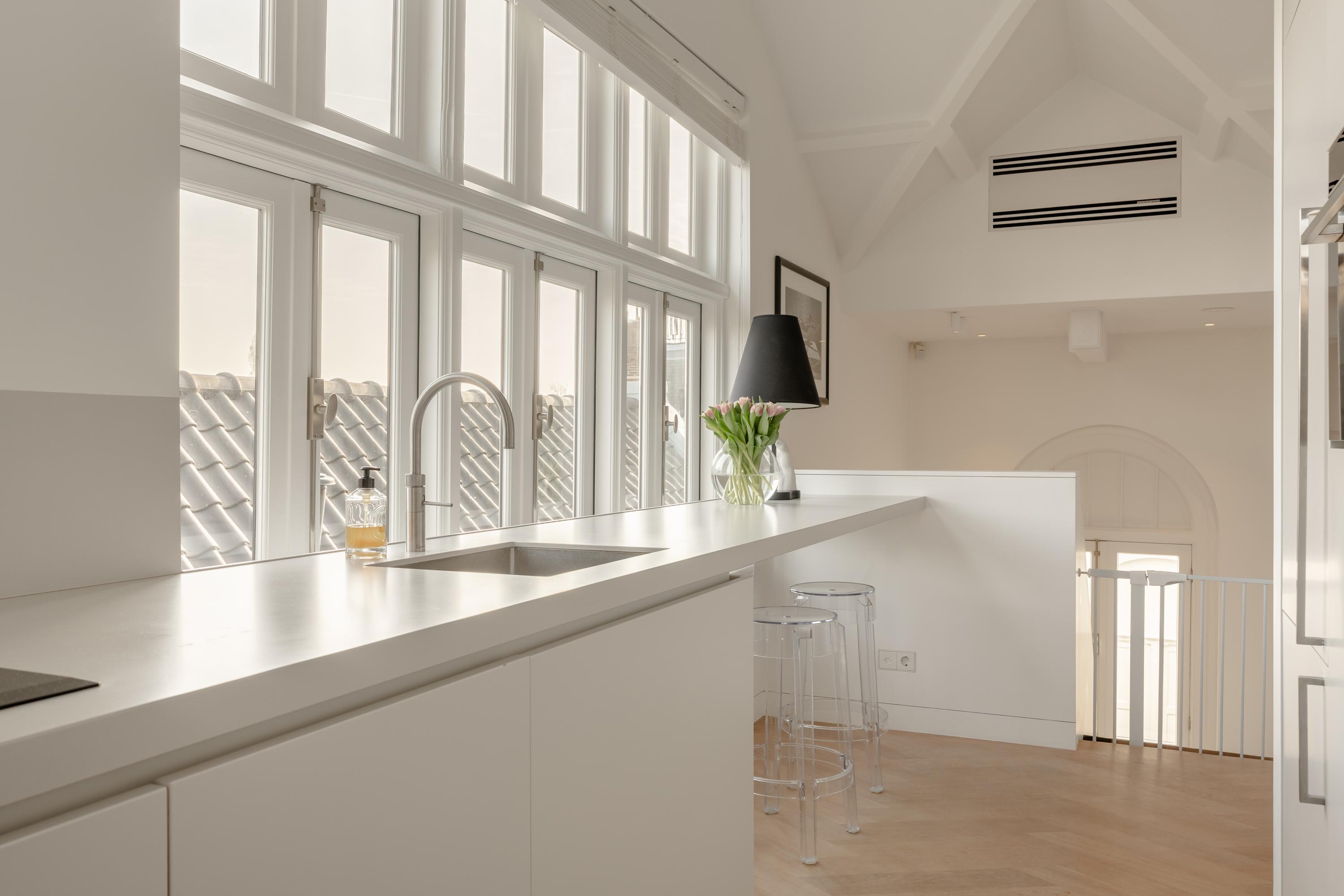 De interne trap leidt u naar de woonverdieping op de vierde en tevens bovenste etage, waar u direct wordt verwelkomd in de indrukwekkende leefkeuken. Deze keuken is strak vormgegeven en voorzien van een bargedeelte, ideaal om aan te borrelen of te werken. De op maat gemaakte, greeploze plafondhoge kasten zorgen voor een luxe en minimalistische uitstraling. De woning is voorzien van hoogwaardige, op maat gemaakte inbouwkasten in alle vertrekken, waardoor losse kasten overbodig zijn en de ruimtes optimaal benut worden. Dankzij de grote raampartijen geniet de ruimte van een overvloed aan natuurlijk licht en een prachtig uitzicht over de karakteristieke daken van Oud-West, wat zorgt voor een open en serene woonbeleving. De keuken is voorzien van hoogwaardige Siemens-inbouwapparatuur, een inductiekookplaat, Quooker en een wijnklimaatkast. De geïntegreerde airconditioning maakt het comfort hier compleet.