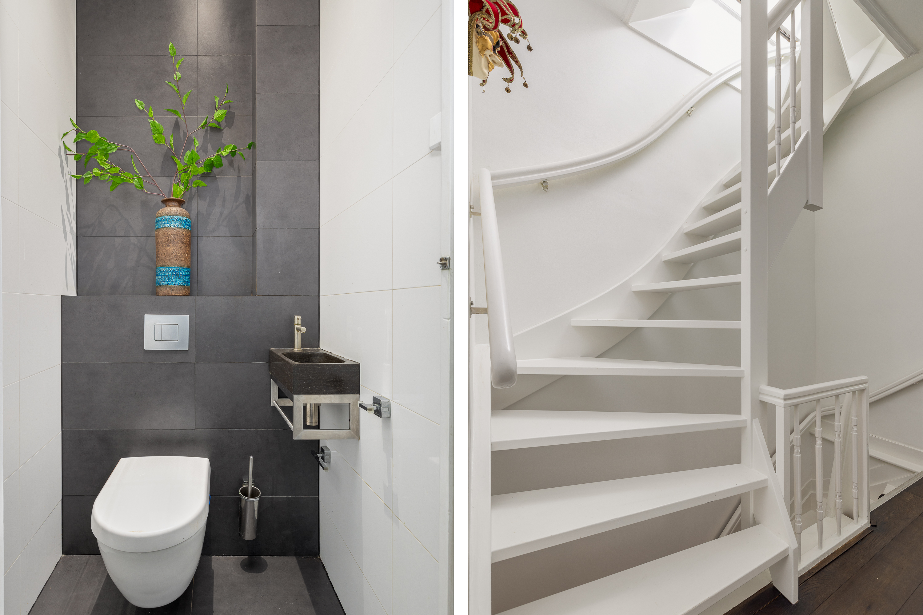 Eigen entree en opgang naar de tweede verdieping. Via de ruime overloop, waar zich tevens een inbouwkast bevindt, heeft u toegang tot de trap die u naar de entree van de woning op de tweede verdieping leidt