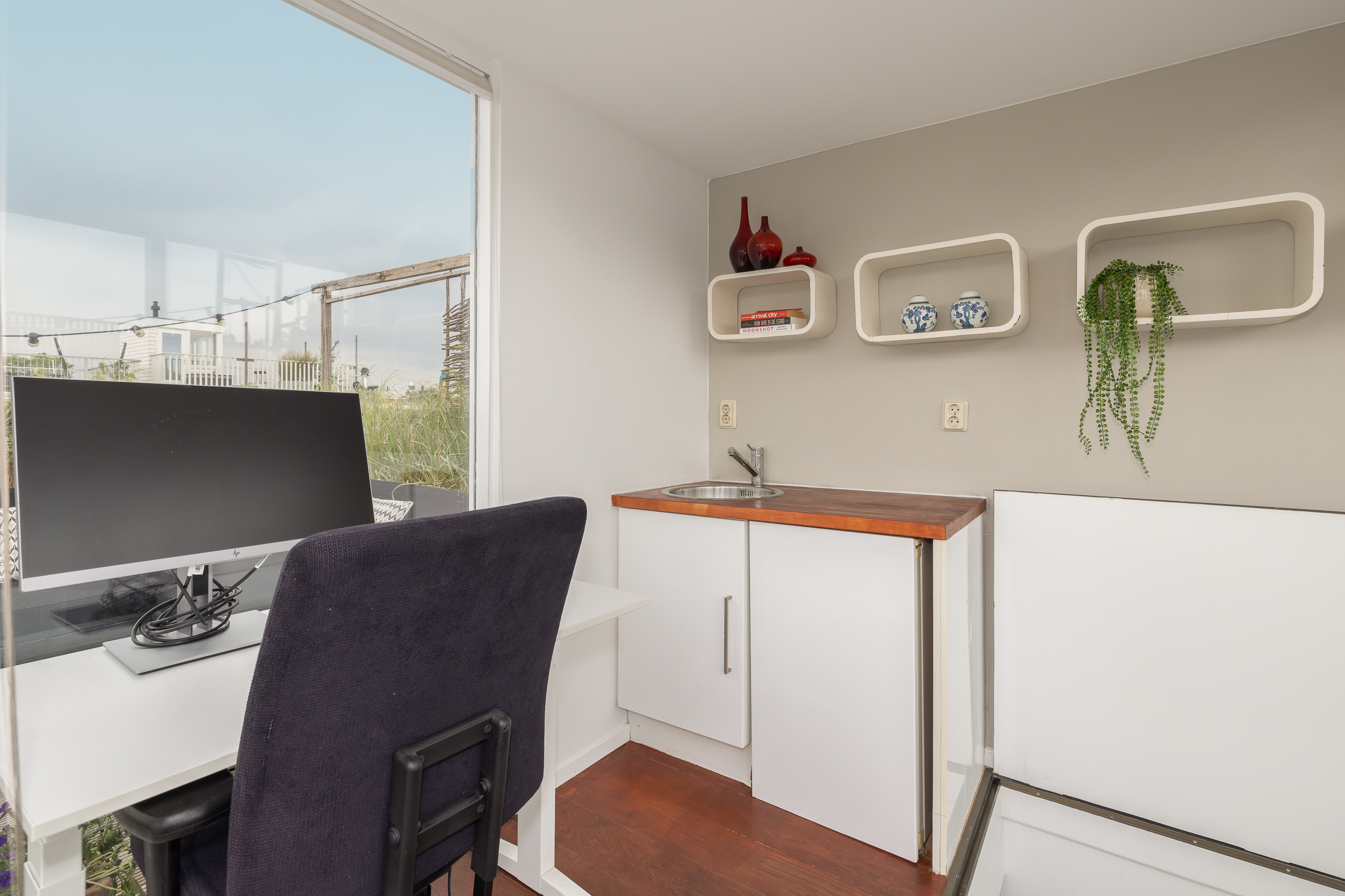 Hier krijgt u toegang tot het zeer ruime, gezellige en fraai afgewerkte dakterras. Op deze verdieping heeft u ook een wastafel en koeling tot uw beschikking. Handig is ook dat de toegang naar het dakhuis kan worden afgesloten, waardoor een fijne ruimte ontstaat van circa 6m². Kortom, genoeg ruimte voor het creëren van een home gym, bijvoorbeeld voor het beoefenen van yoga, of een heerlijke thuiswerkplek.