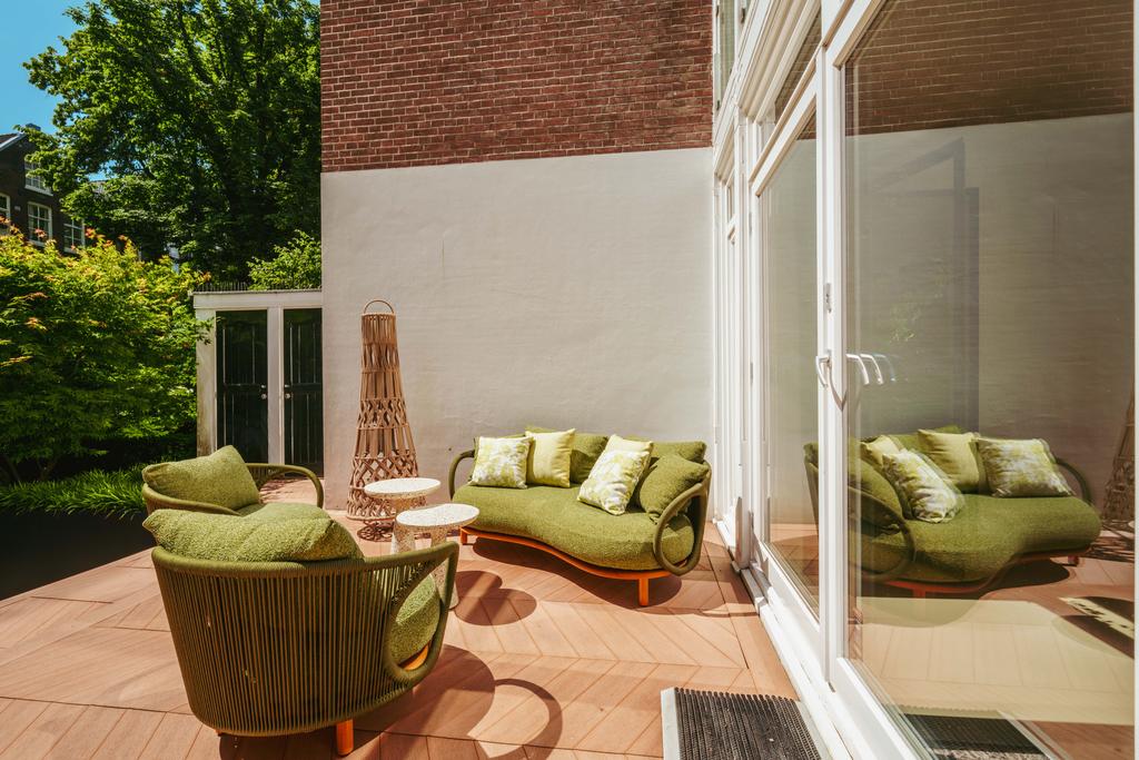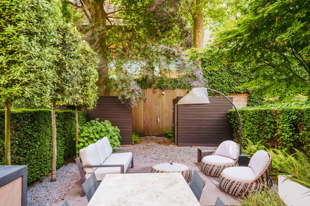 De woning is toegankelijk zowel vanaf de bel-etage als vanuit het souterrain, dat bereikbaar is via de trap of lift vanuit de hal of direct vanuit de bovengelegen eetkamer. Bij binnenkomst op deze verdieping treedt u de hal binnen, waar zich een separaat toilet bevindt. Aan de voorzijde ligt een slaapkamer met een en-suite badkamer, voorzien van een wastafel en douche. Deze multifunctionele ruimte wordt momenteel gebruikt als gym, maar is flexibel inzetbaar. De luxe uitgevoerde open woonkeuken bevindt zich aan de achterzijde en vormt het kloppend hart van deze verdieping. De keuken is uitgerust met hoogwaardige inbouwapparatuur van het merk Gaggenau, waaronder een koelkast, vriezer, Quooker, vijfpits gasfornuis geïntegreerd in het aanrecht, oven, stoomoven, vaatwasser en wijnklimaatkast. Het massief natuurstenen aanrechtblad in combinatie met het houten bargedeelte zorgt voor een warme, stijlvolle uitstraling. De keuken beschikt bovendien over bijzonder veel opbergruimte en is toegankelijk vanuit de eetkamer op de bel-etage of via openslaande deuren vanuit de hal. Een sfeervolle gashaard maakt de ruimte helemaal af. Aangrenzend aan de keuken bevindt zich een slaapkamer – momenteel in gebruik als werkkamer – die, net als de keuken, via openslaande deuren directe toegang biedt tot het ruime terras. Dit terras leidt via een trap naar de fraai aangelegde, op het zuiden gelegen achtertuin, die ook bereikbaar is via een achterom aan het Schapenburgerpad. Deze toegang biedt de zeldzame mogelijkheid om de achtertuin te betreden en bijvoorbeeld fietsen direct in de tuin te plaatsen, uniek in het centrum van Amsterdam. De tuin, onder architectuur aangelegd door Erik van Gelder, beschikt over een complete buitenkeuken, ideaal voor lange zomeravonden, en is ook voorzien van een vrijstaande berging. Hier geniet u in alle rust van zon en privacy, tot in de late uurtjes.