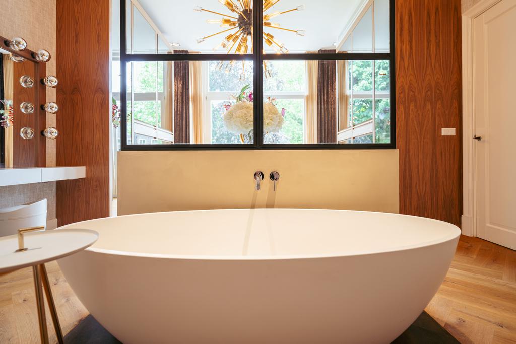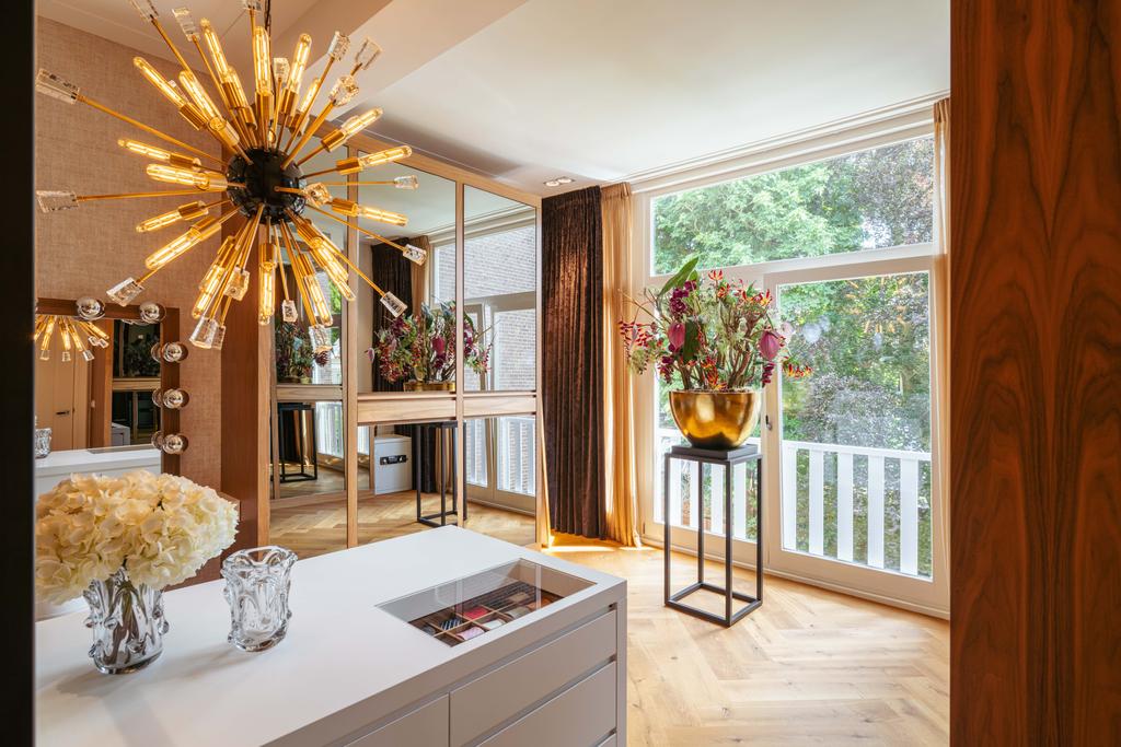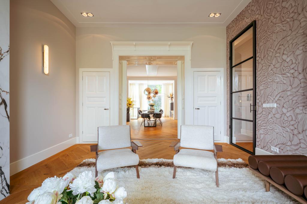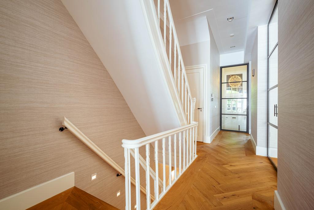 De gehele verdieping is hoogwaardig afgewerkt met stijlvol en sfeervol behang, wat de ruimte warmte en karakter geeft. Grote raampartijen aan beide zijden van de verdieping zorgen voor een uitzonderlijke hoeveelheid daglicht en benadrukken de ruimtelijkheid en luxe van het geheel.