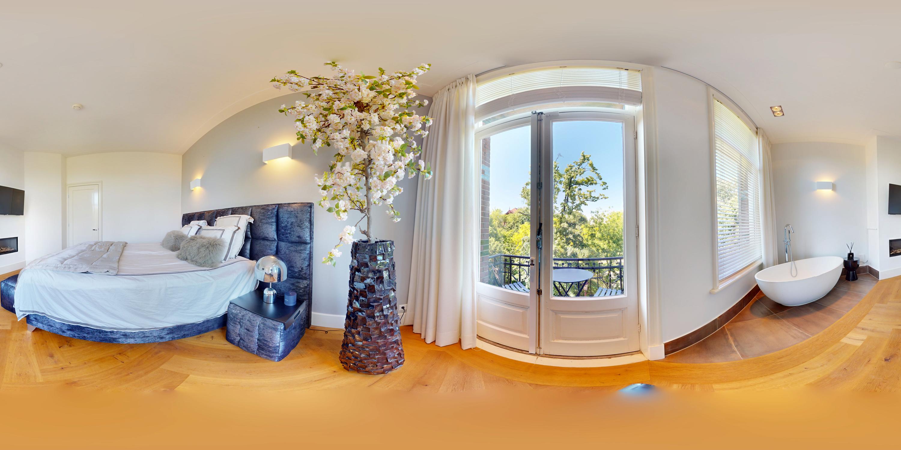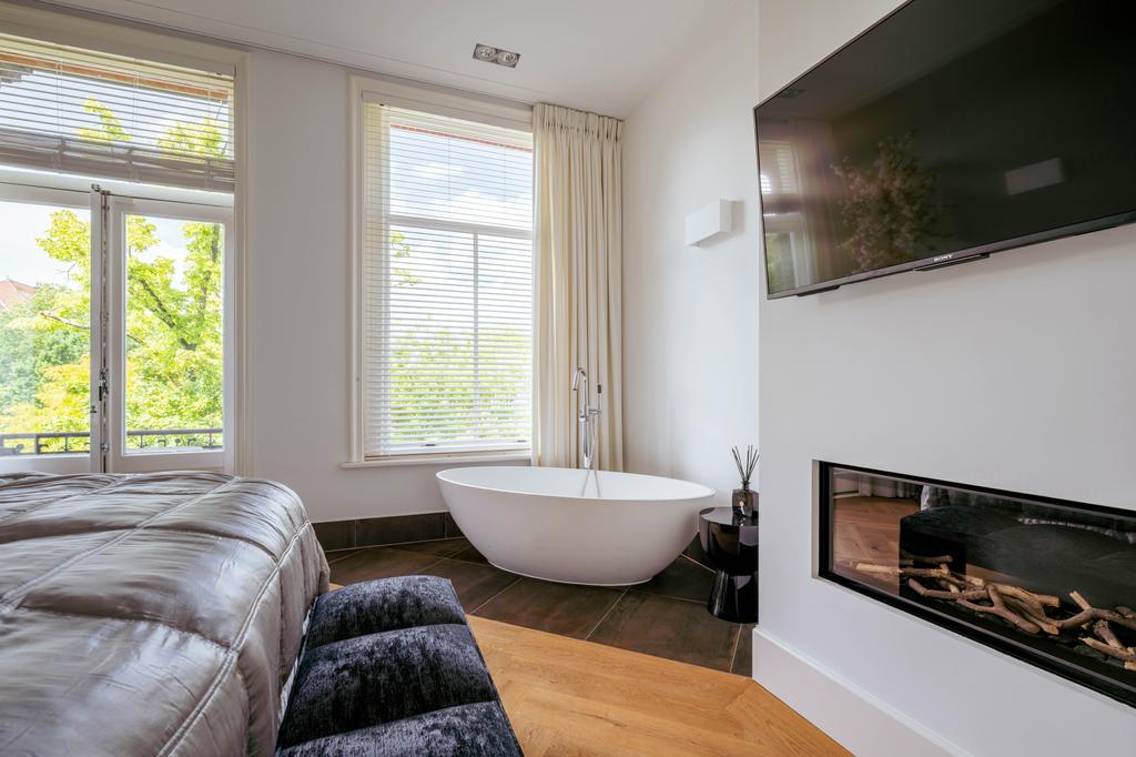 Via de trap of lift bereikt u de overloop die toegang biedt tot alle vertrekken op deze verdieping. Aan de achterzijde bevindt zich de bijzonder ruime master bedroom, met een stijlvolle indeling waarbij een glazen wand een subtiele scheiding vormt tussen het slaapgedeelte, het badgedeelte en de kleedruimte. De kamer is voorzien van ingebouwde kasten, een vrijstaand ligbad en openslaande deuren die uitzicht bieden op de fraai aangelegde tuin. Eveneens aan de achterzijde bevindt zich een moderne badkamer, uitgerust met een dubbele wastafel, een ruim opgezette inloopdouche en een toilet. Aan de voorzijde vindt u een tweede, royaal bemeten slaapkamer, compleet met een sfeervolle gashaard en een vrijstaand ligbad. Ook deze kamer beschikt over openslaande deuren naar een balkon met adembenemend uitzicht over het Vondelpark. Aangrenzend aan deze kamer, een tweede badkamer voorzien van douche en wastafel. Daarnaast is er nog een derde slaapkamer, bereikbaar via de hal met sfeervolle loggia te bereiken middels openslaande deuren.