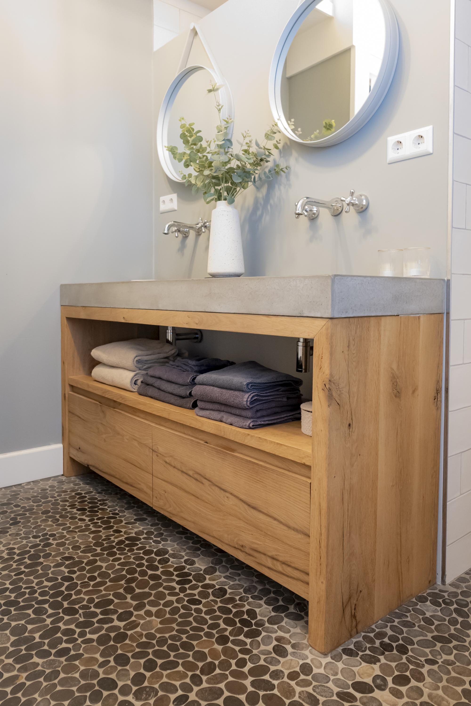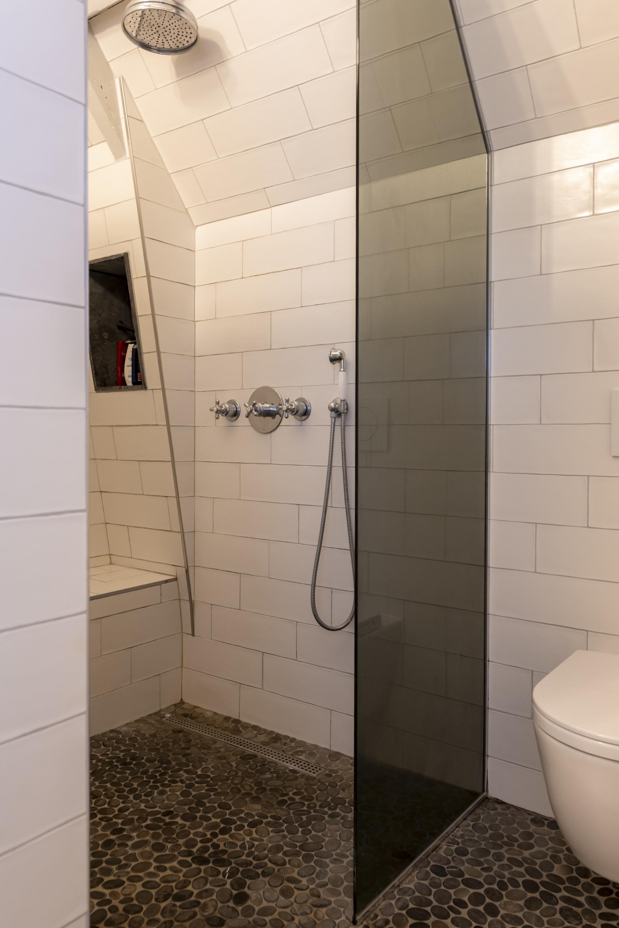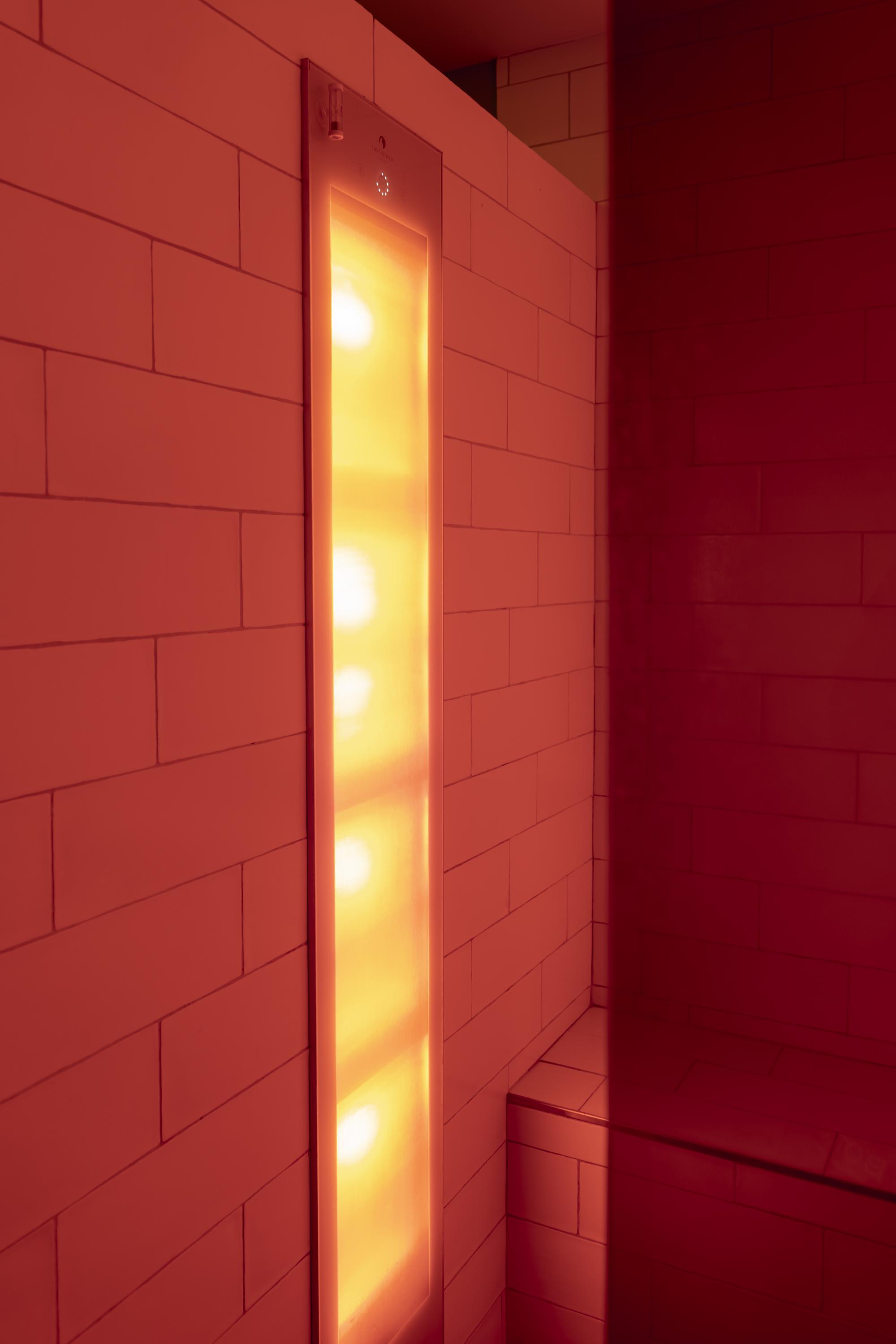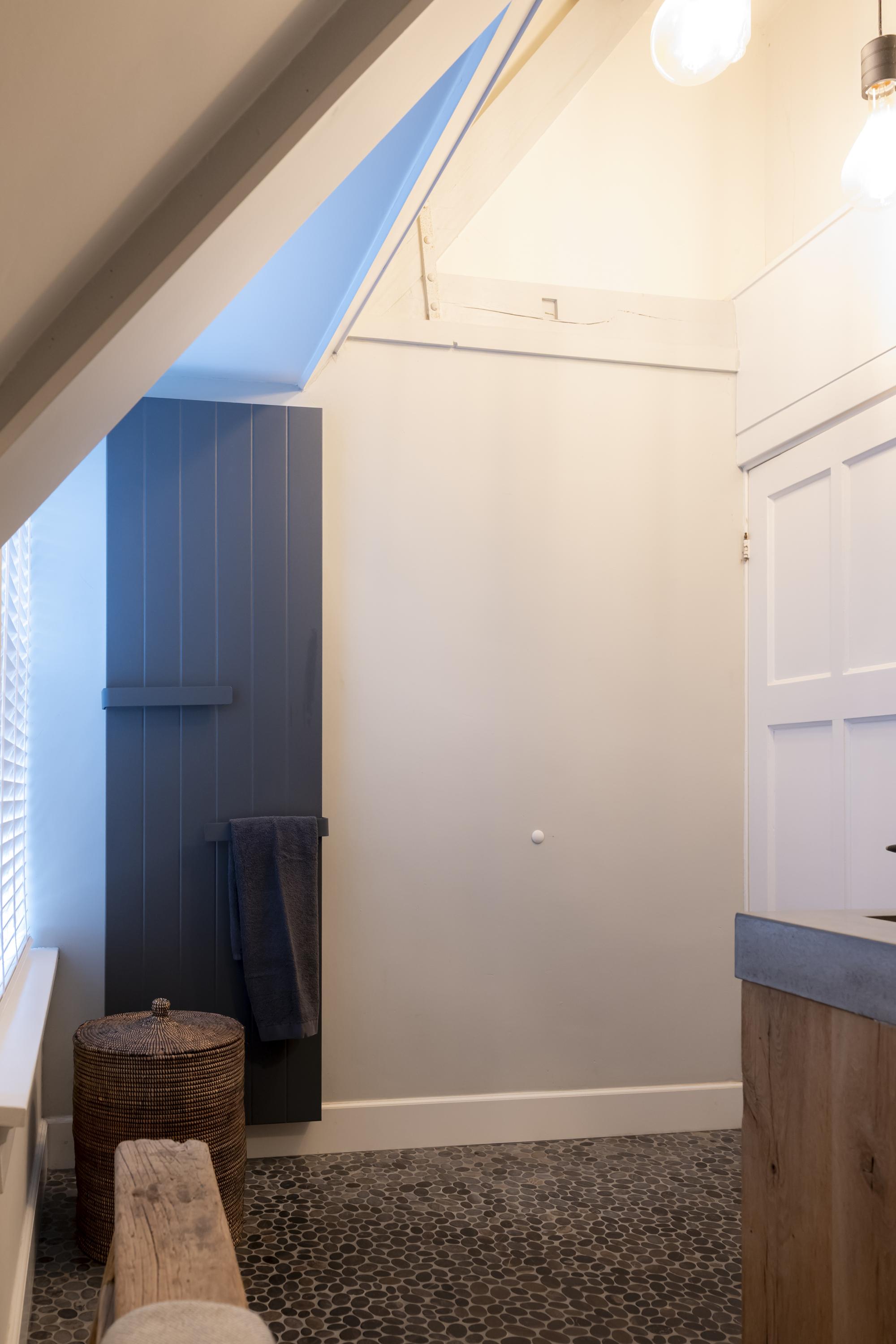 Overloop met toegang tot drie ruime slaapkamers, allen geschikt voor een tweepersoonsbed. De moderne badkamer is stijlvol uitgevoerd en voorzien van een inloopdouche met stort- en handdouche, met een ingebouwde infrarood- en zonnebankfunctie in de douchewand, een dubbel wastafelmeubel en een wandhangend toilet.