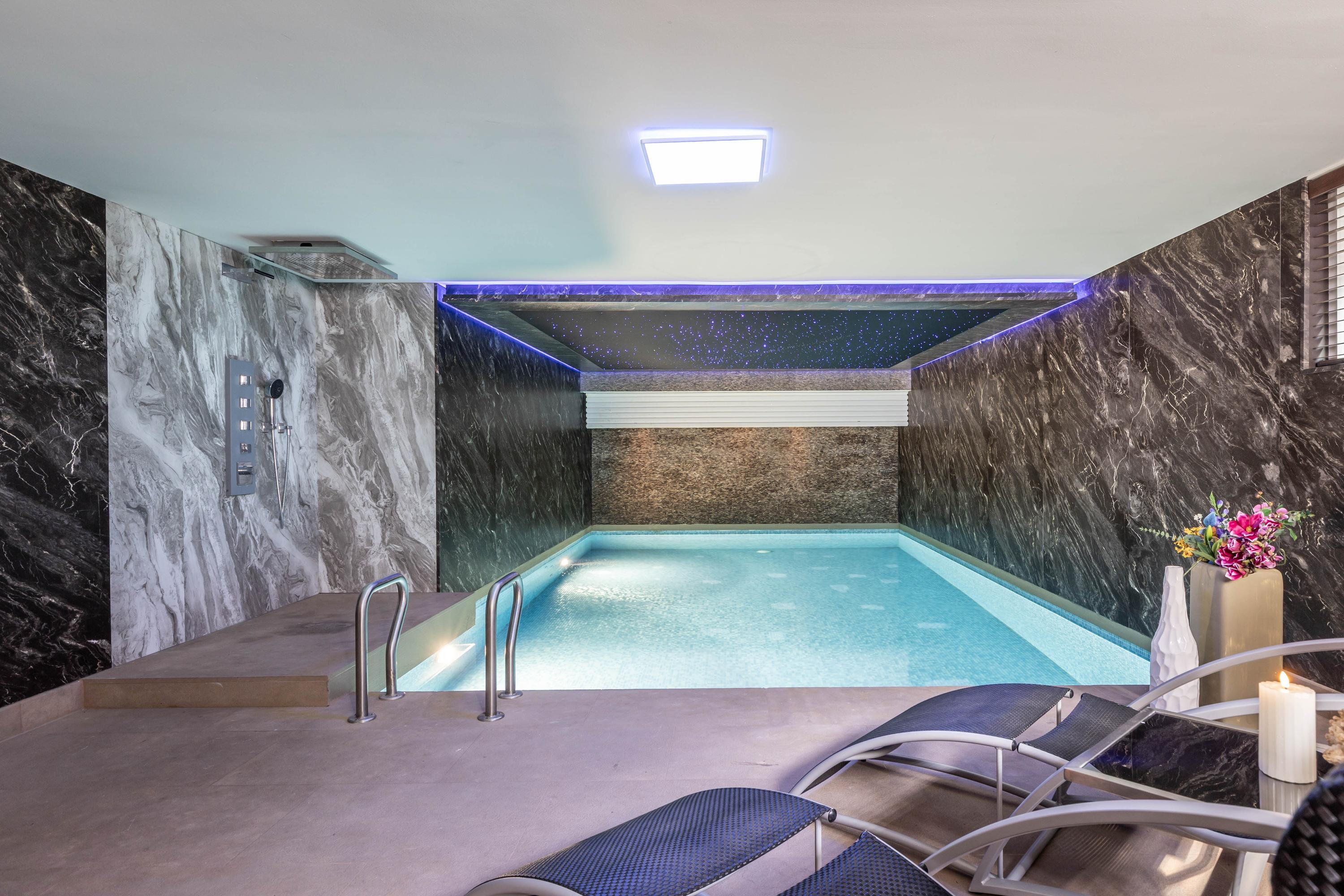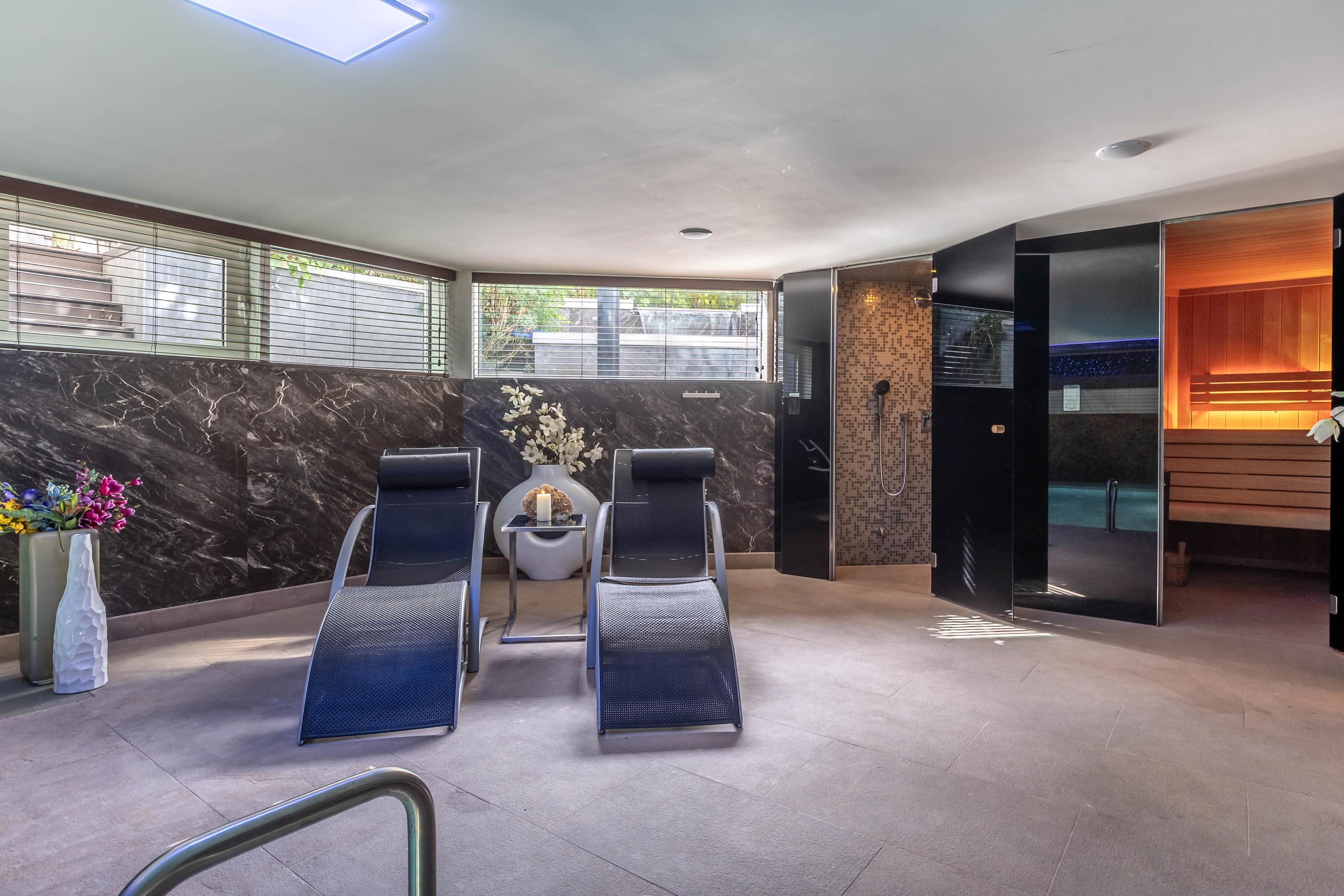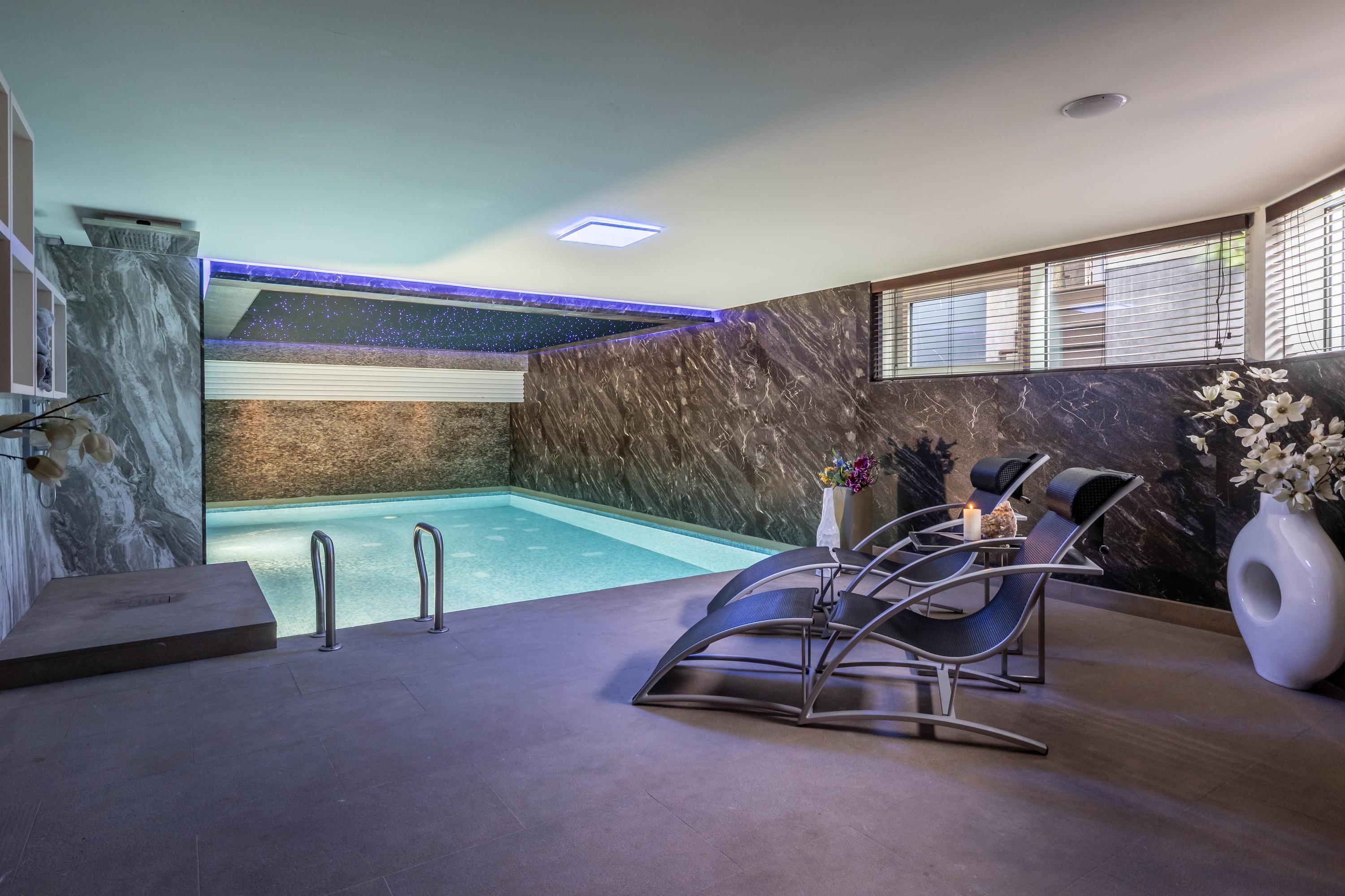 In het souterrain bevindt zich een wellnessruimte van uitzonderlijke allure. Een verwarmd zwembad met solardek en tegenstroominstallatie vormt het hart van deze ontspanningszone. Achter rookglazendeuren vindt u een Hamam, sauna, douche en kleedruimte, waardoor een gevoel van ultiem comfort en beslotenheid ontstaat. Het zwembad is volledig geautomatiseerd, verwarmd met een eigen cv-ketel en voorzien van moderne filterinstallatie en ontvochtiger.