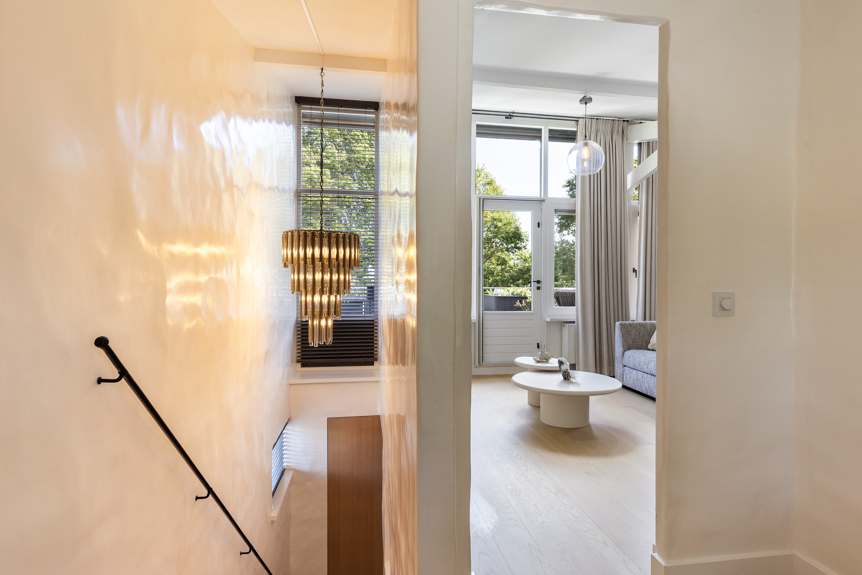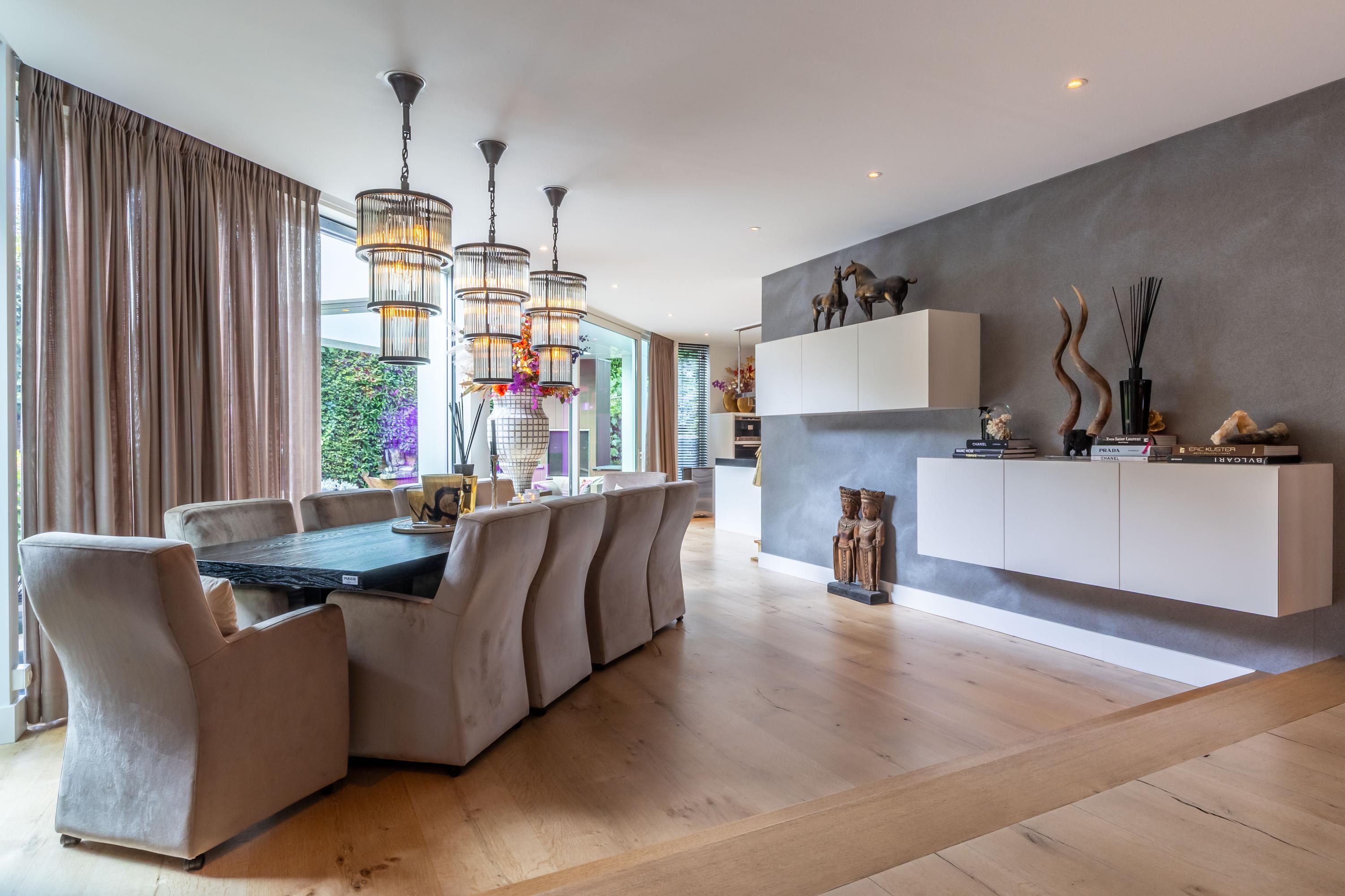 De living ademt rustige luxe, met een sfeervolle gashaard, maatwerkkasten en een geïntegreerde televisieopstelling. Grote raampartijen verbinden het interieur naadloos met de tuin; het lichtspel in huis is spectaculair.
