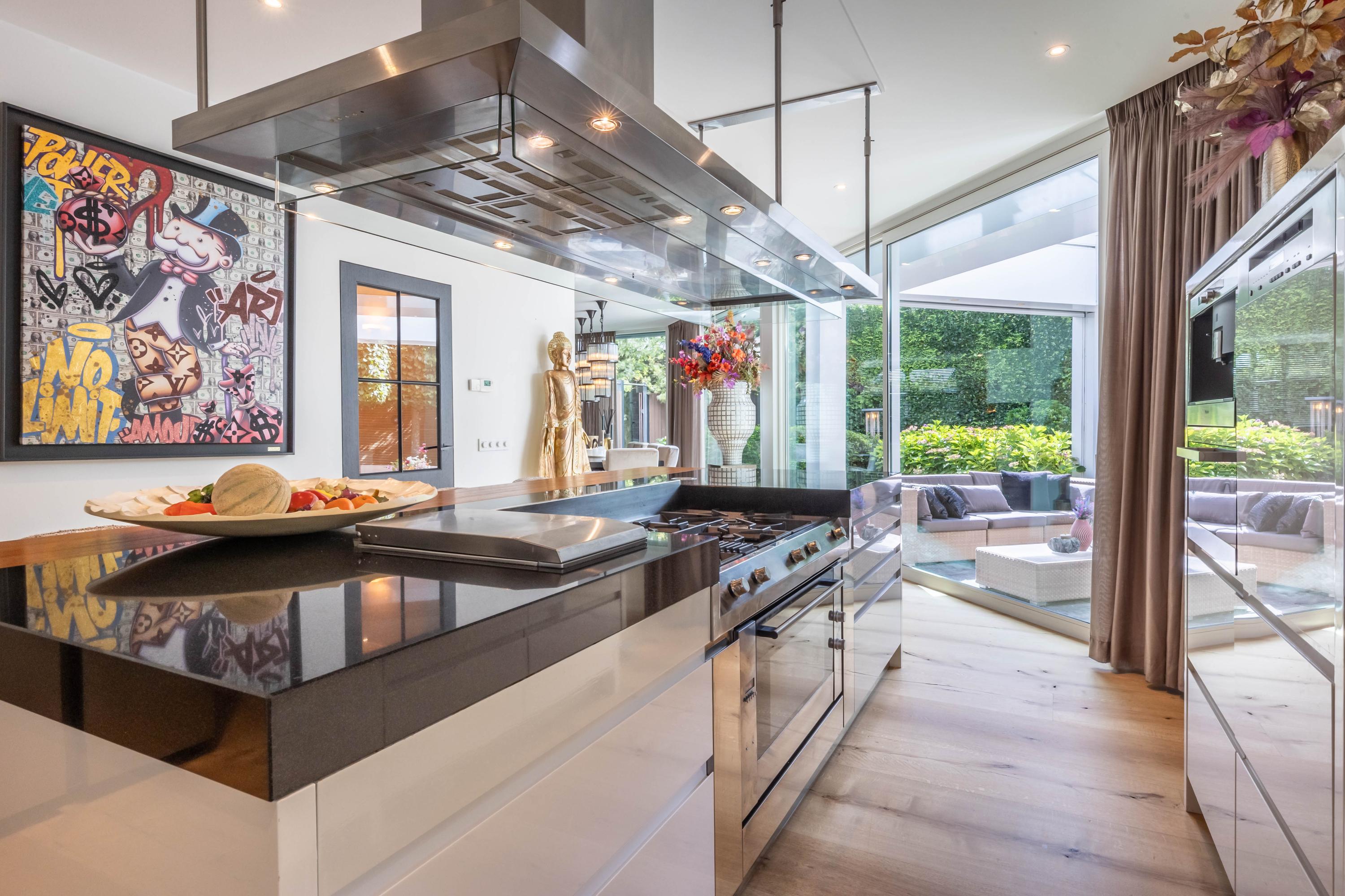 Het hart van het huis wordt gevormd door de ruime designkeuken van Arclinea met een granieten aanrechtbladen en een sculpturaal kookeiland met bar. Hierin is alle denkbare inbouwapparatuur: een vijf-pits kookplaat met wokbrander en een separate teppanyaki grill, een op maat gemaakt afzuigsysteem, een Quooker en een traditionele kraan, koffiemachine, 2 warmhoudlades, een bordenwarmer, vaatwasser op hoogte, een magnetron, combi-stoomoven en een hogedrukstoomoven. Alles is ontworpen om koken tot een verfijnde belevenis te maken.