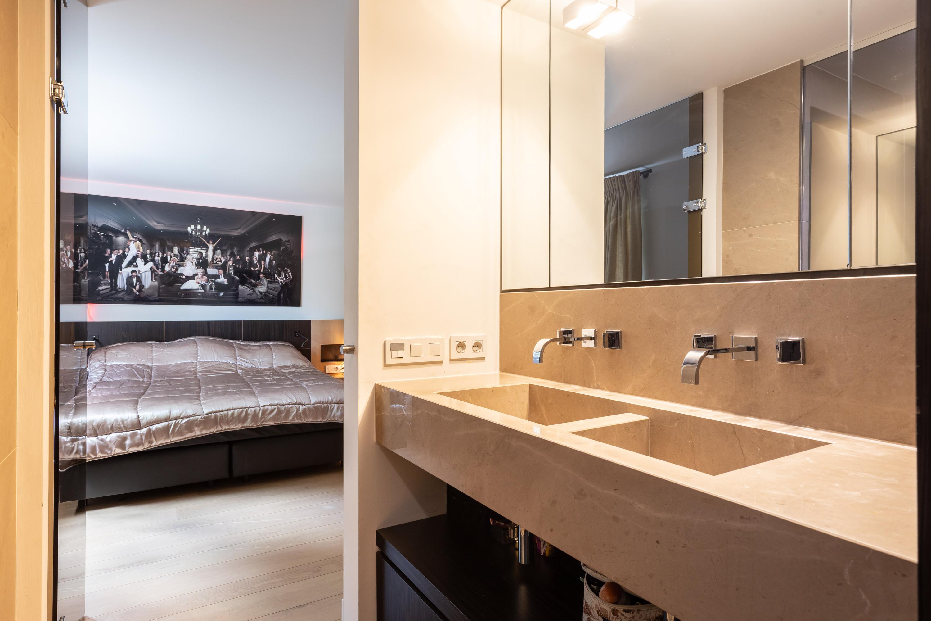 Door de split-level indeling heeft de woning unieke zichtlijnen. De masterbedroom heeft een ruime inloopkast en een badkamer en suite met dubbele wastafelmeubel met italiaans marmer, wandtoilet, bidet en een inloopdouche.