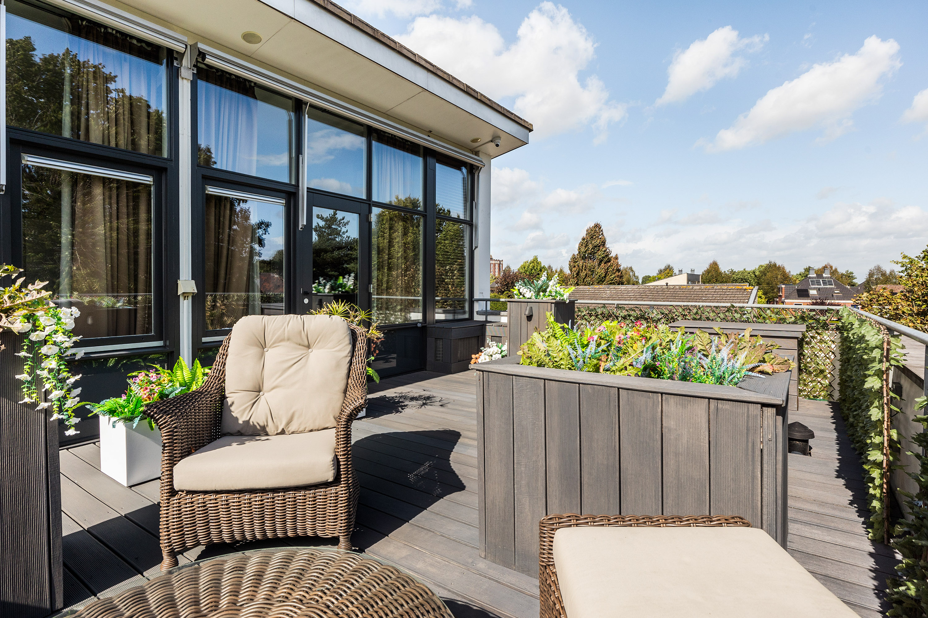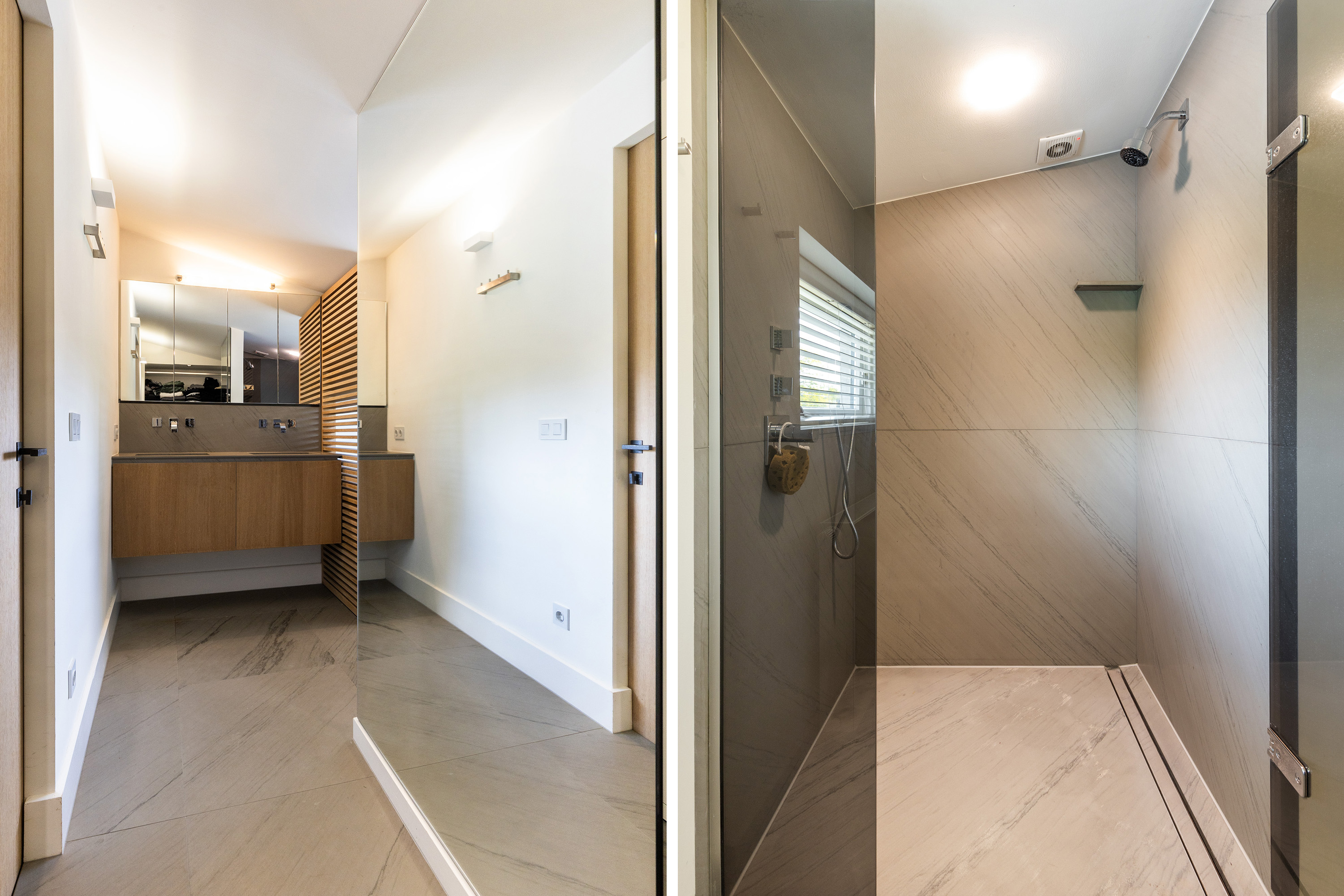Drie grote slaapkamers bieden eveneens luxe maatwerk; één ervan heeft toegang tot een eigen dakterras. Op de overloop is een tweede badkamer met dubbele wastafel, inloopdouche, bidet en apart toilet.