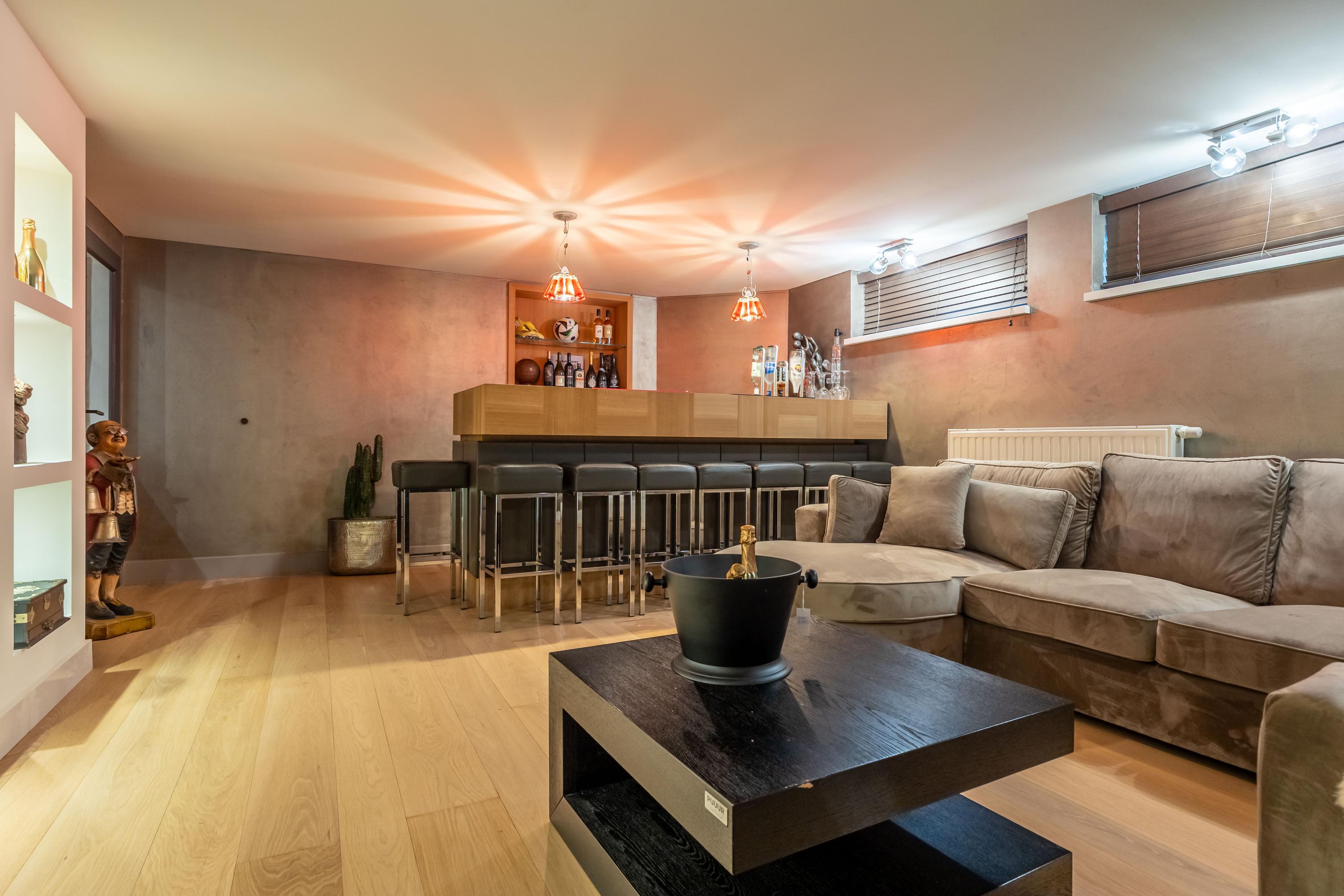 Aansluitend is er een stijlvolle bar, ideaal voor ontspanning of het ontvangen van gasten. Daarnaast vindt u hier een complete verblijfsruimte voor een au pair of gasten, met daglichttoetreding via lichtkoepels, en een royale inpandige garage met coatingvloer en elektrisch bedienbare Hörmann-deur.