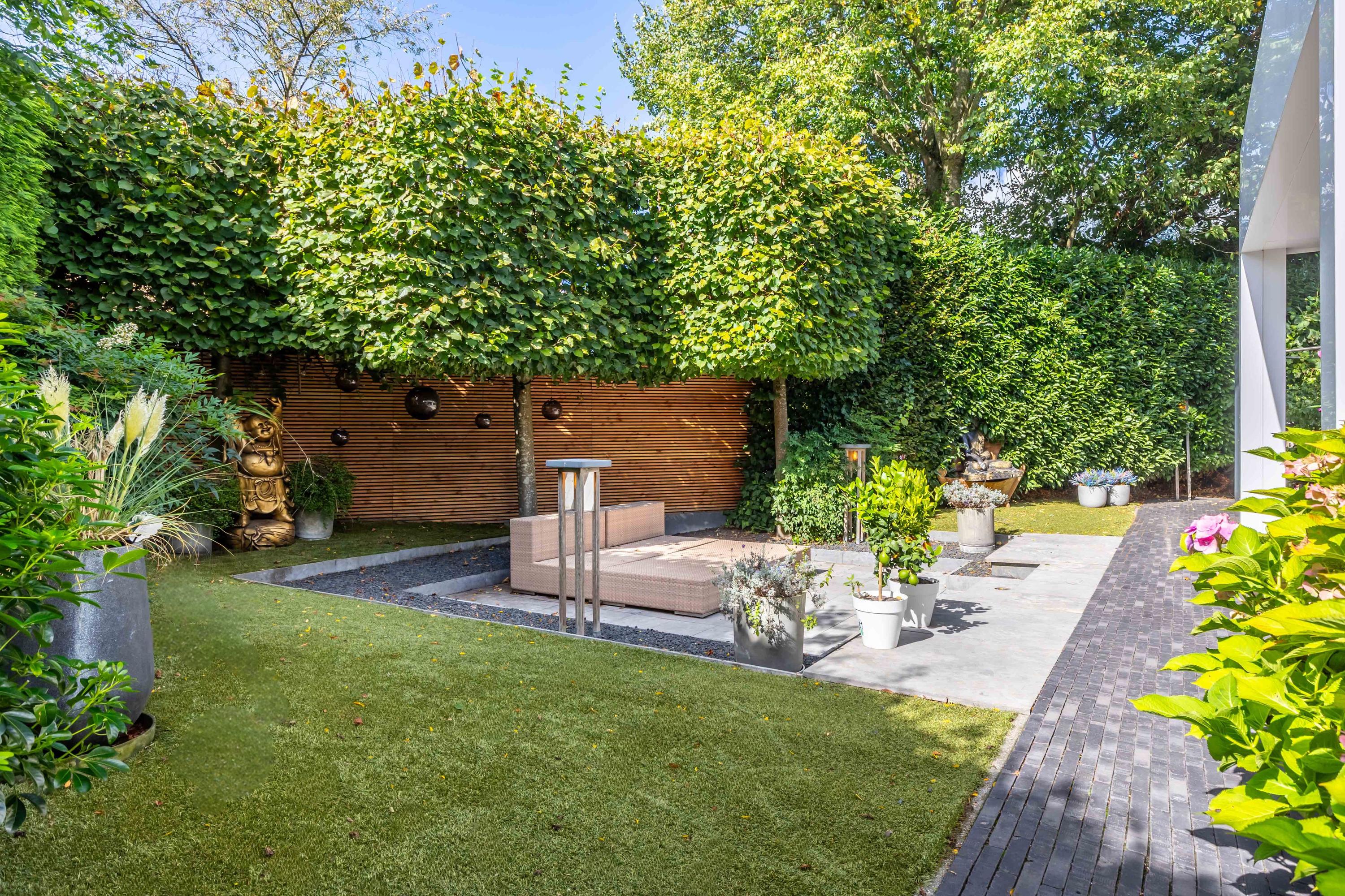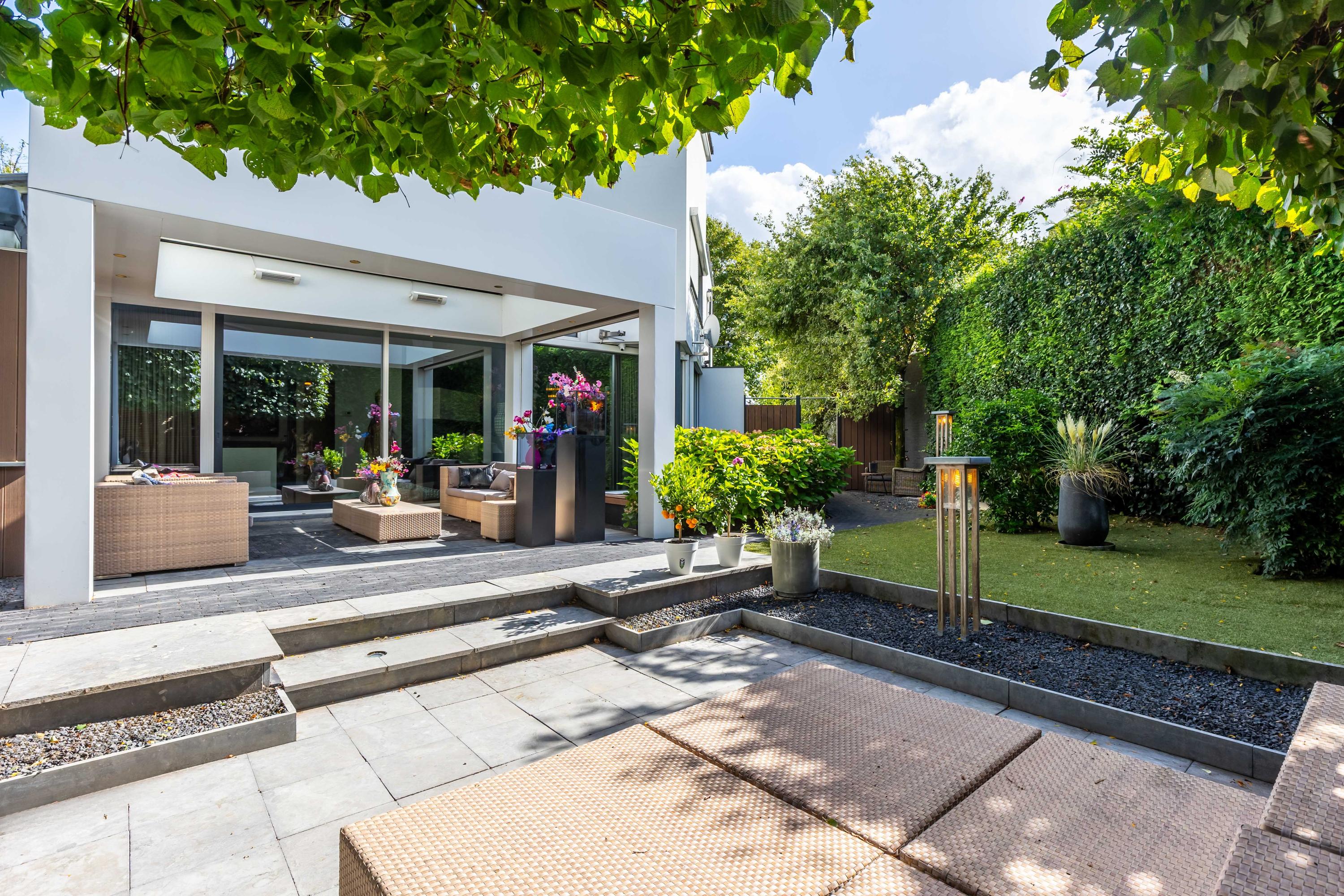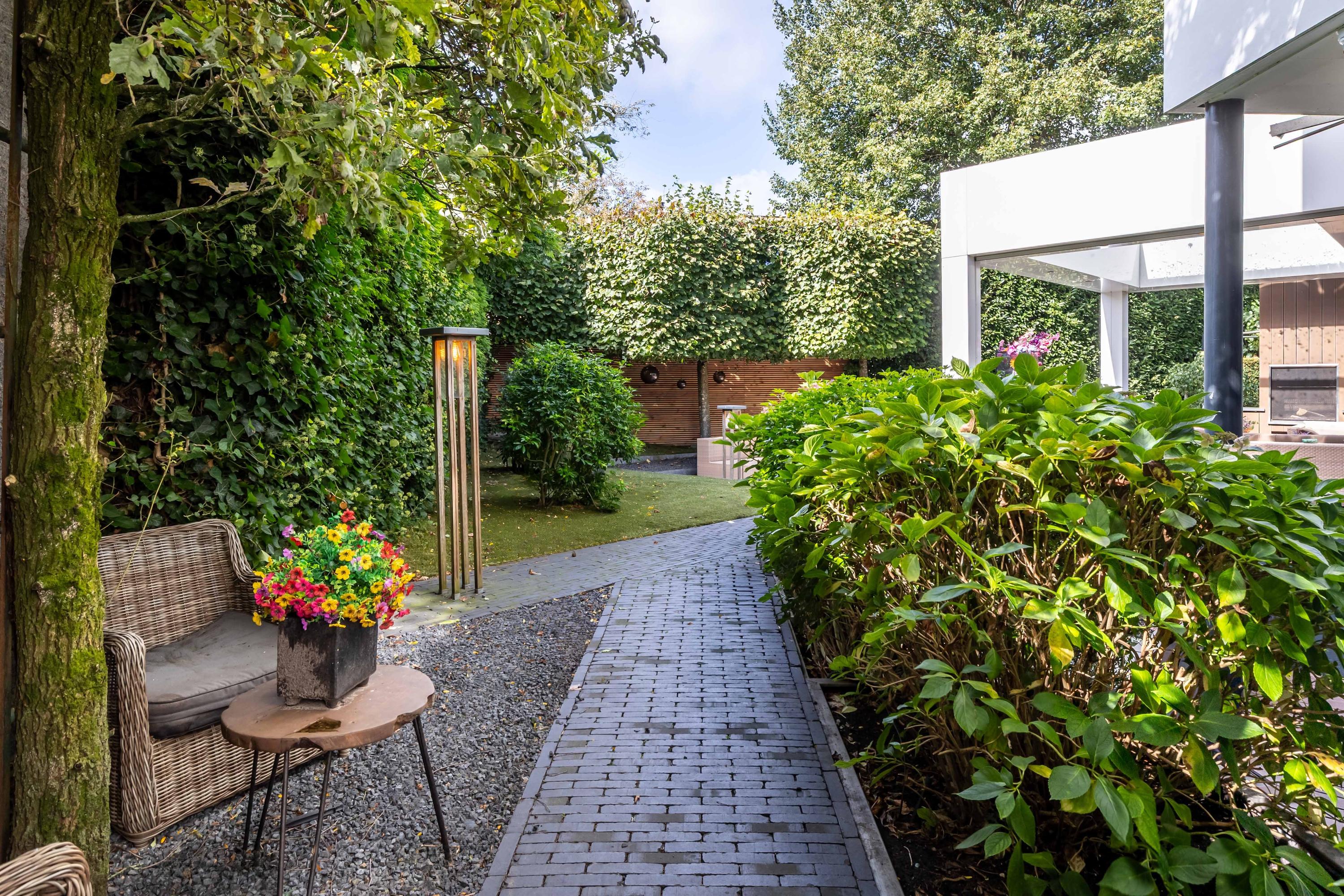 De in 2025 opnieuw aangelegde tuin is een oase van privacy en groen, gunstig gelegen op het zuidwesten. Meerdere terrassen bieden steeds een andere sfeerbeleving. De veranda is uitgevoerd met een riant hoog plafond waarin een grote lichtstraat is opgenomen. Het terras onder de veranda is daardoor aangenaam licht. Door de voorzieningen kunt u hier aangenaam in alle jaargetijden van de buitenruimte genieten met de sfeervolle open haard, een heater en windscreen. De twee balkons bieden besloten plekken om te ontspannen. De tuin beschikt over automatische beregening en is ideaal voor barbecues of lange zomeravonden.