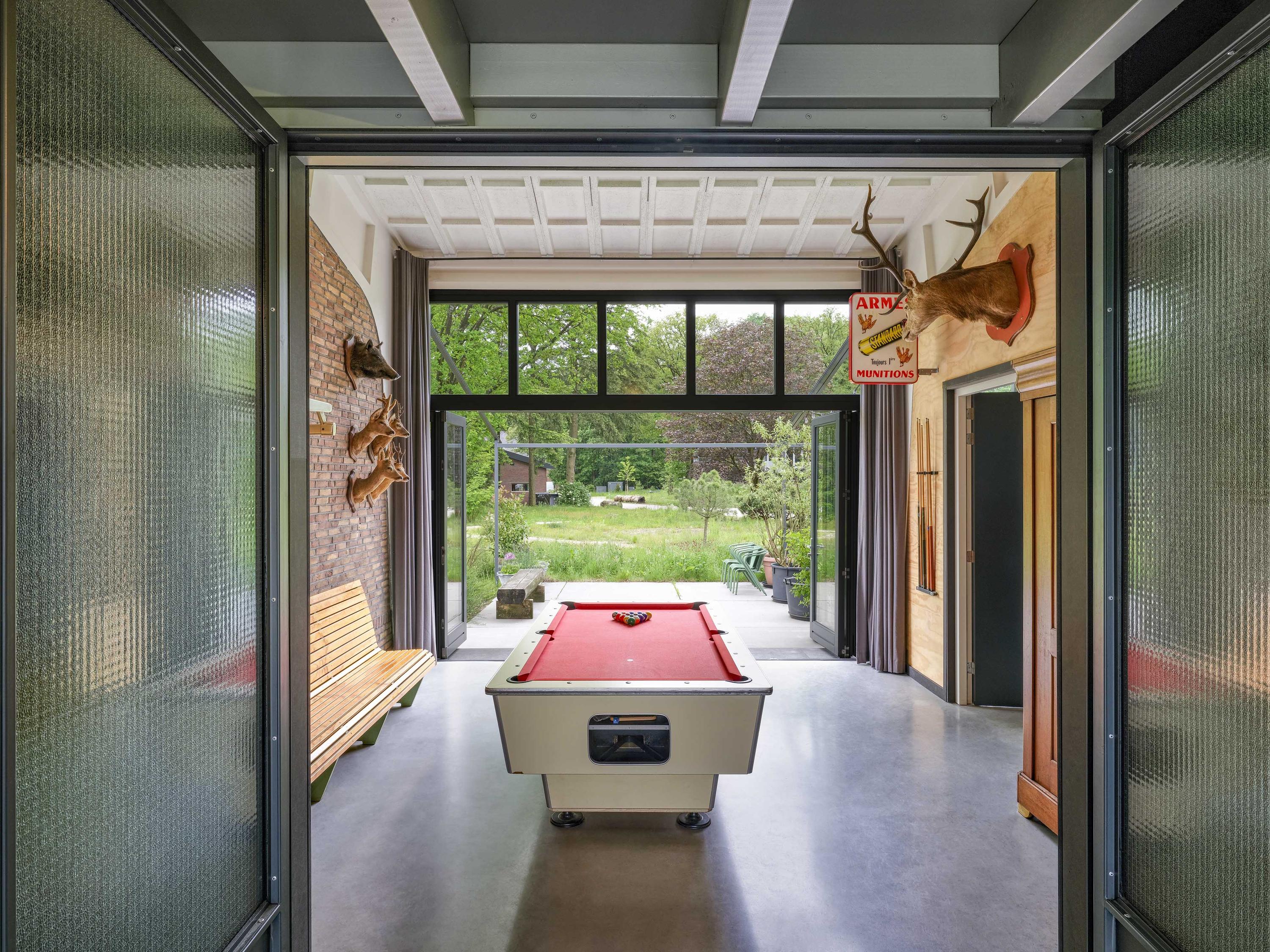 Entree, ruime hal met zicht op de vide. Deze ruimte is met het biljart in gebruik als hobbyruimte met terrasdeuren die geheel opengeschoven kunnen worden naar het terras. Dubbele stalen deuren bieden toegang tot de woonkeuken als ‘het kloppend hart’ van het huis. Het modern vormgegeven kookeiland met marmeren aanrecht staat centraal in de ruimte. Zodra de terrasdeuren over de gehele breedte zijn geopend is heerlijk om in de ochtend te genieten van de ochtendzon en het buitenleven met vrij zicht over een open veld. In combinatie met de groene kleurstelling van de keuken en de muur die tot aan het plafond is getegeld met Marrokkaanse tegeltjes is een geraffineerde mix van luxe materialen en sfeer ontstaan. Uiteraard is de keuken voorzien van de benodigde inbouwapparatuur. Een grote berging/bijkeuken doet dienst als provisieruimte en was- en linnenruimte. Een houten trap brengt u naar de woonkamer met ramen en deuren naar de vloer met vrij uitzicht over de natuur aan de zuidzijde van het huis. Een trap brengt u een niveau lager naar een gang met kledingkasten waaraan de slaapvertrekken en de badkamer zijn gesitueerd. 3 Ruime slaapkamers zijn voorzien van terrasdeuren naar het naastgelegen terras. Een luxe badkamer is gerealiseerd met ligbad, douche, toilet en een wastafel voor 2 personen. Een trap brengt u naar de 4e slaapkamer aan de zuidzijde van het huis. Deze kamer is voorzien van een wastafel. Omdat overal de ramen en deuren van glas tot de vloer doorlopen staat u in direct contact met de natuur. Vanuit de keuken is een vaste trap naar de vide.