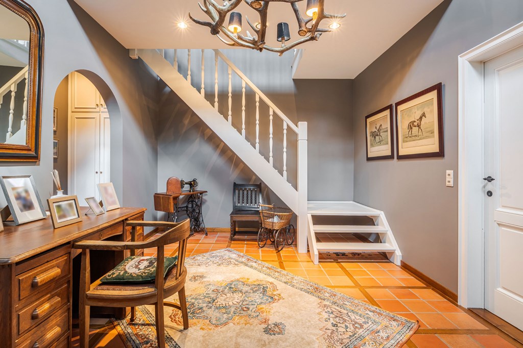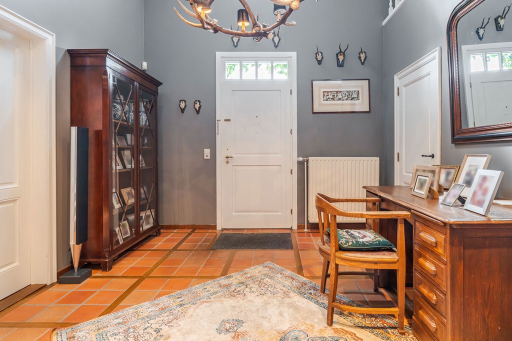 Middels de keurig aangelegde voortuin met een ruime oprit en een elektrisch bedienbare toegangspoort bereikt u de entree van de woning. Bij binnenkomst is direct duidelijk dat de landelijke stijl binnen is doorgetrokken. Dit is een huis met karakter. De hal is voorzien van een toiletruimte, een meterkast, een vestiaire, een trapopgang voor toegang tot de verdieping en biedt toegang tot zowel de werkkamer als de woonkamer.