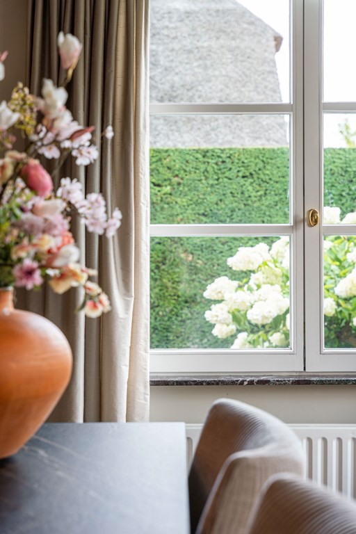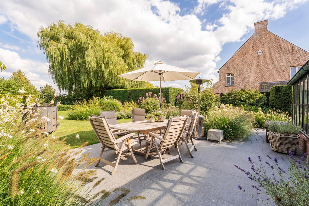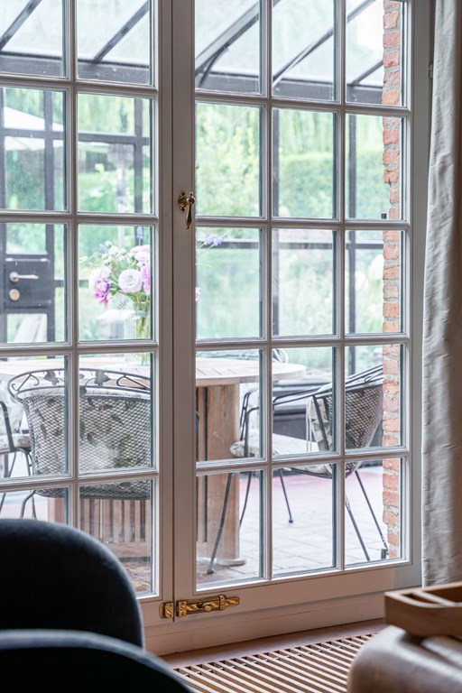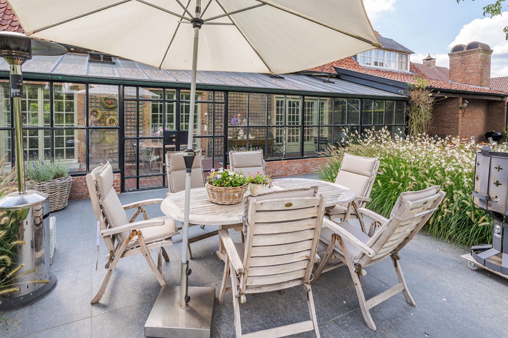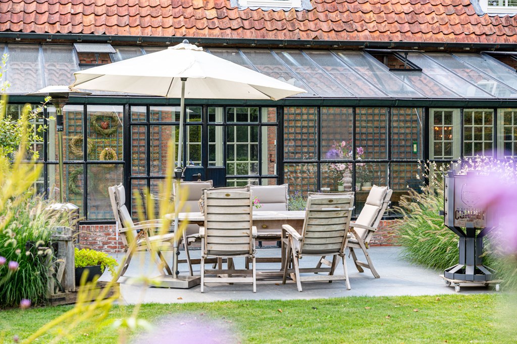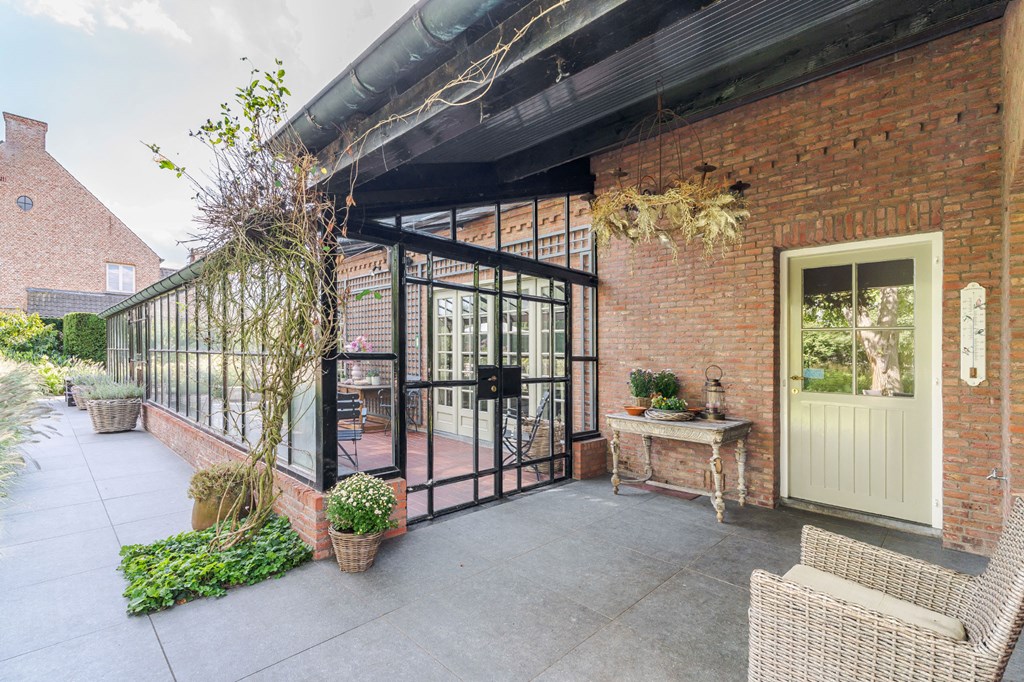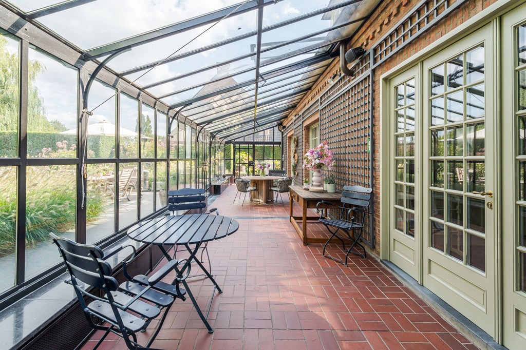 De door Luc D’Hulst gebouwde zwarte stalen serre is de natuurlijke schakel tussen het binnen-en buitenleven. De serre is voorzien van elektra en verwarming en daardoor het gehele jaar te gebruiken. Het is de ideale plek om de dag te beginnen met een kopje koffie en de krant, of om de dag te eindigen met een glas wijn en een goed boek.