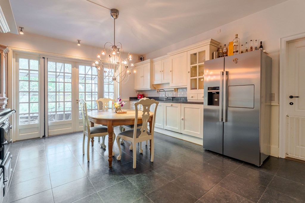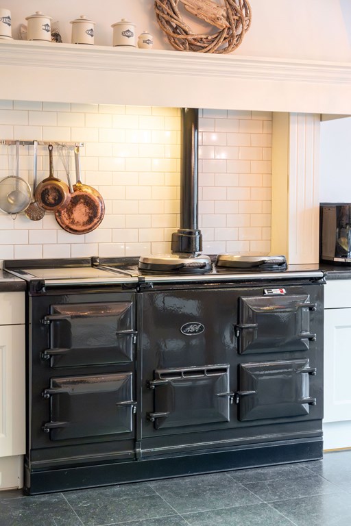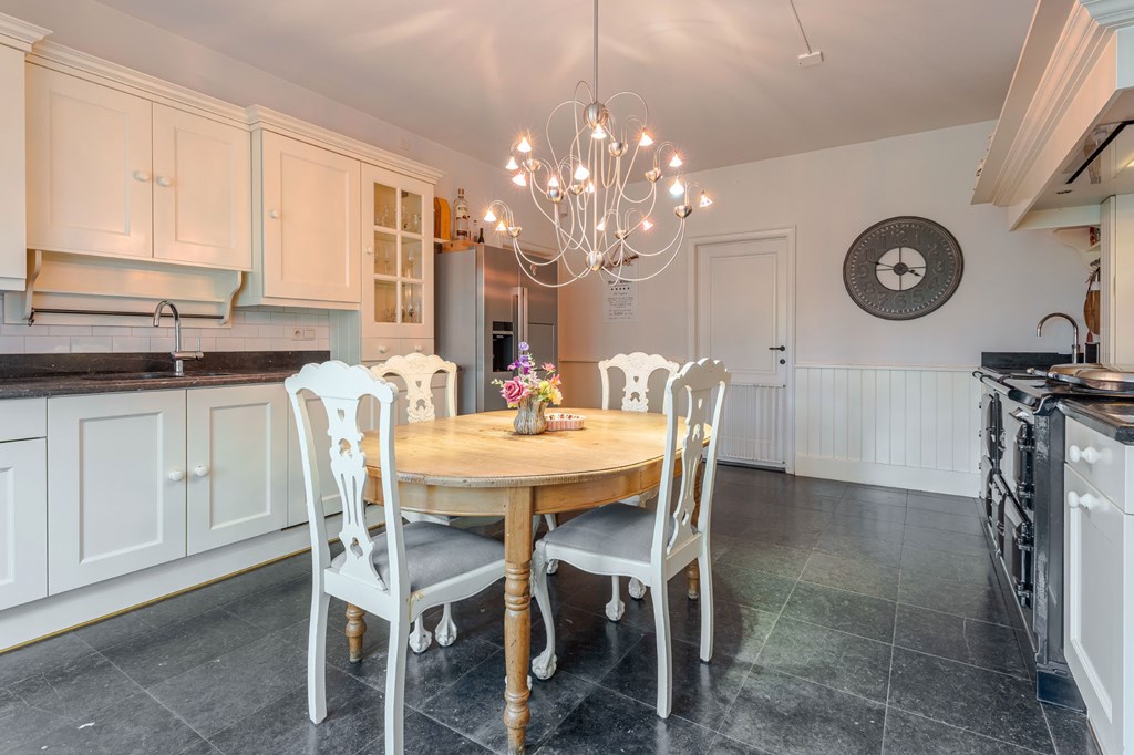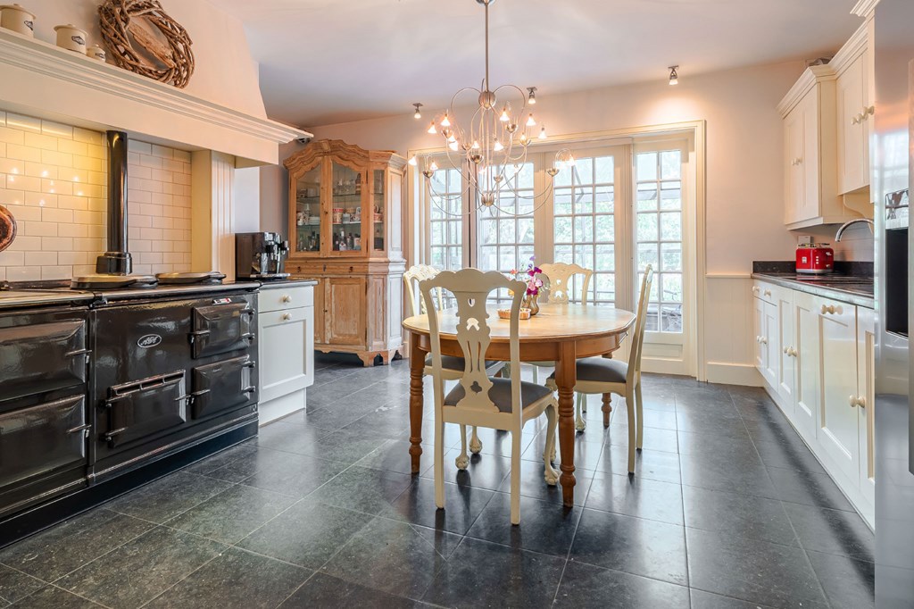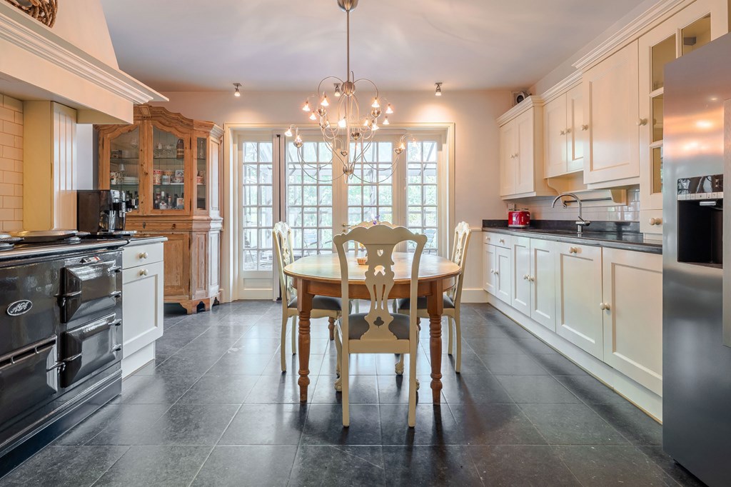 De landelijk uitgevoerde keuken is geplaatst in een rechte opstelling met aan twee kanten gepolijste natuurstenen werkbladen. Een echte eyecatcher is het centraal geplaatste AGA-fornuis. Mensen die met een AGA hebben gekookt willen vaak niets anders meer. Het is zowel een duurzaam als veelzijdig fornuis dat goed past bij een groot familiehuis. Verder is de keuken voorzien van twee spoelbakken, een Quooker, een vaatwasser en een Amerikaanse ijskast.