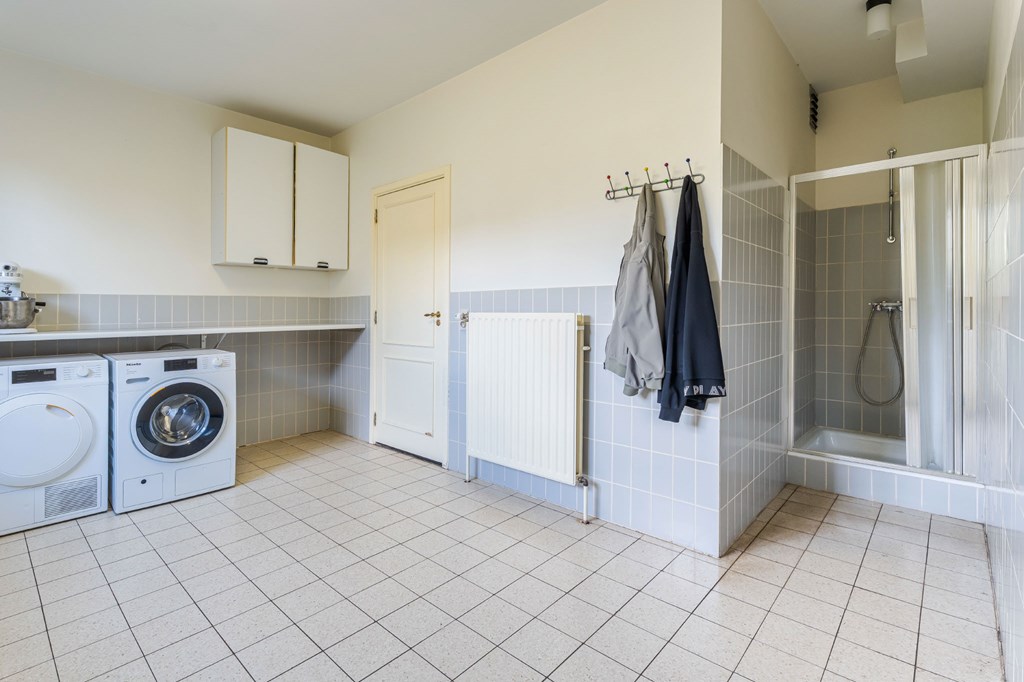 De ruime bijkeuken is voorzien van een extra werkblad met gootsteen, aansluitingen voor de wasmachine en droogkast, een douchcabine biedt direct toegang tot de garage.