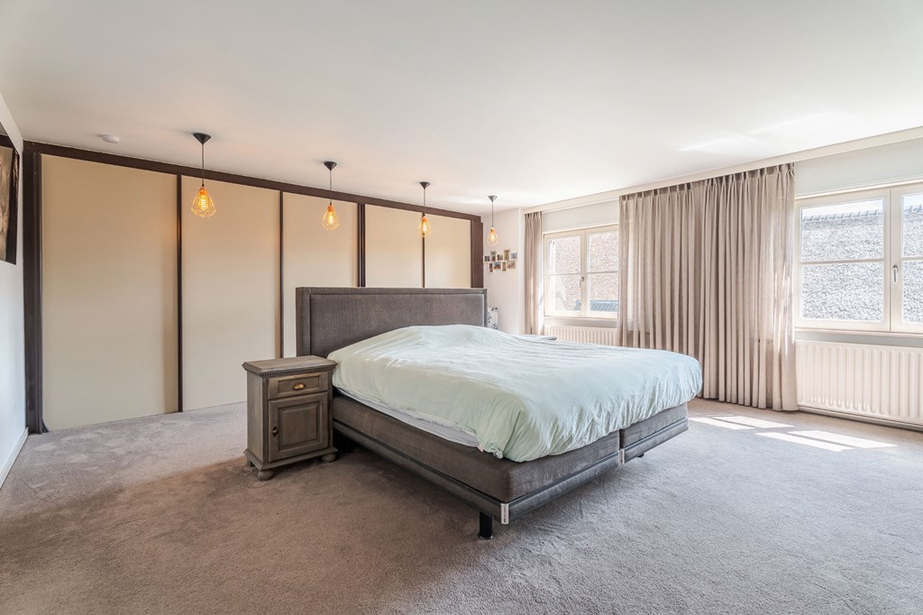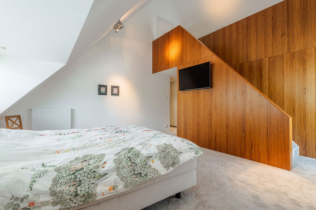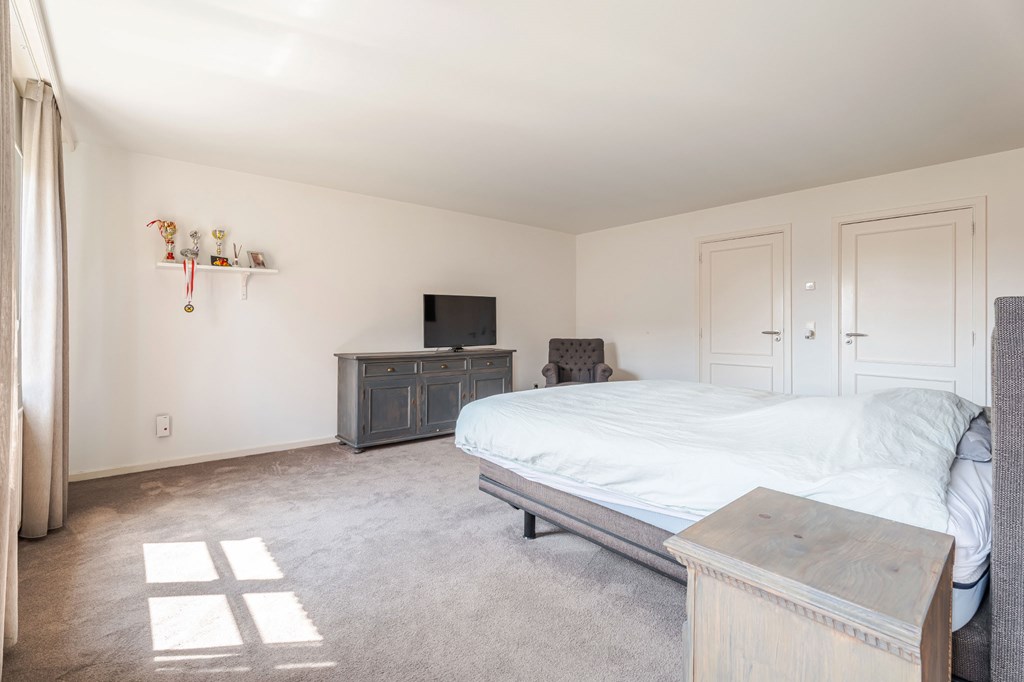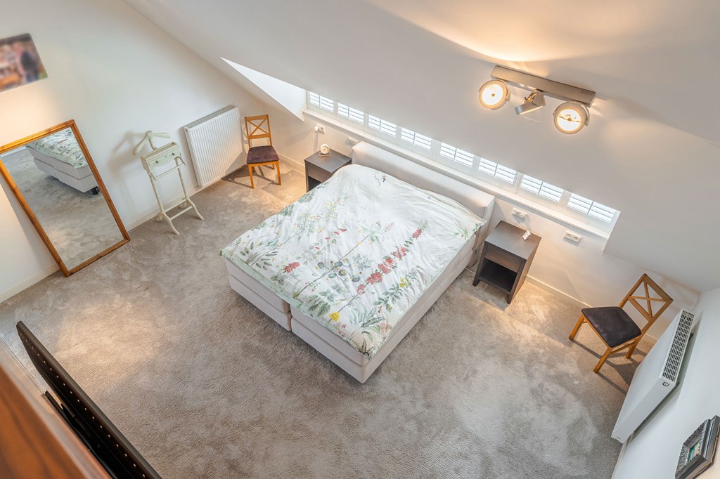 Slaapkamer 1 (master suite): Deze kamer heeft werkelijk alles wat u nodig heeft. De master suite is met een glazendeur af te sluiten van de overloop. Vanuit de slaapkamer heeft u een mooi uitzicht over de tuin. De kledingkamer is voorzien van handgemaakte notenhouten kasten met fijne verlichting.