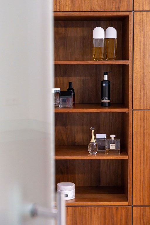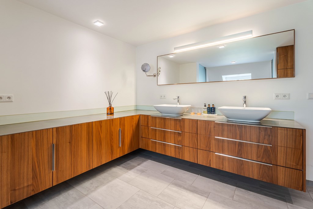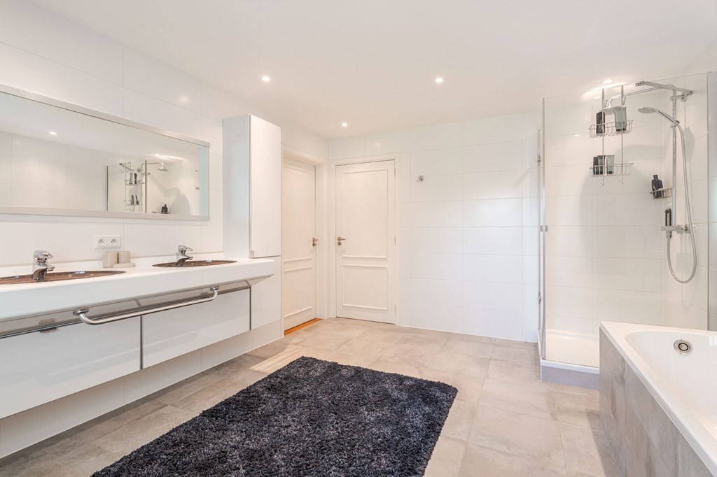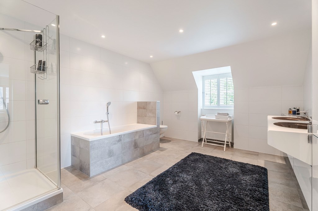 De en suite badkamer is ruim opgezet en er is wederom gebruik gemaakt van mooie materialen. De twee waskommen staan op een notenhouten meubel met natuursteen blad, uitgevoerd in een hoekopstelling. De badkamer is verder voorzien van vloerverwarming, verwarmde spiegel, afgesloten toiletruimte met wandcloset en bidet, en een afgesloten inloopdouche met regenkop.
