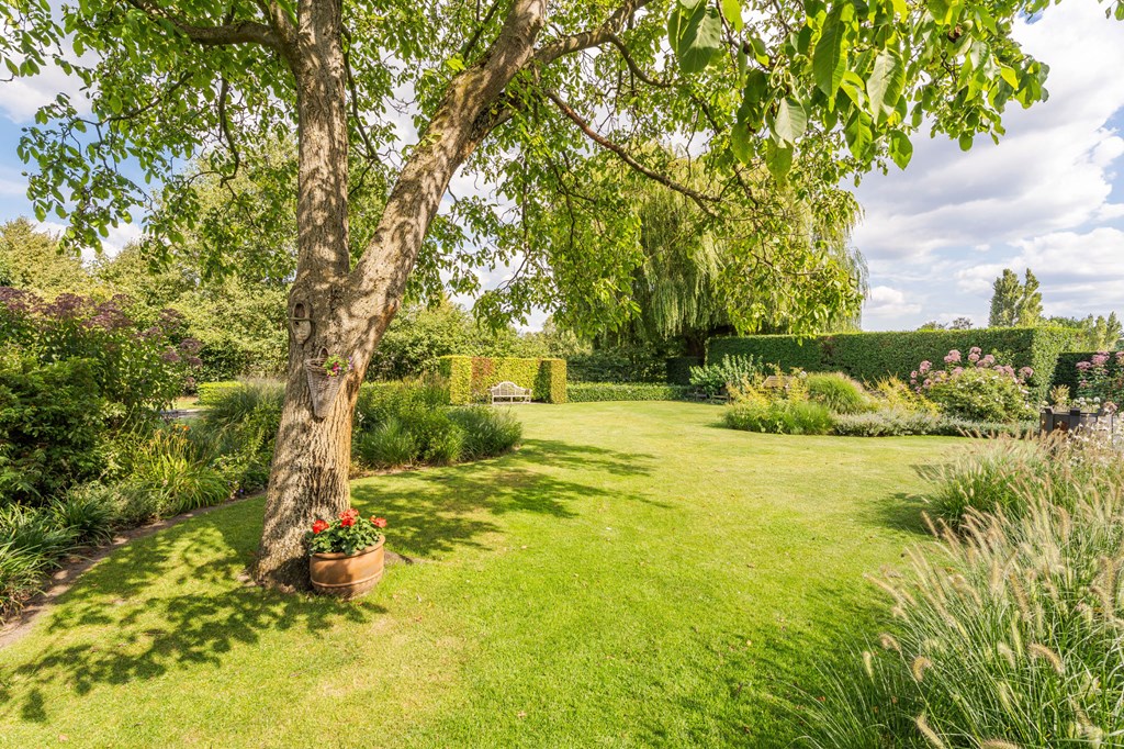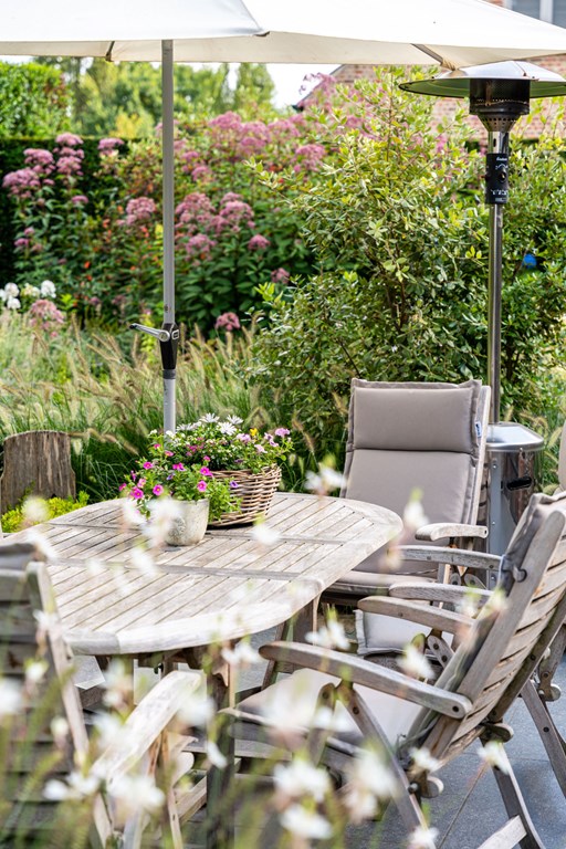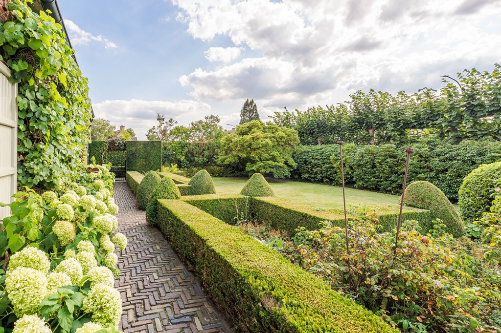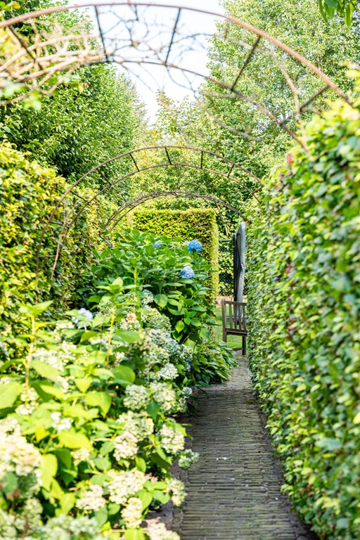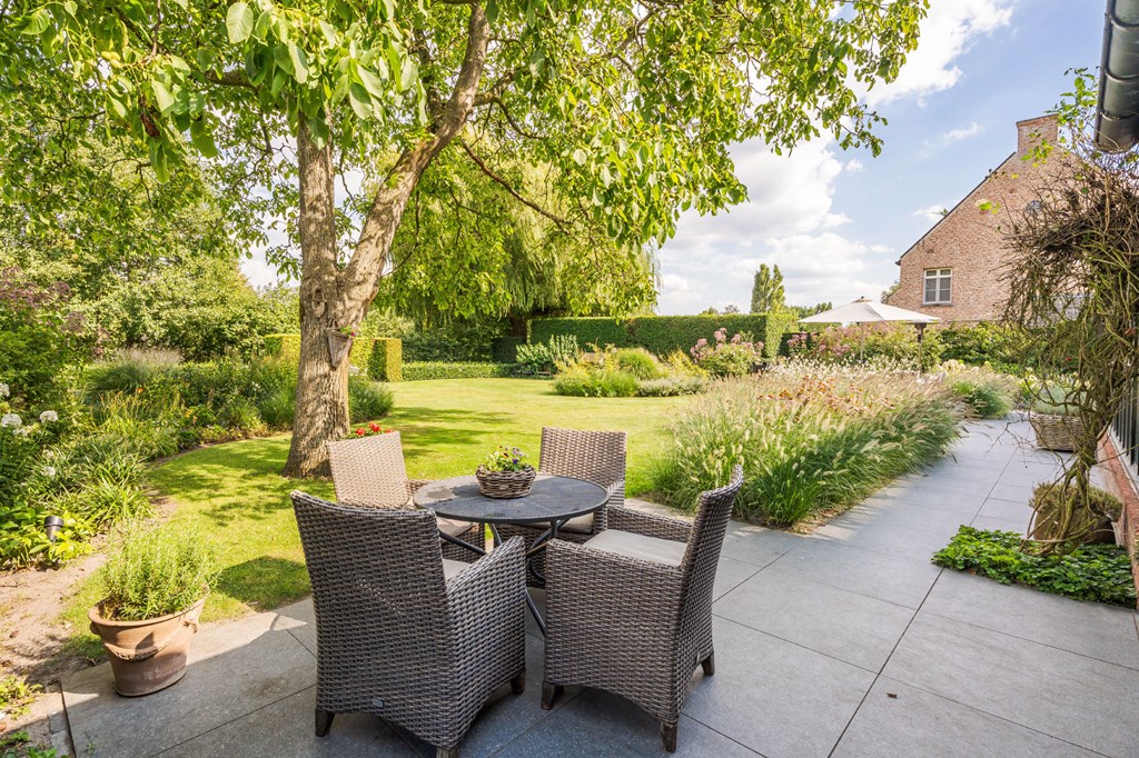 De onder architectuur aangelegde tuin heeft zich door de jaren heen ontwikkeld tot de tuin die het nu is. De tuin ligt rondom het huis en is een fijne plek voor mensen die van het buitenleven houden. De tuin is voorzien van een fijn terras bij de serre, verlichting, een ingebouwde trampoline, een beregeningsinstallatie, een groot gazon, groenborders met organische vormen en volwassen beplanting.
