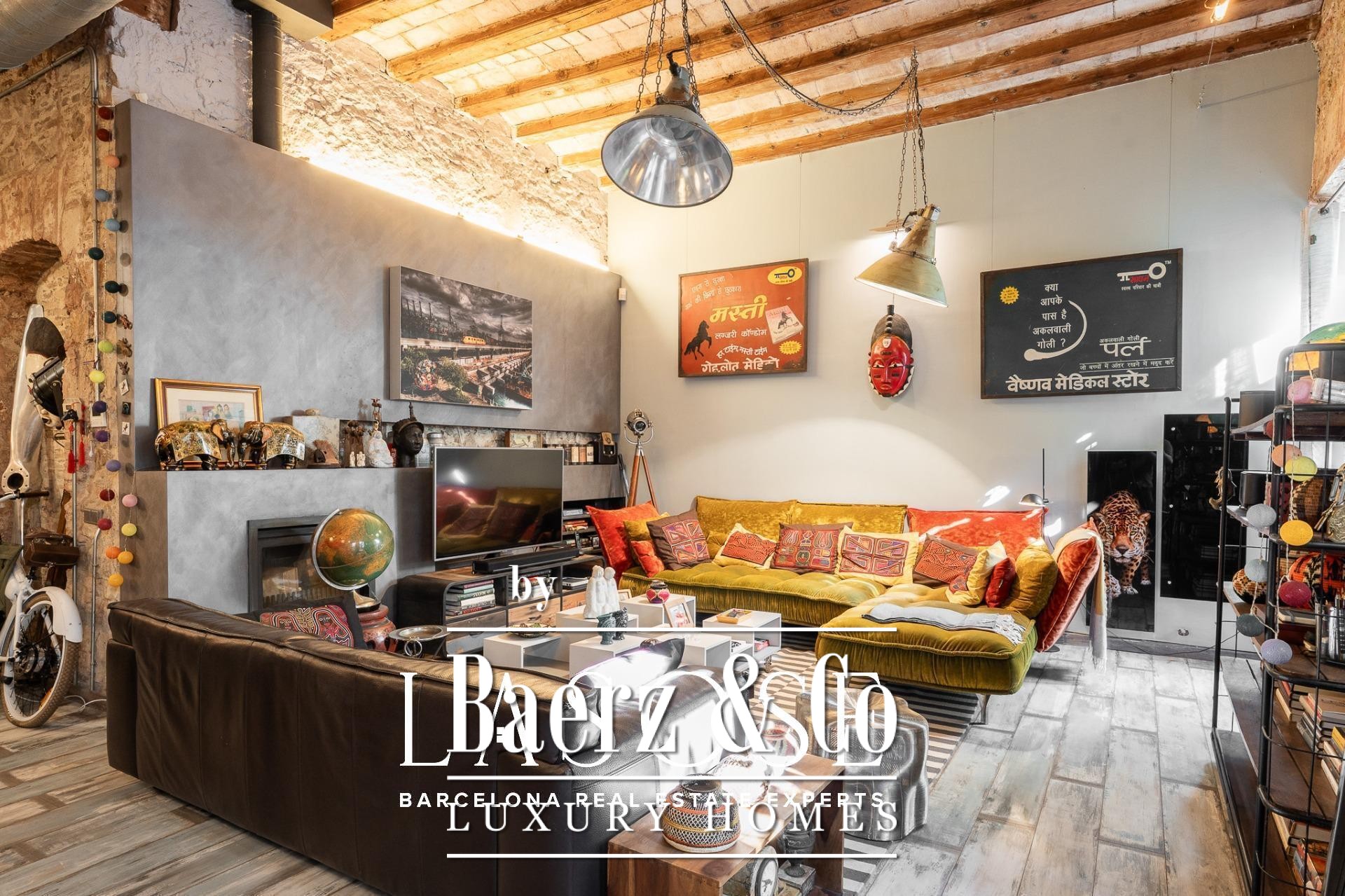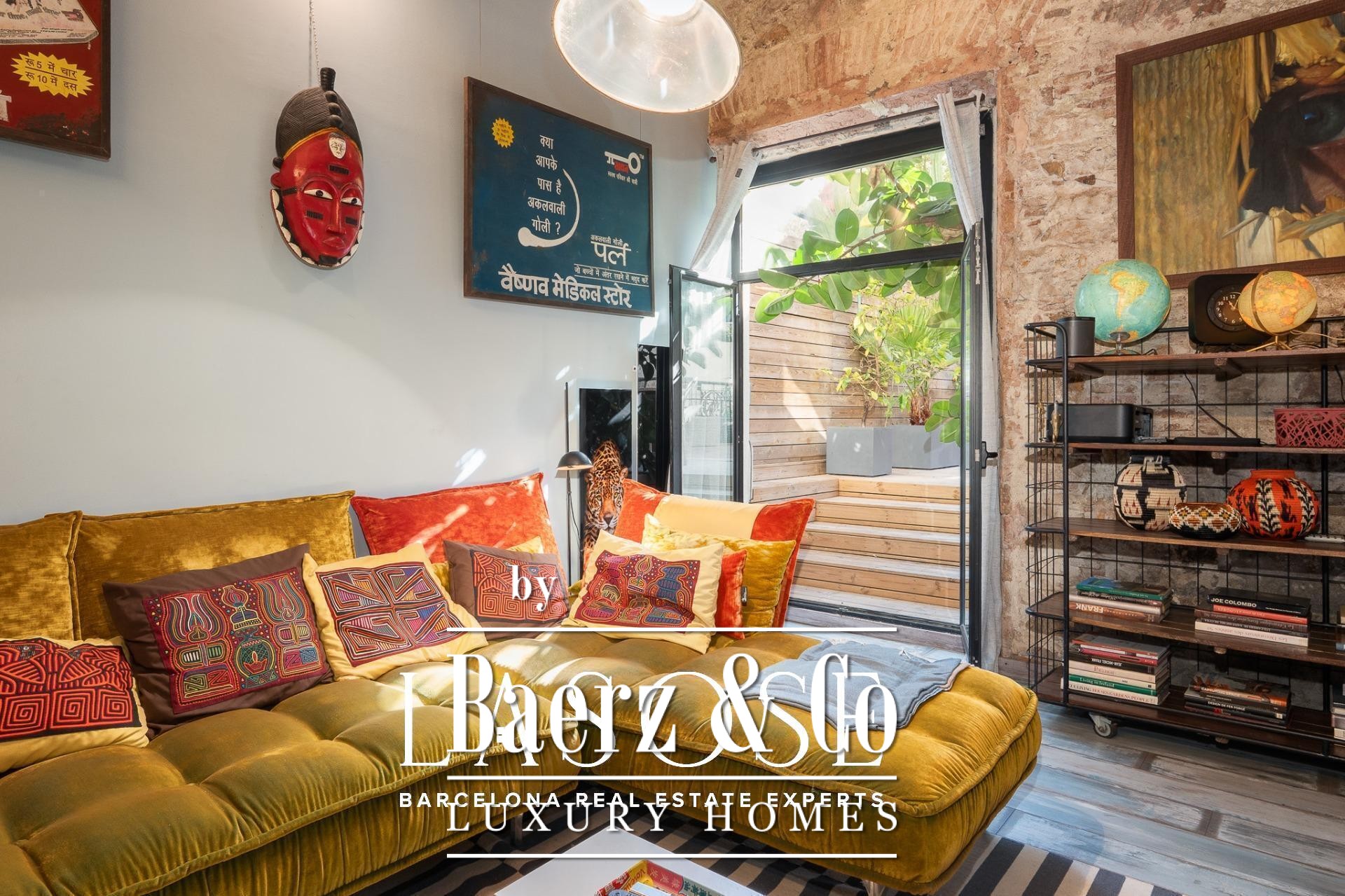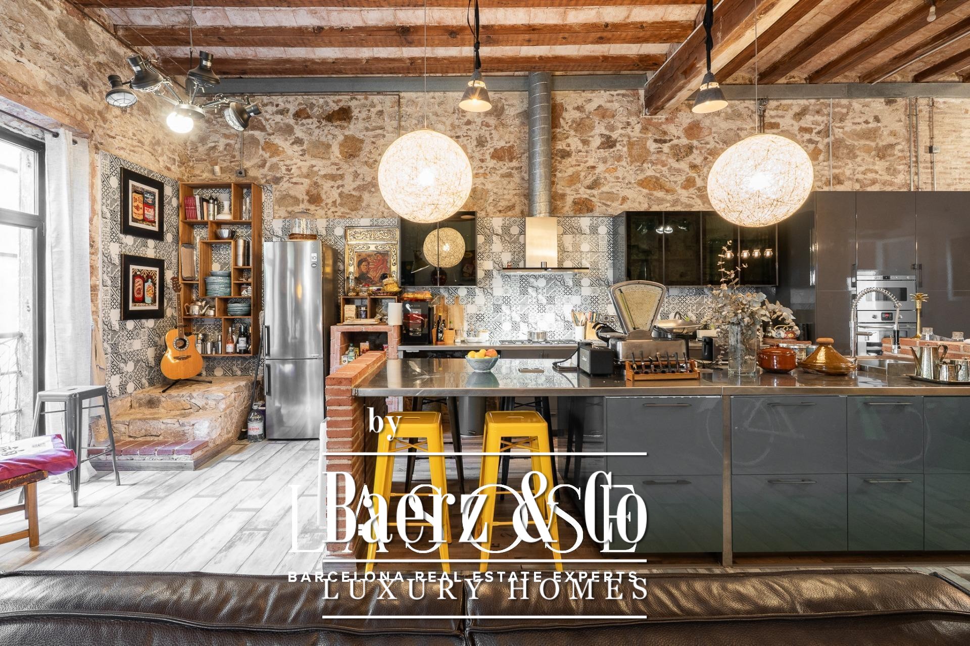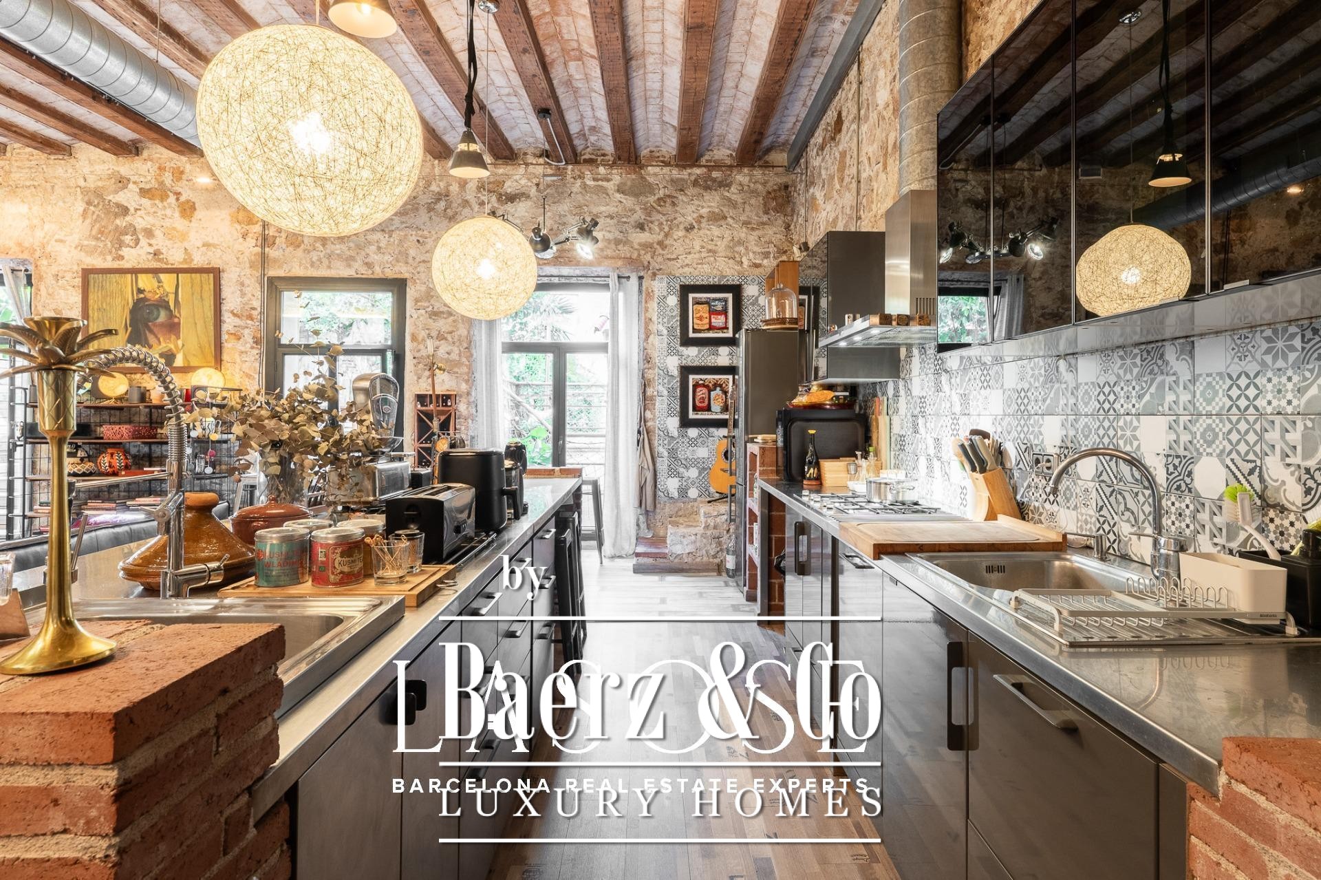 Bij binnenkomst baadt een gang met ramen van vloer tot plafond het interieur in natuurlijk licht en biedt uitzicht op een rustige binnentuin. Drie tweepersoonsslaapkamers, elk met een eigen badkamer, zijn geoptimaliseerd voor privacy en rust. Een royale multifunctionele kamer biedt ruimte voor werk of ontspanning. De living wordt gekenmerkt door een vijf meter hoog plafond, originele bakstenen muren en sierlijke tegels. De open keuken vormt een geheel met de woonkamer, die extra sfeer krijgt door een houtgestookte open haard.