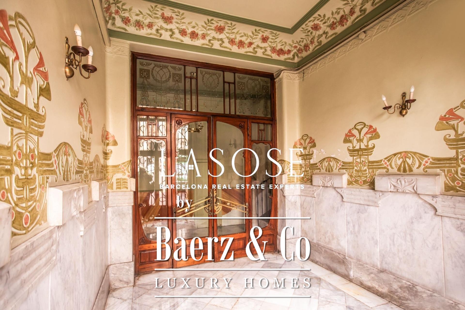 Appartement Barcelona in Eixample Esquerra bevindt zich op de bel-etage van een karakteristiek modernistisch pand uit 1900, waar erfgoedarchitectuur en een royale ruimtelijke indeling samenkomen. Deze woning biedt een intern woonoppervlak van 179 m² en 4 m² aan balkons. Drie balkons aan de straatzijde en een klassieke erker vullen de hoofdwoonkamer met daglicht, wat zowel grandeur als openheid weerspiegelt. De plafonds reiken tot 3,5 meter en zijn voorzien van de originele volta catalana, waarmee het authentieke karakter van de bouwperiode behouden blijft.