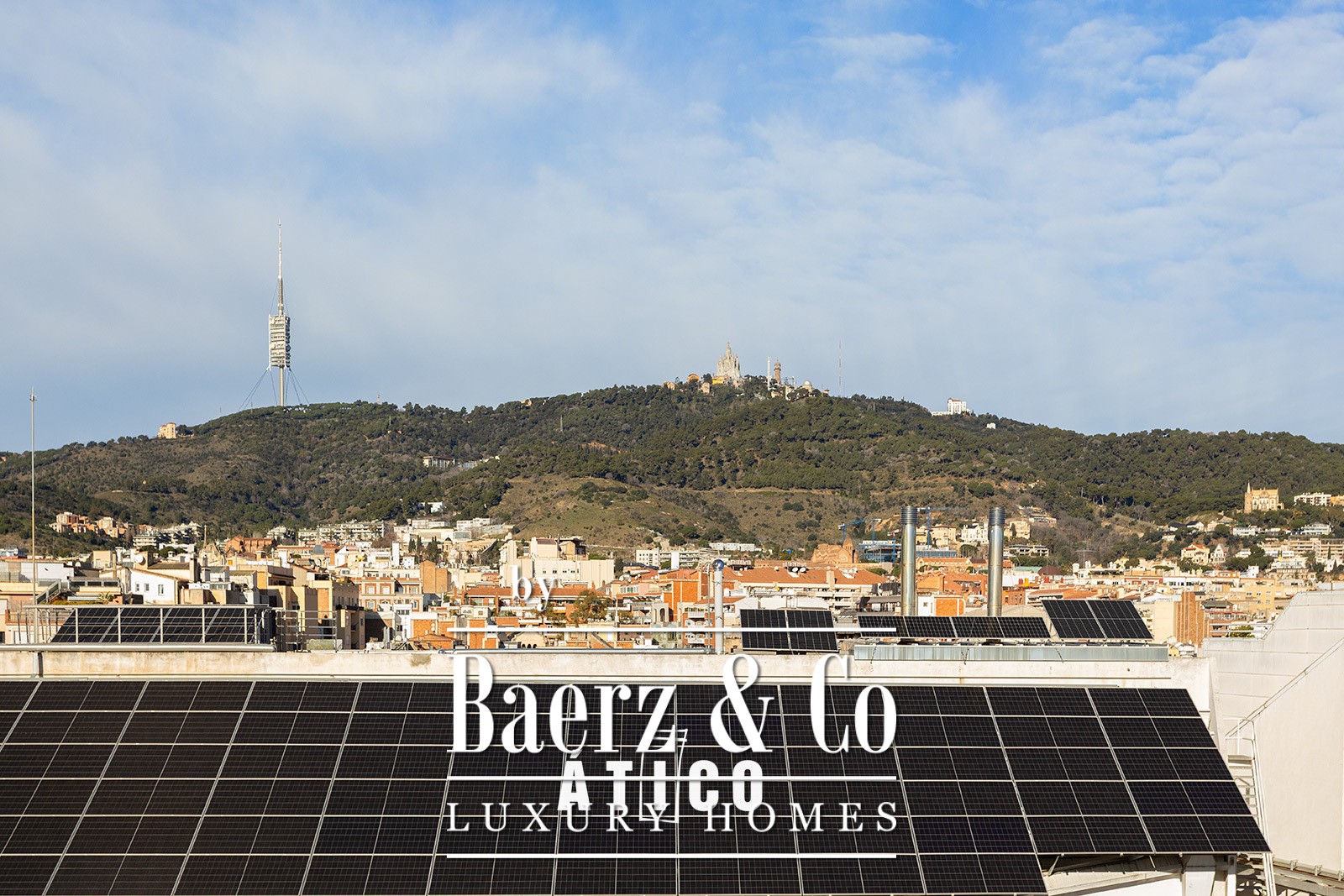 Een discrete trap leidt naar de bovenverdieping, waar een tweede tweepersoonsslaapkamer via een studeerruimte uitkomt op een ruim terras van 44 m². Dit privé-uitkijkpunt biedt open zicht op Tibidabo, perfect voor bijeenkomsten bij zonsondergang of contemplatieve middagen. De bovenste verdieping herbergt tevens nog een tweepersoonsslaapkamer, een gastentoilet en een flexibele opbergruimte. Eén parkeerplaats is inbegrepen, met mogelijkheid tot aankoop van twee extra plaatsen.