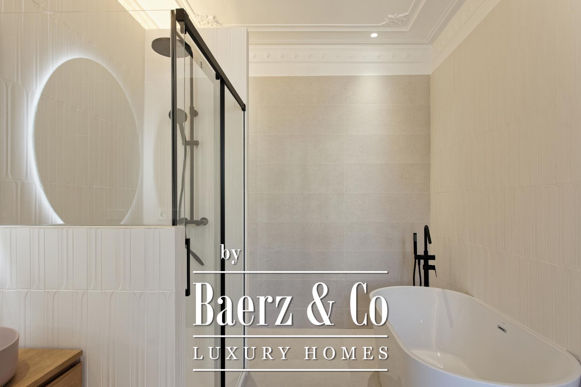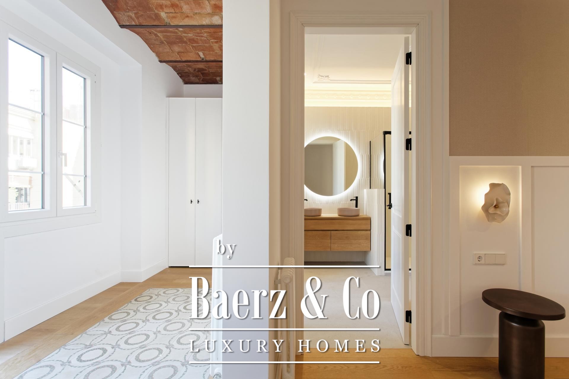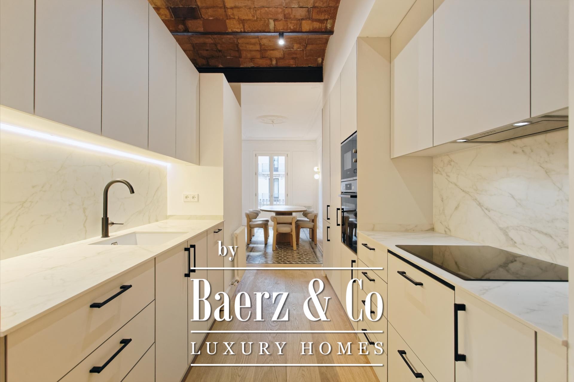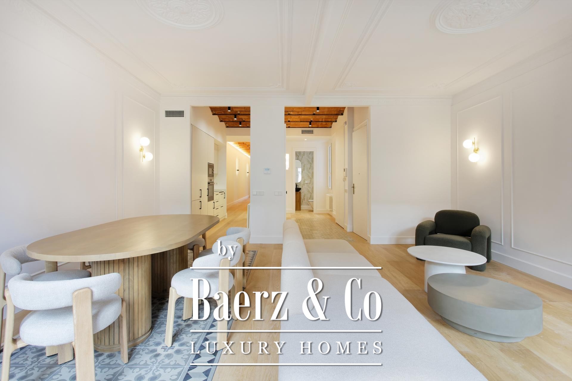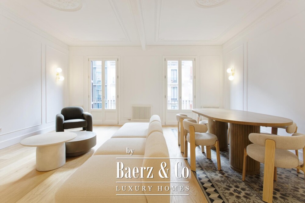 De woon- en eetruimtes zijn ingericht voor zowel geborgen comfort als rustige gastvrijheid en sluiten aan op een volledig uitgeruste keuken en een aparte wasruimte. Dit zorgvuldig gerenoveerde appartement behoudt authentieke elementen, introduceert moderne afwerkingen en biedt toegang via een lift, waardoor het geheel een sfeer uitstraalt van ingetogen, historisch wonen in Barcelona.