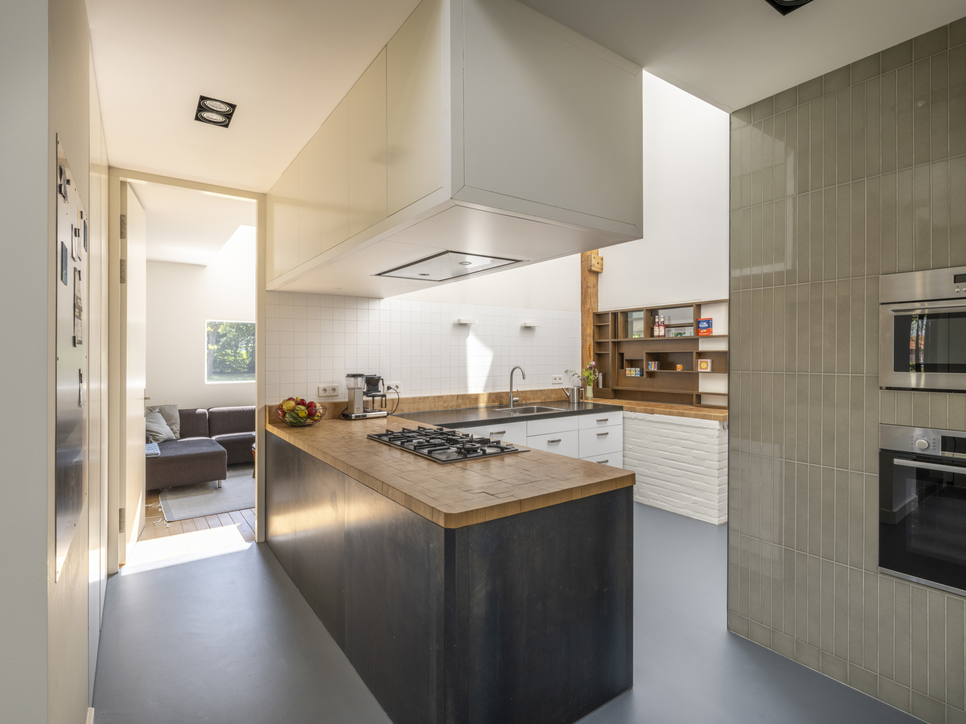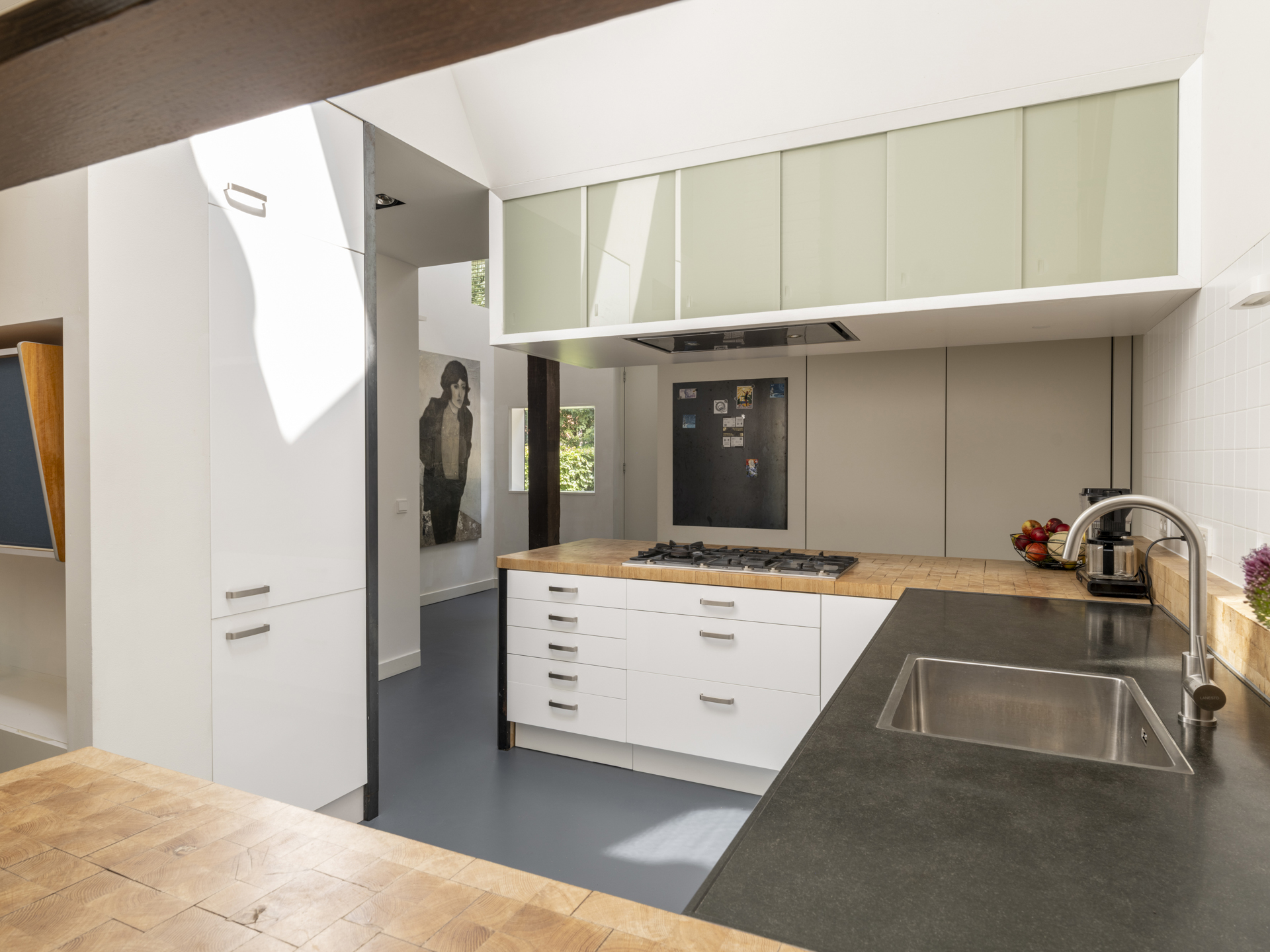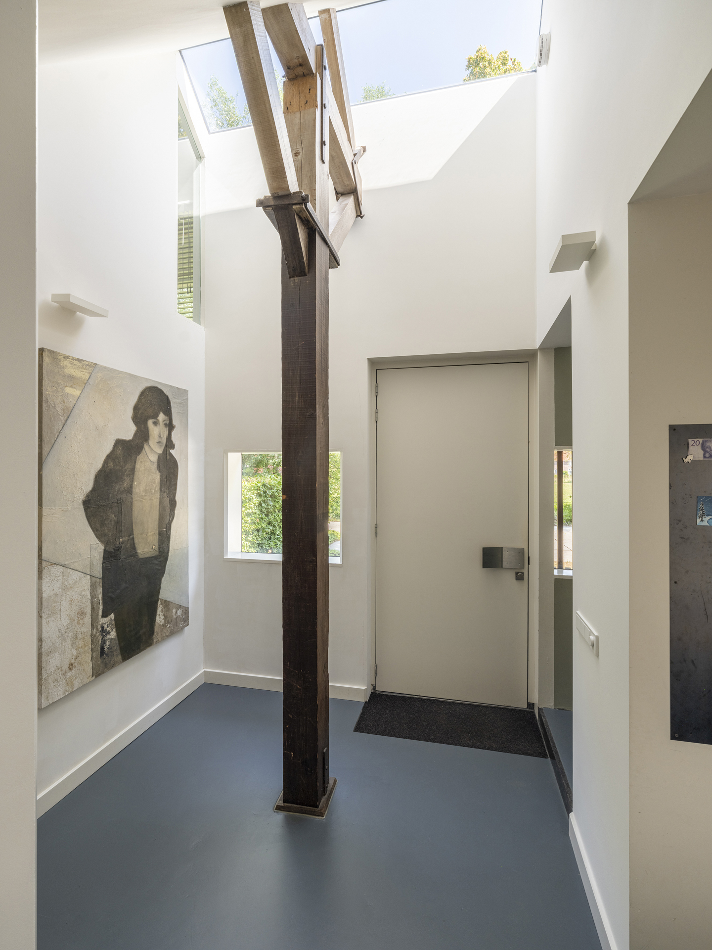 Direct bij binnenkomst via de hoge massieve voordeur ervaar je de unieke combinatie van strakke lijnen, oude elementen en bijzondere lichtinval.