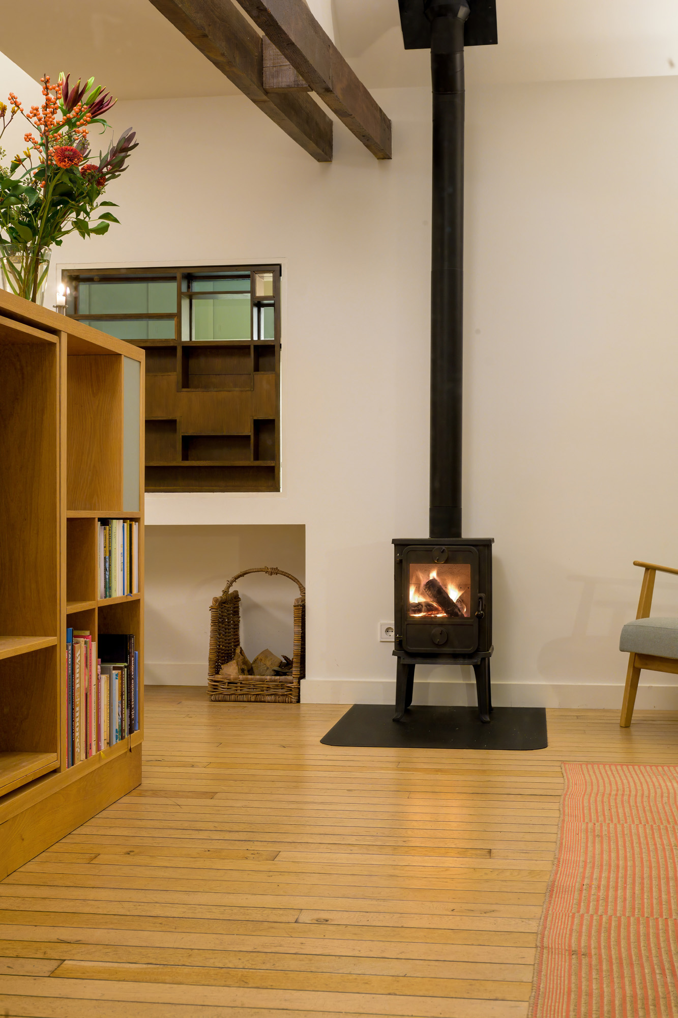 De prachtige tuingerichte woonkamer wordt ook gekenmerkt door een prachtige lichtinval en biedt mooie doorkijkjes naar de tuin. In deze ruimte, waar de originele balkenconstructie in het zicht gebleven is, tref je een houtkachel en een stijlvolle parketvloer. Een deur biedt toegang tot de zijtuin. Aan weerszijden van de living tref je mooie, op maatgemaakte wandkasten en een tv-meubel/boekenkast met draaibaar tvgedeelte.