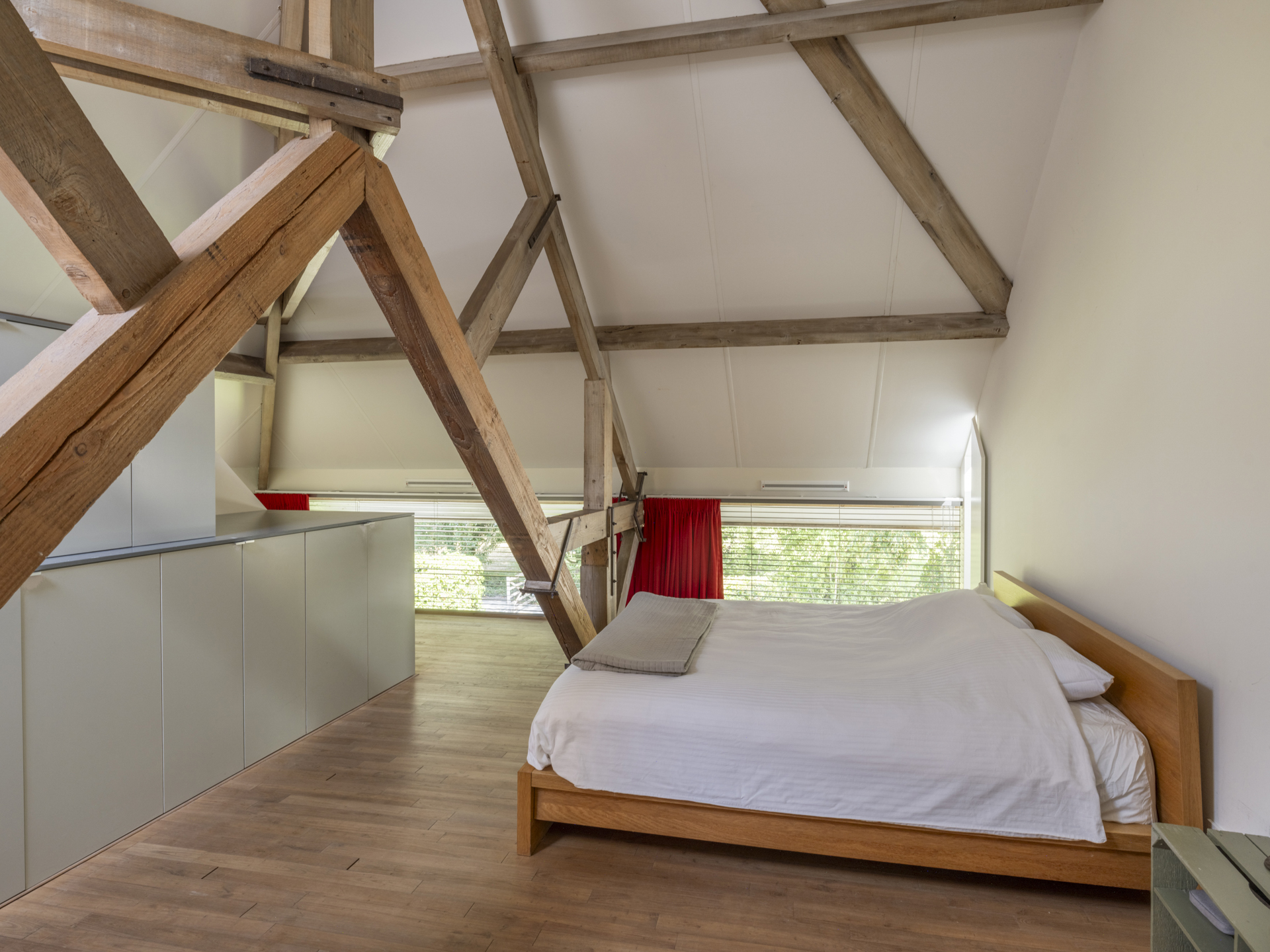 Slaapkamer, nu in gebruik als masterbedroom. Je slaapt hier onder de originele kapconstructie. De ruimte is voorzien van op maat gemaakte kledingkasten en airconditioning.