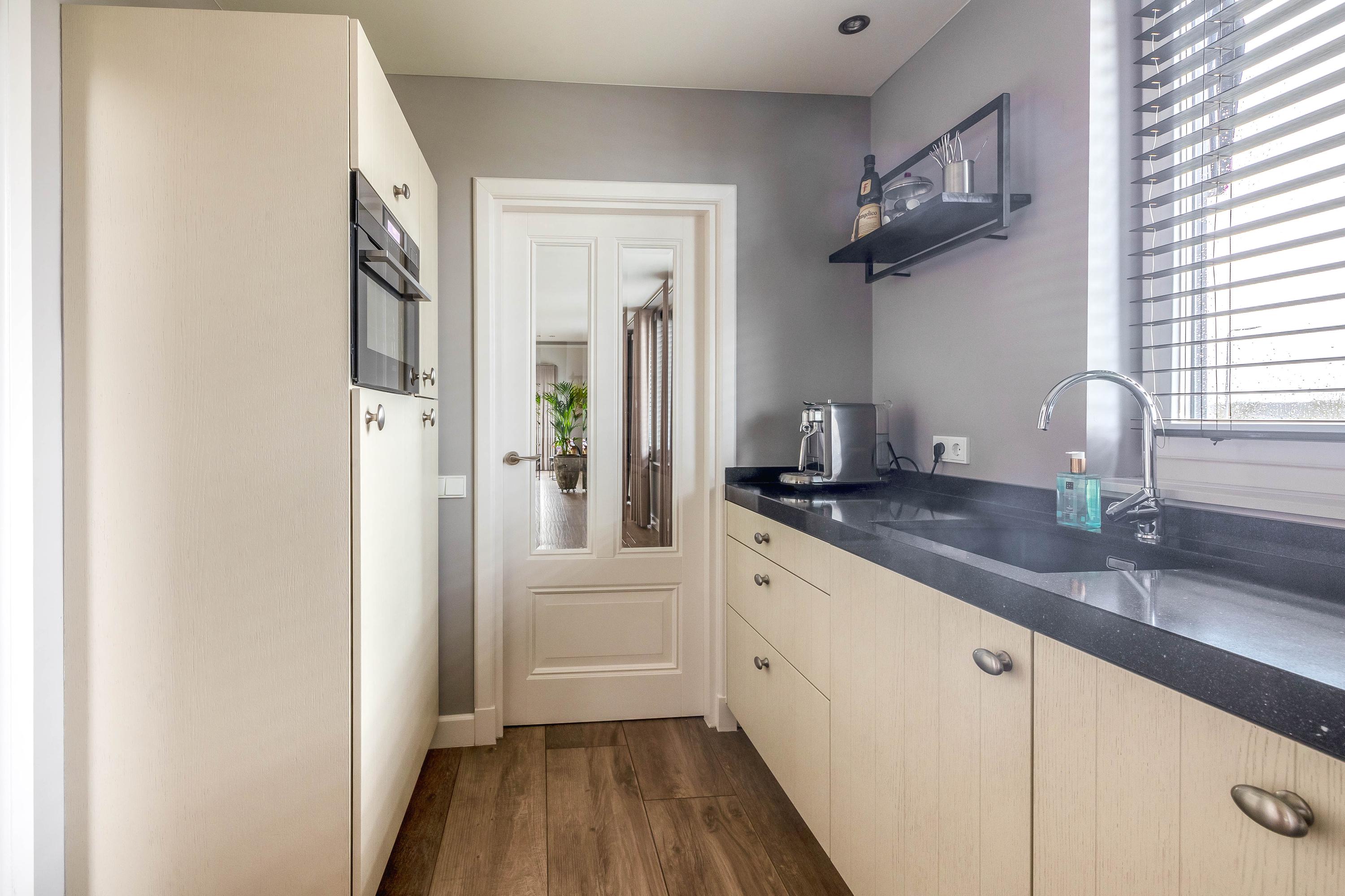 Vanuit de prachtige, hoge L-vormige woonkamer (ca. 72m²) is er een fantastisch uitzicht op de Maas. Het hoge plafond, de vele ramen en de tweemaal dubbele tuindeuren zorgen voor een mooie lichtinval. In de massieve keuken (ca. 7m²) zijn een inductiekookplaat, afzuigkap, vaatwasser, koelkast en combi stoomoven aanwezig. Ook vanuit hier is er een mooi uitzicht op de Maas. Het geheel is afgewerkt met een composieten aanrechtblad.