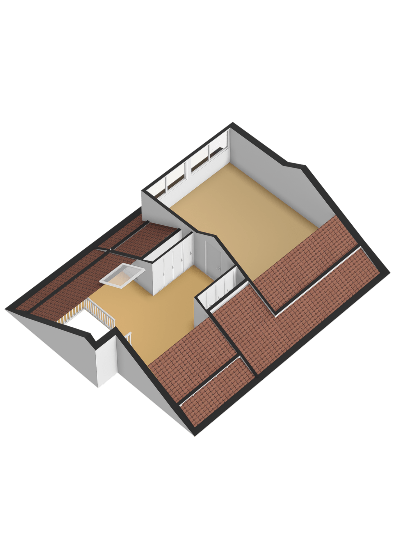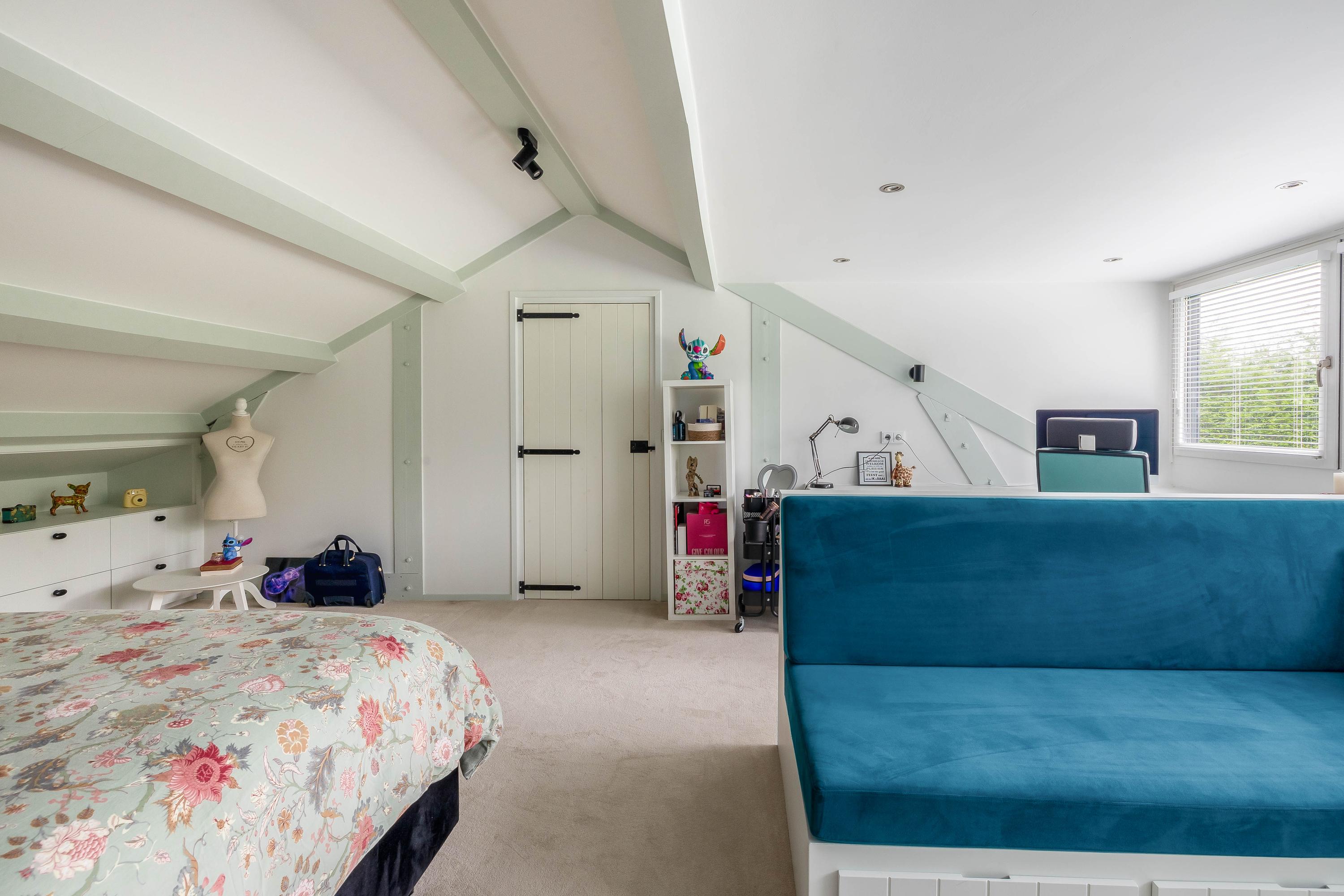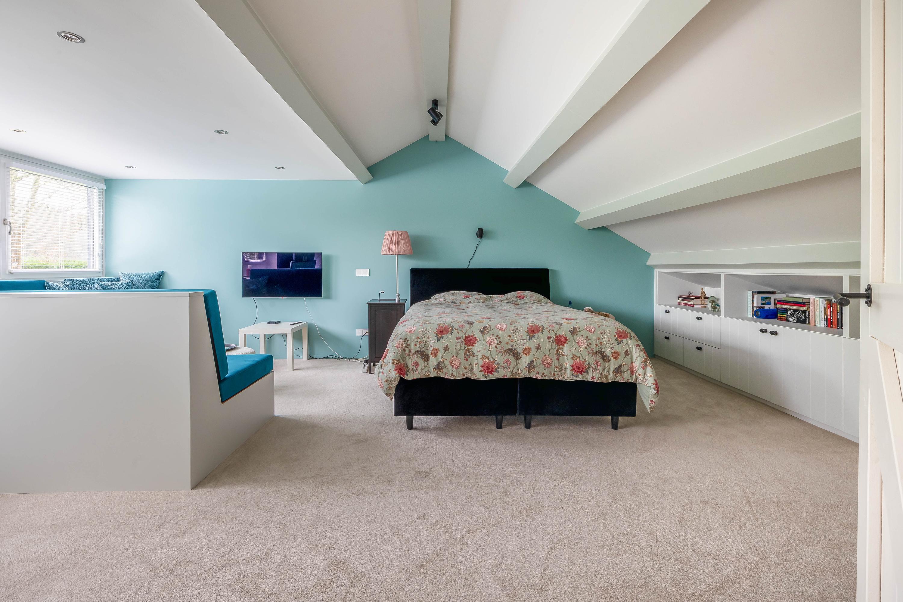 De zeer ruime slaapkamer (ca. 28m²) is voorzien van een grote dakkapel met ingebouwde elektrische rolluiken, jaloezieën en horren. De slaapkamer is voorzien van veel vaste elementen zoals banken en een bureau. Zowel op de overloop als slaapkamer ligt vloerbedekking.