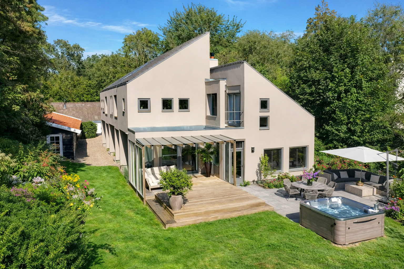 Naast de villa staat een mooie houten carport voor meerdere auto's, deze carport loopt door in een werkplaats voorzien van water en elektra en is voorbereid op een wellnessruimte.