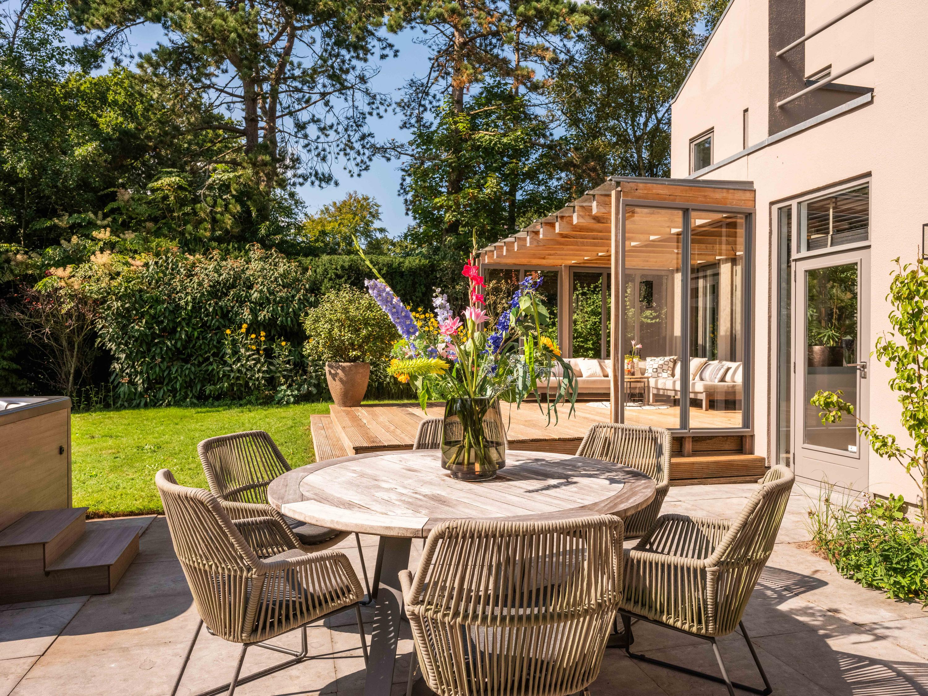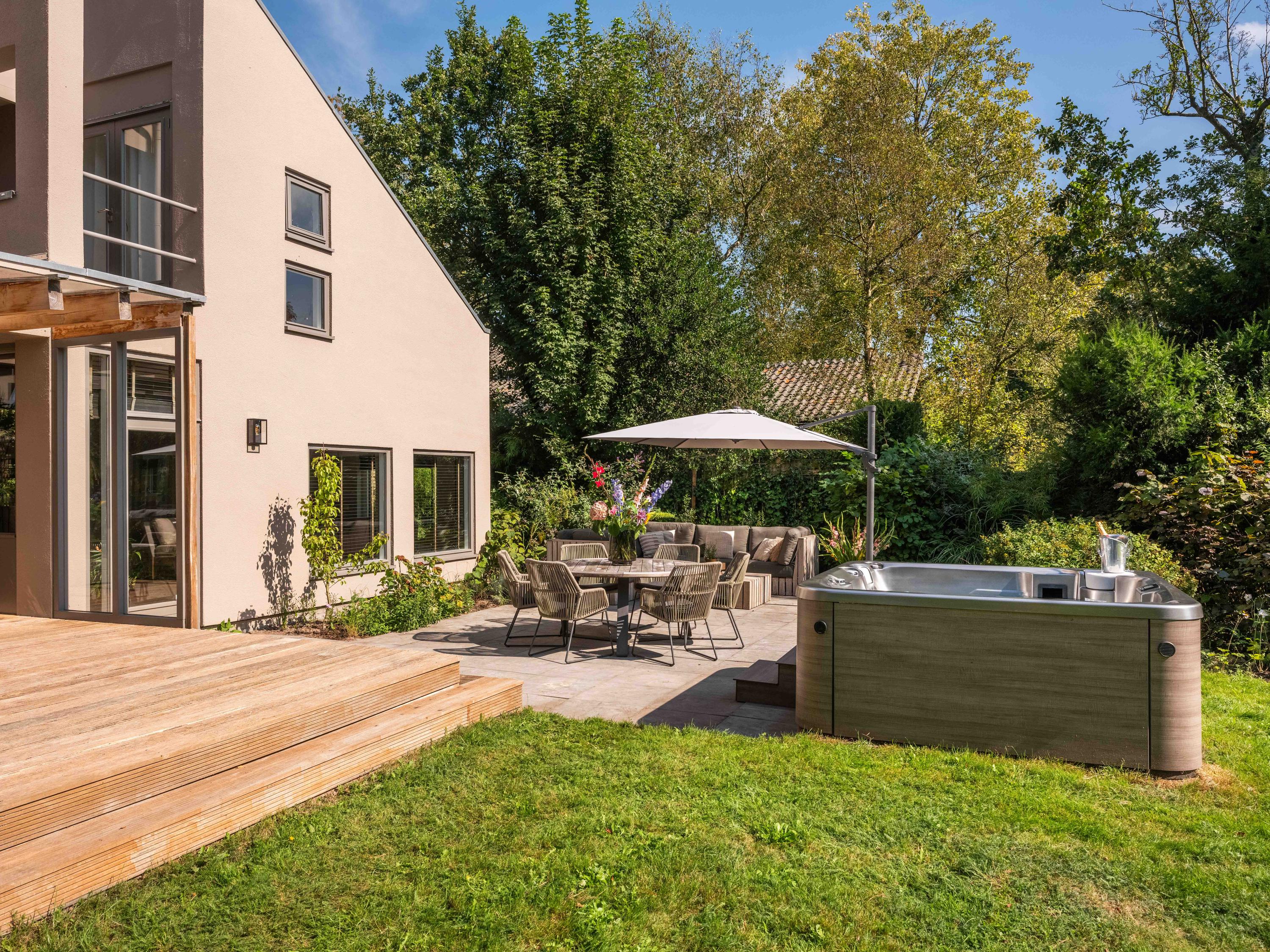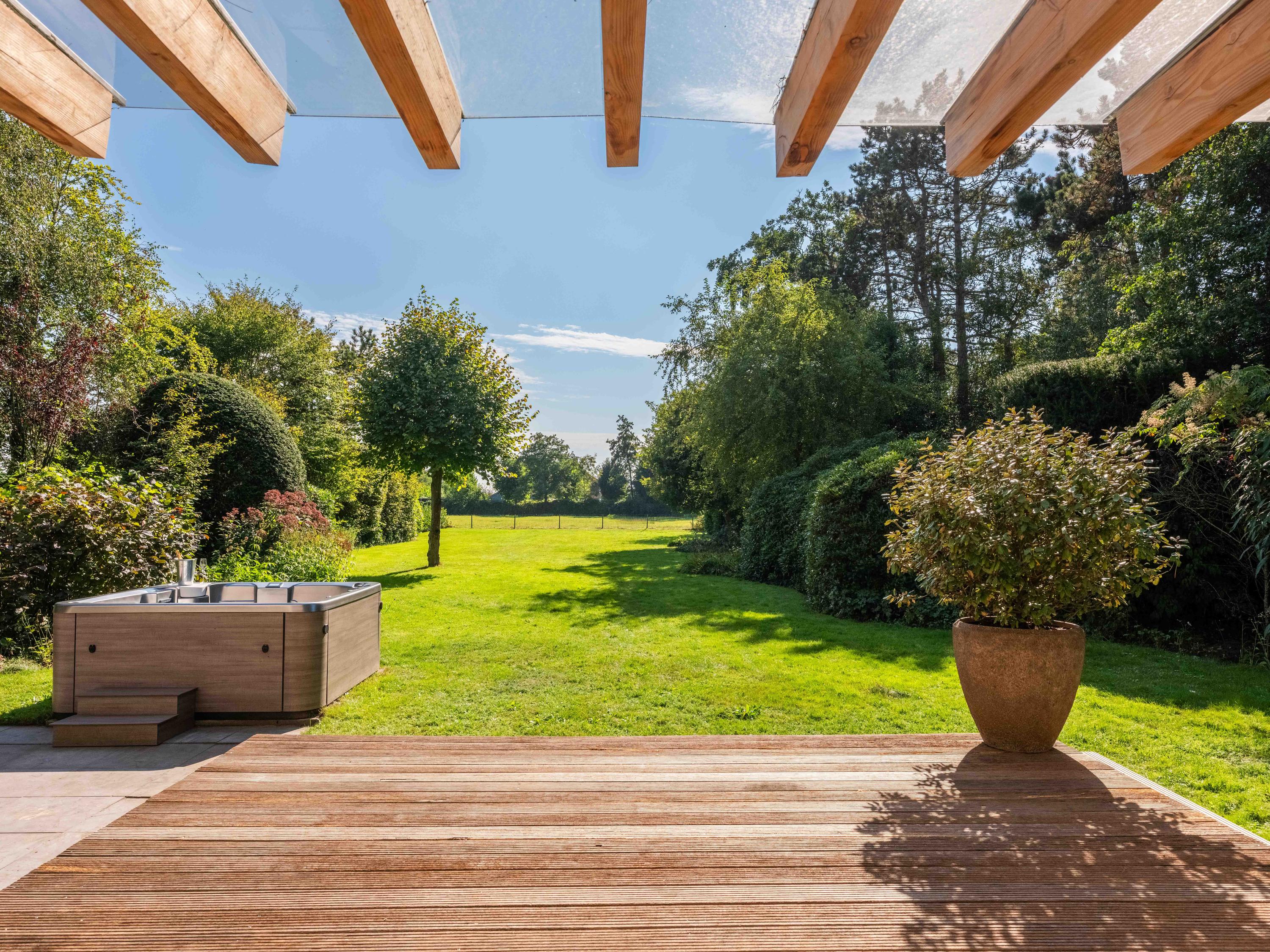 Aan de voorzijde is voldoende ruimte voor het parkeren van diverse auto's op eigen terrein. Aan de achterzijde van de villa treft men een mooie royale tuin met diverse terrassen waar men heerlijk kan genieten van zon, natuur en het prachtige uitzicht op het achtergelegen weiland.