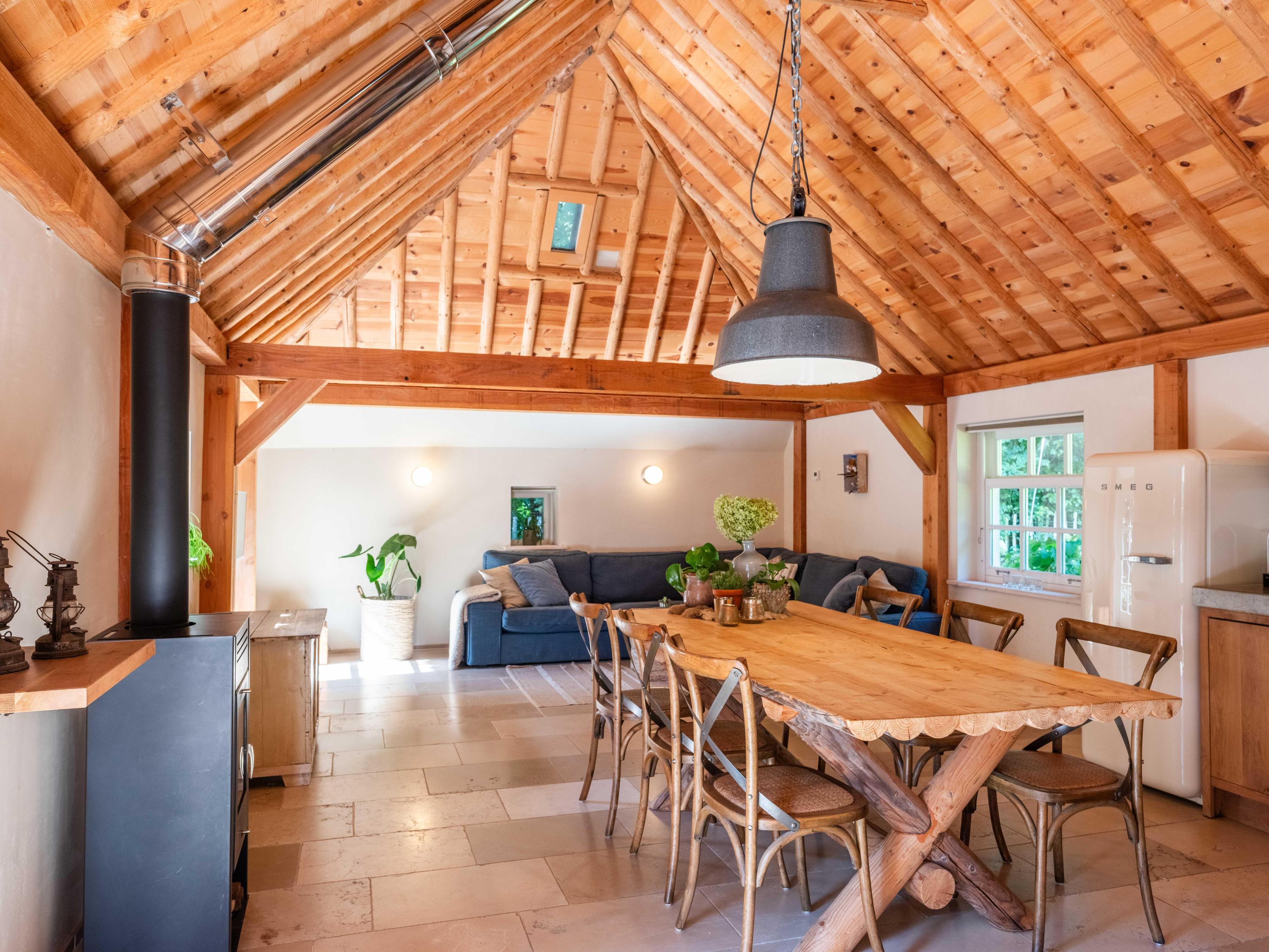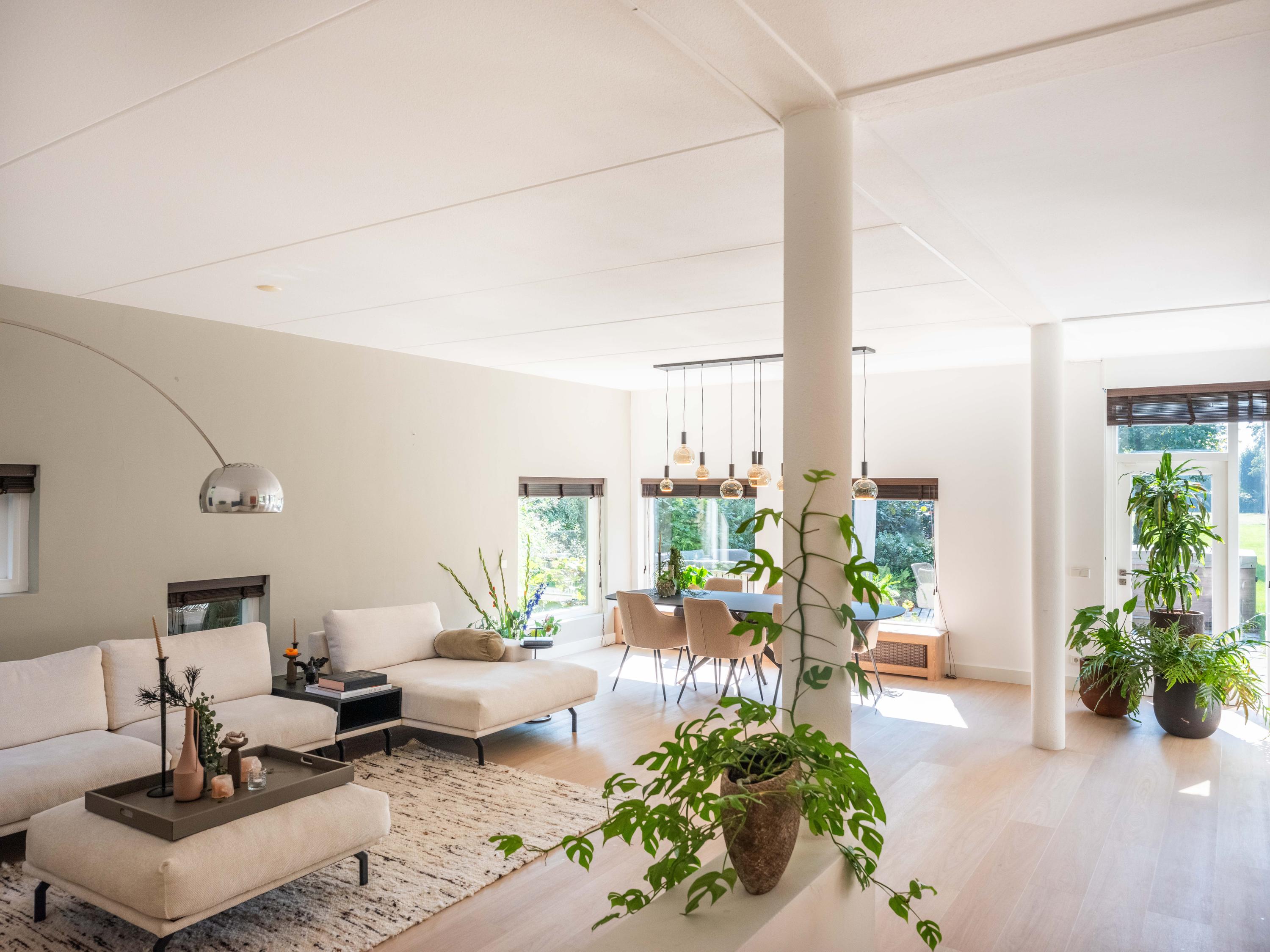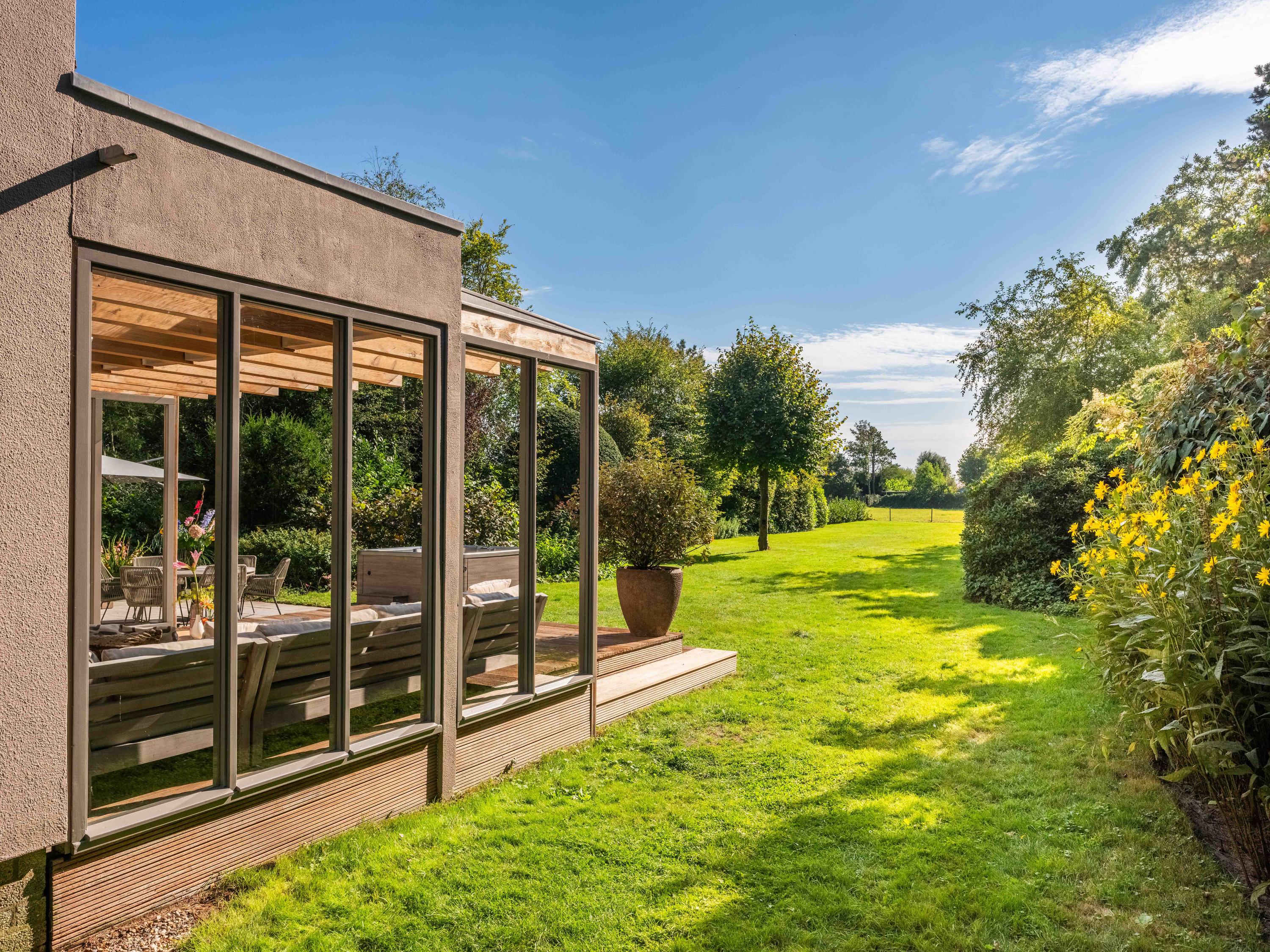 We beginnen in de royale living, deze is heerlijk licht en kijkt uit over het gazon richting het achtergelegen weiland. Een open haard zorgt voor een gezellige sfeer en warmte in de namiddag en de avonden.