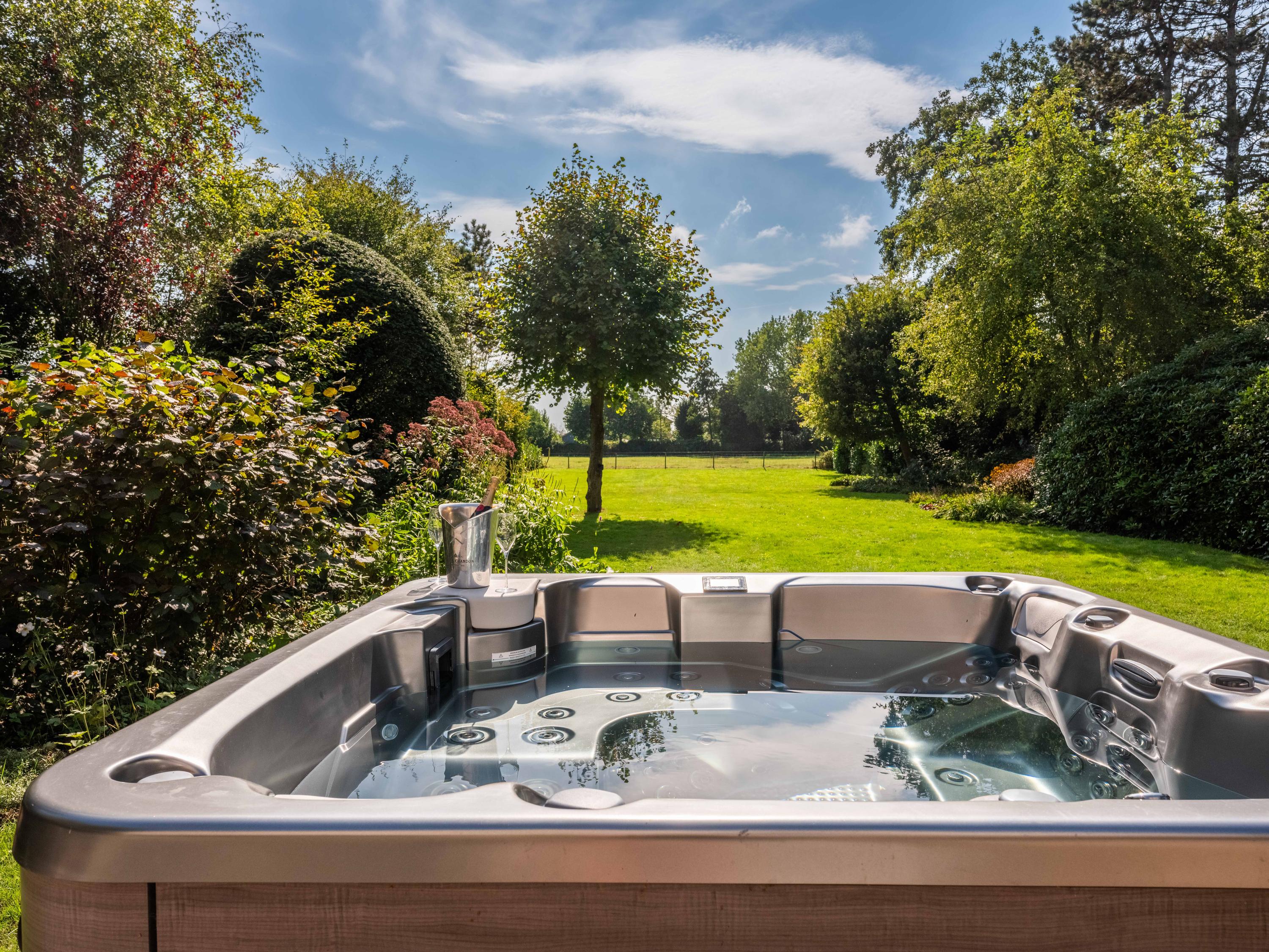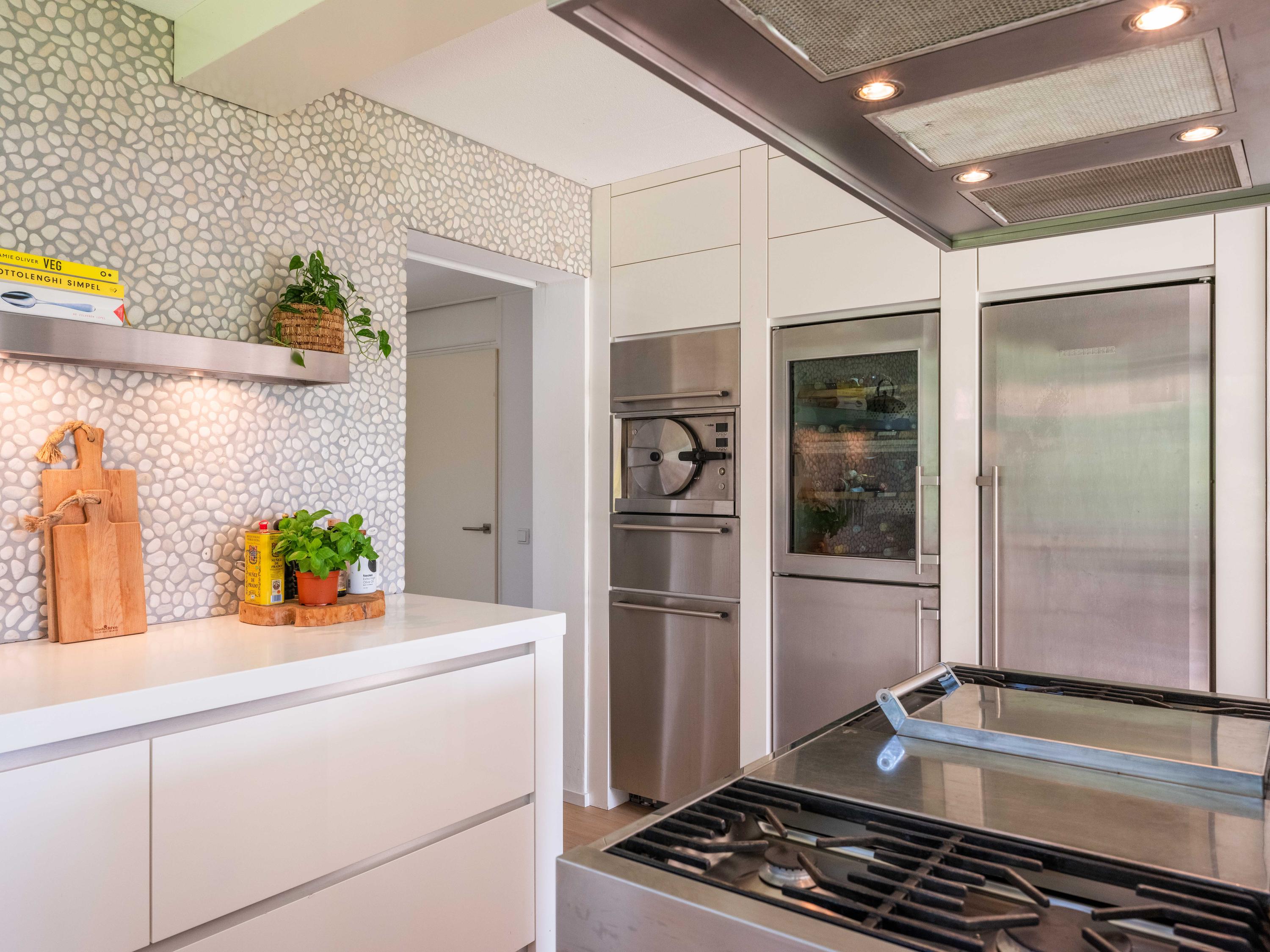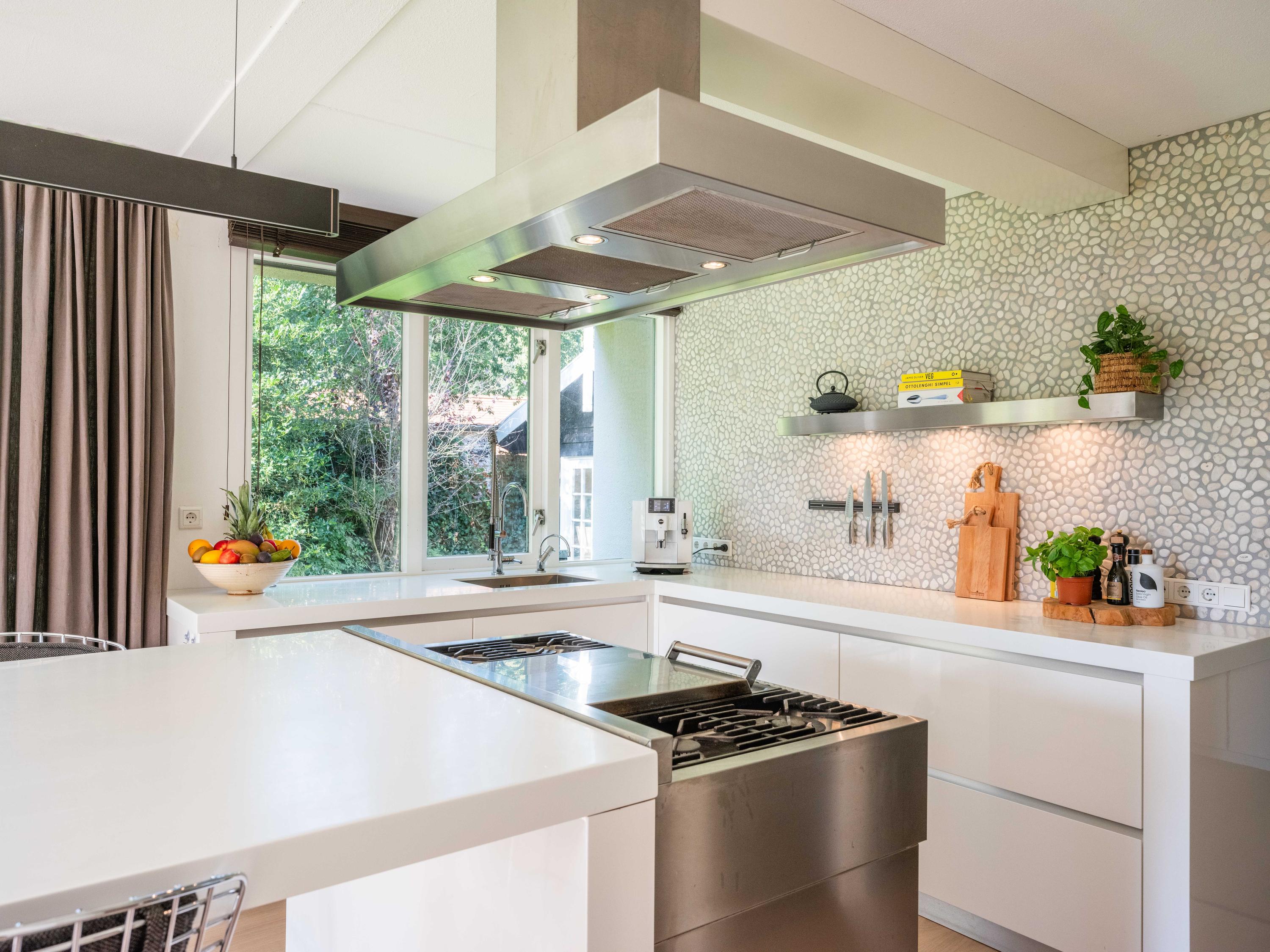 De moderne open woonkeuken is voorzien van een eiland waar men heerlijk gezamenlijk aan kan zitten. Ook hiervandaan weer een prachtig uitzicht op het groen. Openslaande deuren en een overdekt verwarmd terras halen het buiten naar binnen. De keuken is voorzien van diverse inbouwapparatuur o.a. een quooker, koelkast, vriezer, stoomoven, wijnklimaatkast, warmhoudlade en vaatwasser. Kookgelegenheid is er op het grote fornuis met 4 gaspitten, een teppanyakiplaat, frituur en dubbele oven.