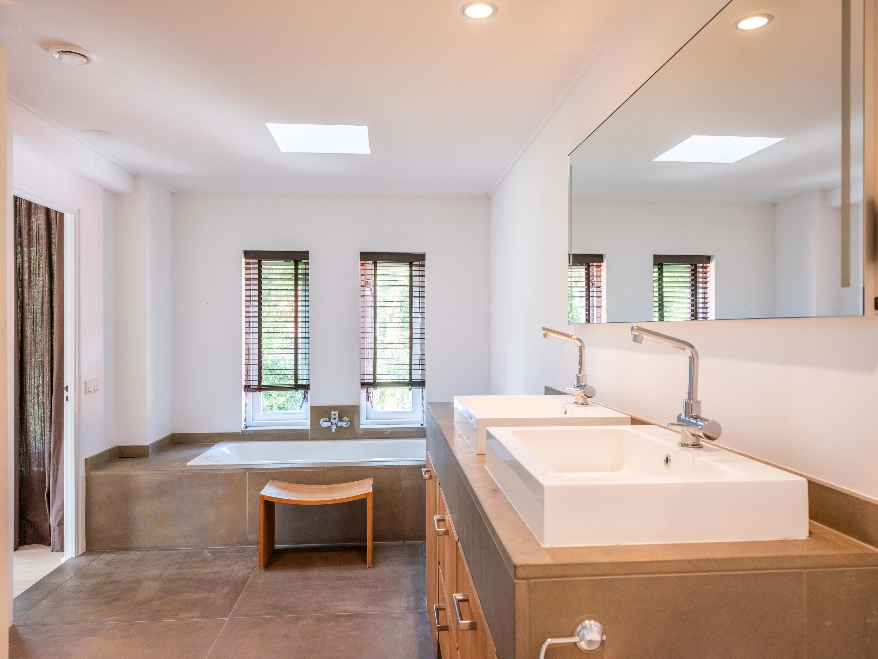 Ook aan de overloop zijn 2 badkamers gelegen. De grote badkamer is voorzien van een dubbele wastafel, een ligbad, een inloopdouche en toilet, deze badkamer ligt aansluitend aan de masterbedroom.