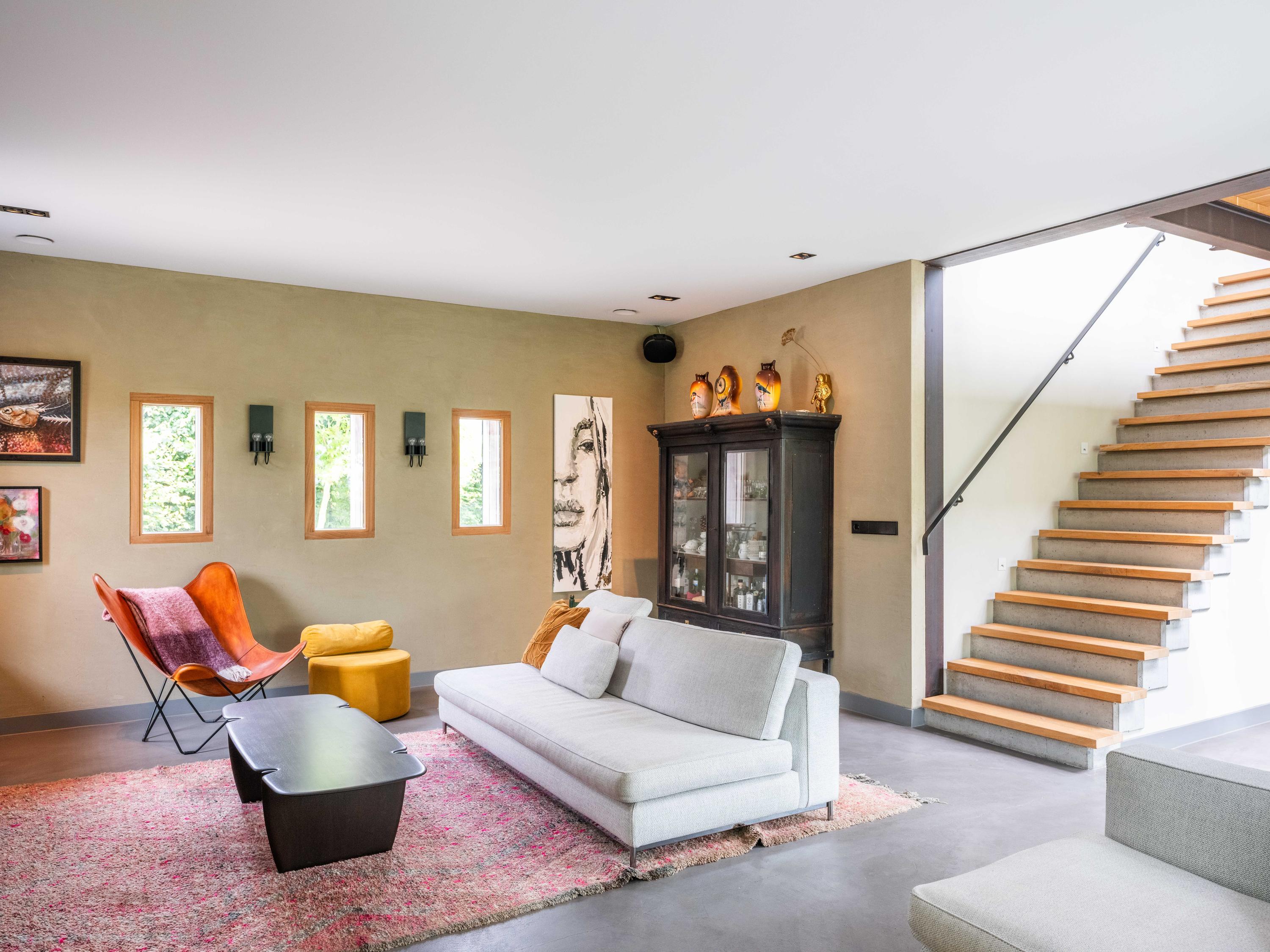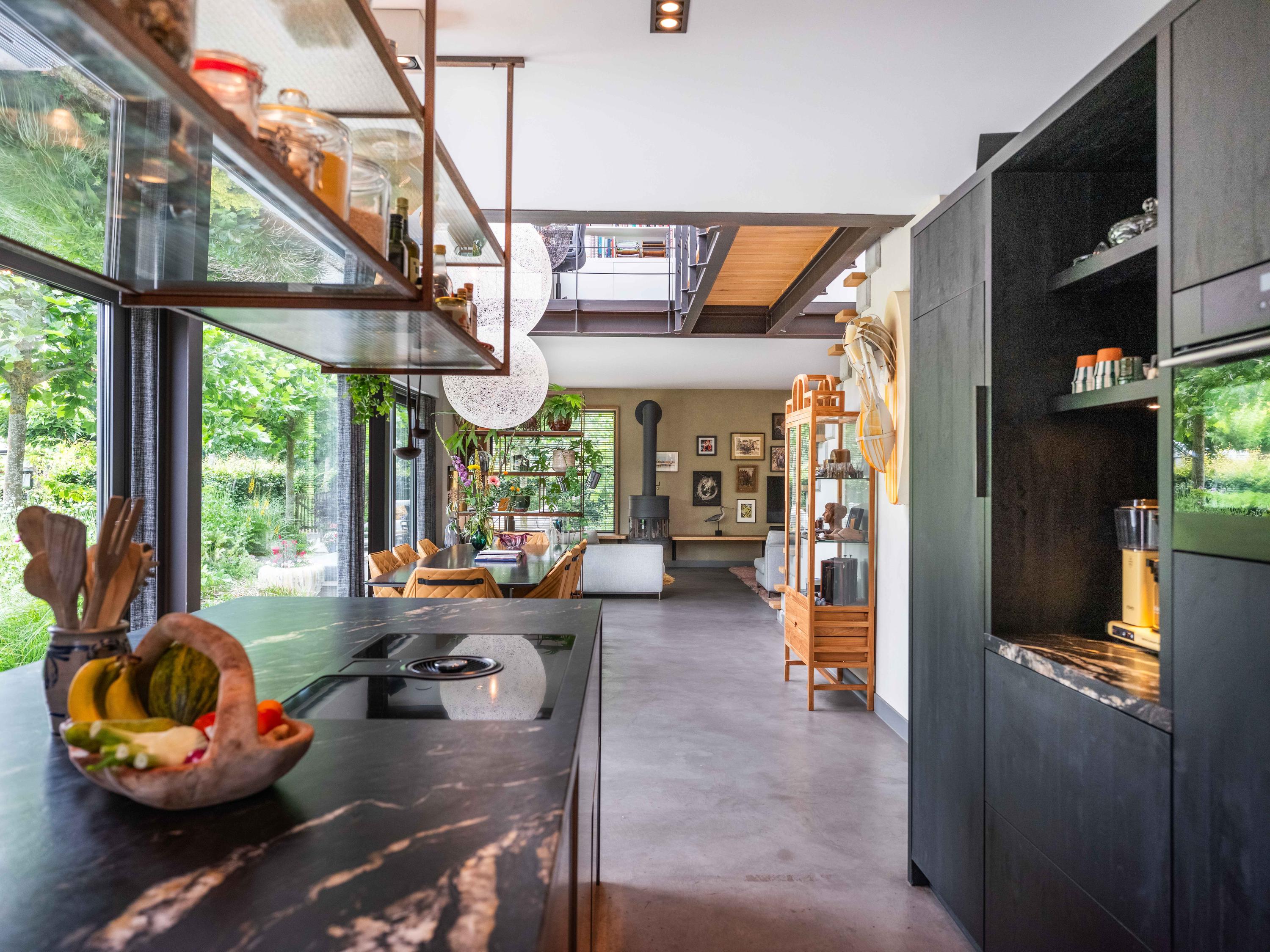 We nemen u graag mee naar binnen. Via de entree betreden we de sfeervolle woonkamer met open keuken. De keuken is volledig uitgerust en biedt alles wat het hart van de kookliefhebber begeert. Wat direct opvalt, zijn de grote raampartijen die zorgen voor een prachtige lichtinval en een weids uitzicht op de groene tuin en de omliggende weilanden. Ook de trap naar de verdieping is een ware blikvanger – een architectonisch hoogstandje dat karakter toevoegt aan de ruimte. Het huis is als een loft opgezet met volledig open karakter.