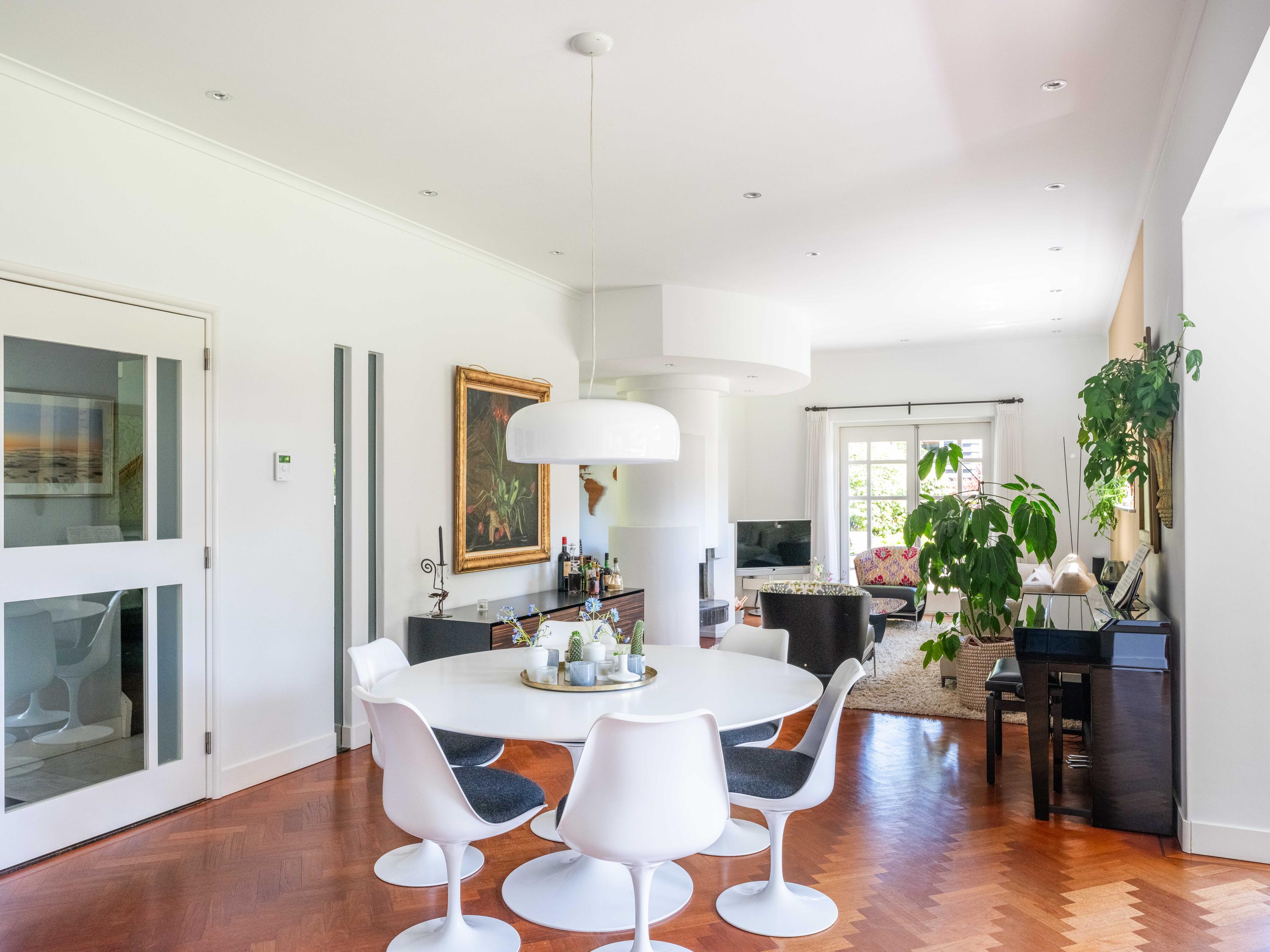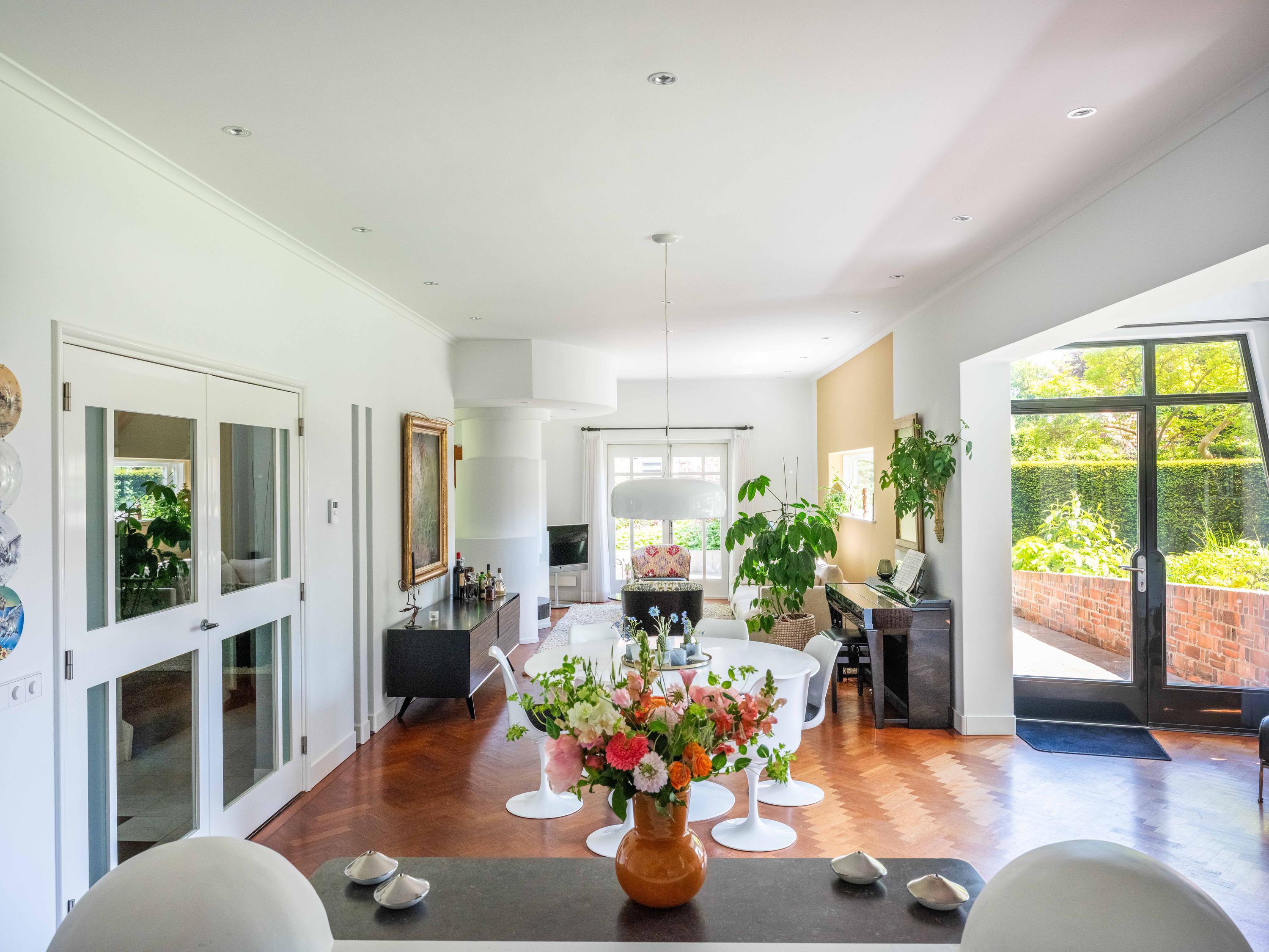 Openslaande deuren leiden naar de royale woonkamer met open haard, een eetgedeelte en serre. Opvallend is het verhoogde gedeelte "de stuurhut". Een mooie parketvloer met bies, de ronde vormen van de open haard , de "kompasbollen" bij de verhoging en het trapeziumvormige raam met kolommen geven het geheel een bijzondere uitstraling.
