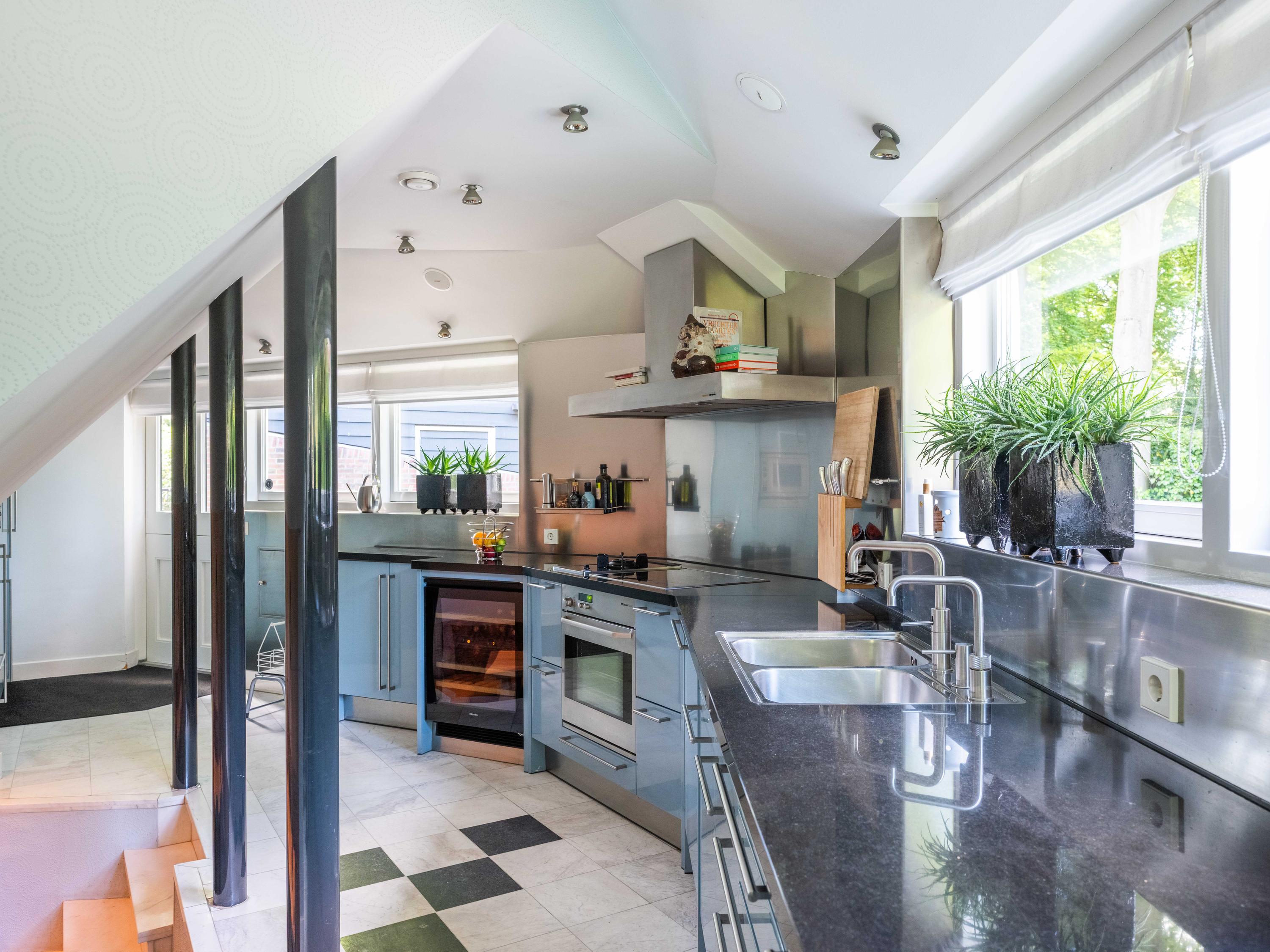 Via de hal bereiken we de woonkeuken voorzien van moderne inbouwapparatuur. Door de vorm, een halve zeshoek, is deze speels en bijzonder van opzet, dit ook door het eetgedeelte, met ruimte voor een grote tafel, dat een niveau lager is gelegen.