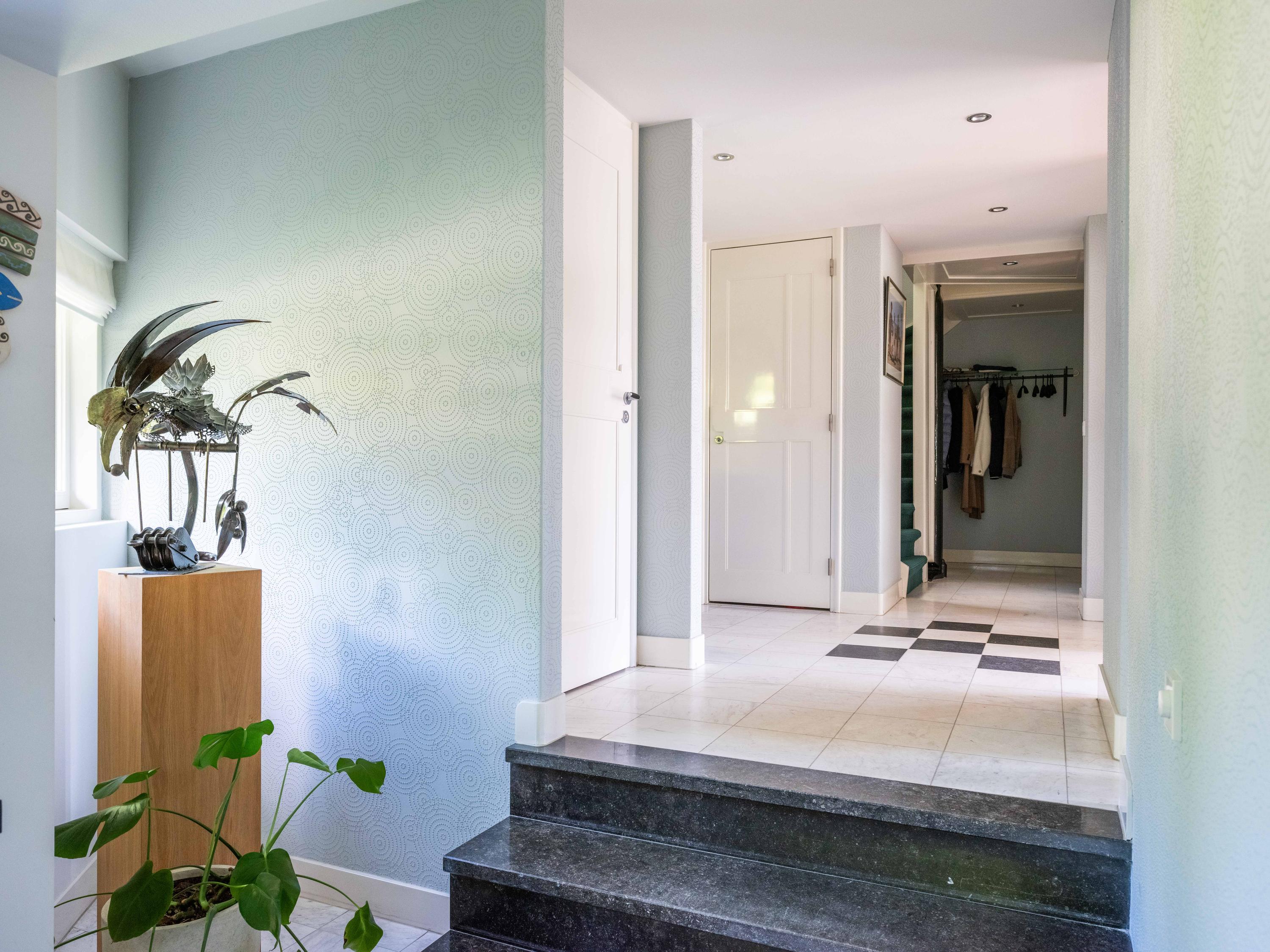 Een kronkelig paadje tussen mooi gevormde ligusterhagen loopt naar de verscholen voordeur. Via de entree lopen we de hal binnen met een garderobe, de trap naar de verdieping en een toilet.