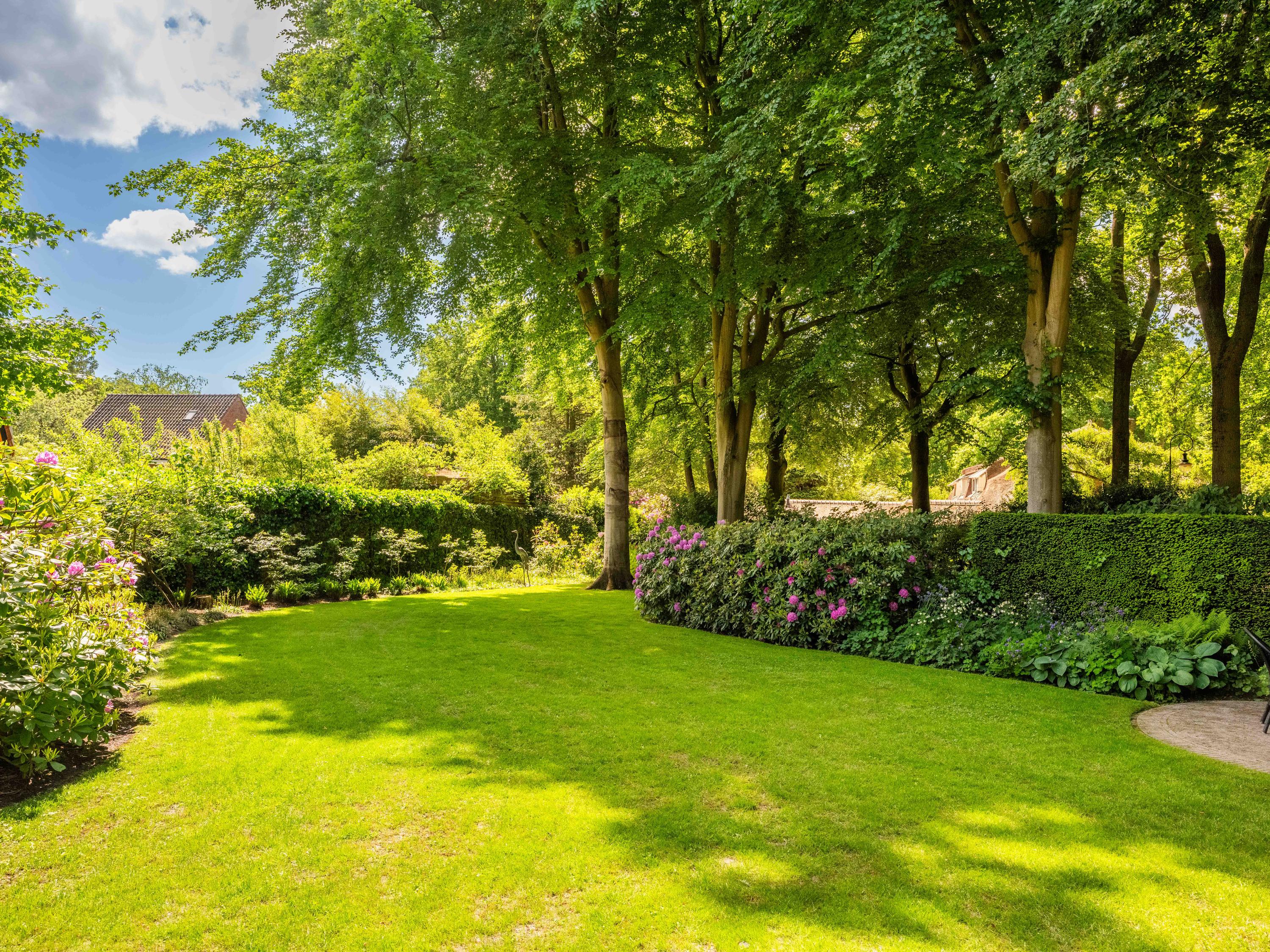 De prachtige parktuin met ligusterhagen, bloempartijen en imposante bomen is rondom de villa gelegen. Naast de villa staat een in dezelfde stijl gebouwde en volledig geïsoleerde schuur voor bijvoorbeeld de fiets, tuinspullen, etc. Hier treft men ook de opvang voor het centrale stofzuigersysteem en de pomp en bewateringsinstallatie voor de tuin.