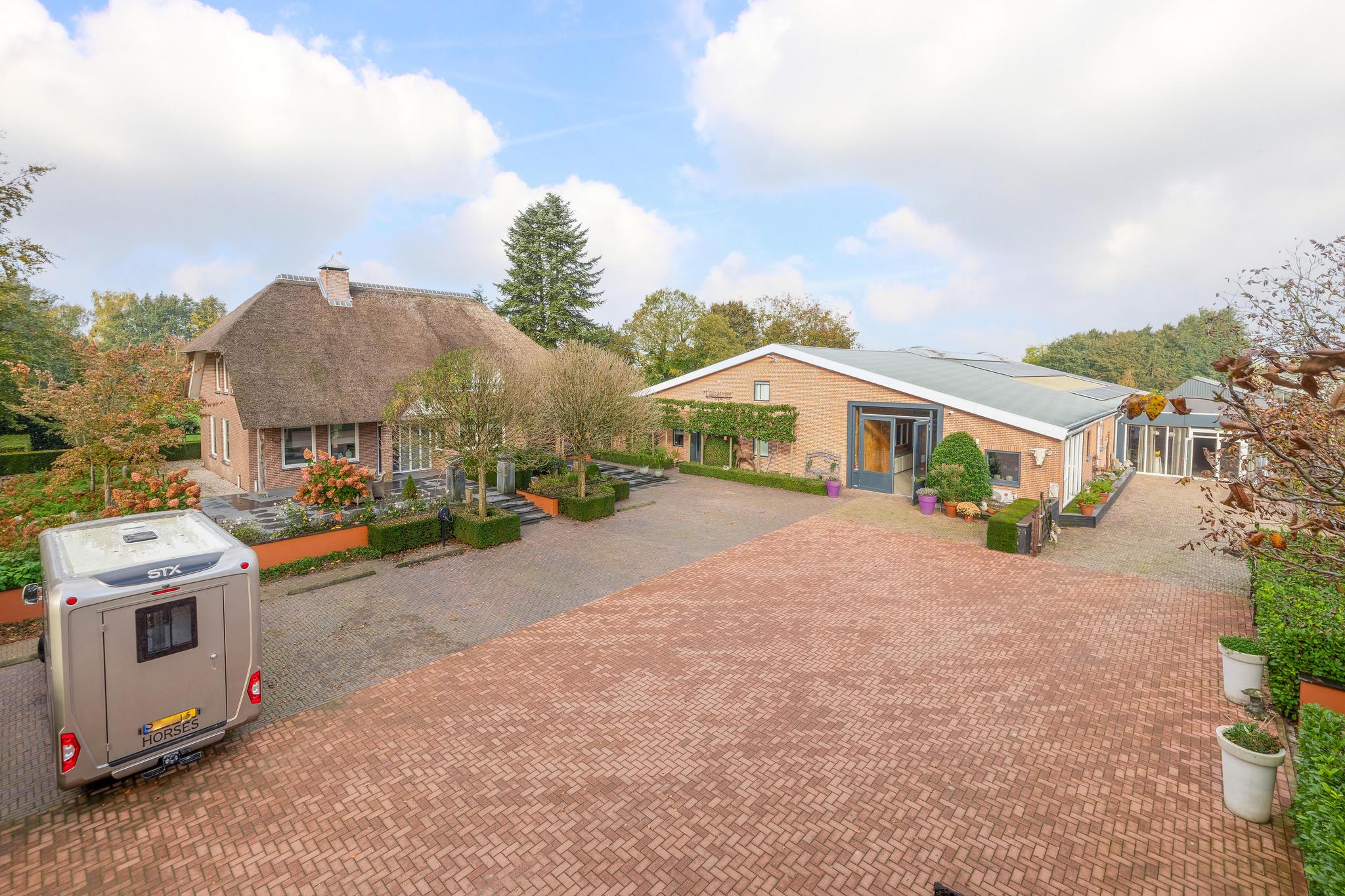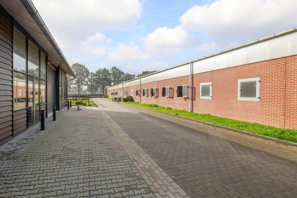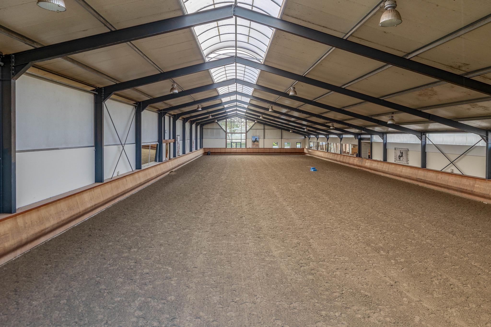 Complete hippische accommodatie o.a. uitgerust met een vrijstaand woonhuis, appartement, kantoorgedeelte, een rijhal met binnenpiste en in totaal 31 paardenboxen, een buitenpiste, overdekte stapmolen, longeercirkel, diverse paddocks, weiland, een opslag/veldschuur en een vrijstaande loods.