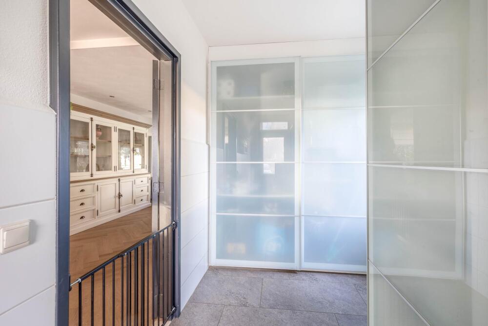 De hal biedt toegang tot de woonkamer, meterkast en middels een vaste trap is er toegang tot de 1e verdieping. De hal is voorzien van een PVC-vloer in visgraatmotief, deels metselwerk/ deels stucwerk wanden en een stucwerk plafond. De hal biedt toegang tot de woonkamer, meterkast en middels een vaste trap is er toegang tot de 1e verdieping. De royale leefkeuken is eveneens voorzien van dezelfde PVC-vloer in visgraatmotief. De wanden en het plafond zijn voorzien van stucwerk. De keukeninrichting is in een U-opstelling met een bergeiland. De keuken is verder uitgerust met een vaatwasser, combimagnetron, spoelbak, 5-pits gaskookplaat en een koelkast. Vanuit de keuken is er toegang tot de kelder. De kelder is geheel betegeld en uitgerust met een koekoek en een raam. Er zijn vaste schappen en een houten trap aanwezig. Een luik biedt toegang naar de ruimte onder de woning. De praktische bijkeuken is deels betegeld en de vloer is bedekt met een tegelvloer welke is voorzien van vloerverwarming. Praktische schuifkasten zorgen voor opbergruimte. Hier zijn de opstelling voor de CV-combiketel, de unit voor de vloerverwarming en de aansluitingen voor de wasapparatuur gesitueerd. Vanuit de bijkeuken is er toegang tot de toiletruimte en het erf. De toiletruimte is geheel betegeld en verder voorzien van een fonteintje en een zwevend toilet.