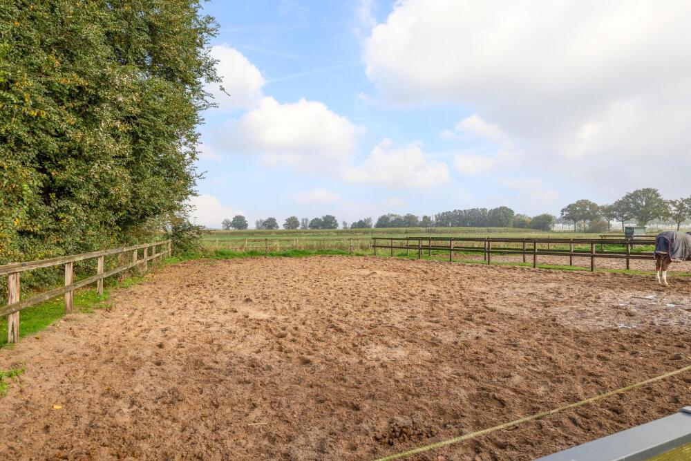Het erf is verder ingericht met een buitenpiste, overdekte stapmolen, een longeercirkel, diverse paddocks, een opslag/veldschuur, schuur, mestvaalt, weiland en een vrijstaande loods. Er is voldoende parkeergelegenheid aanwezig voor het stallen van o.a. trailers en vrachtwagens. Het erf kan worden afgesloten met een elektrische openslaande poort. De opslag/veldschuur met open front is opgetrokken uit deels metselwerk / deels damwand met houten spanten en een damwand dak.