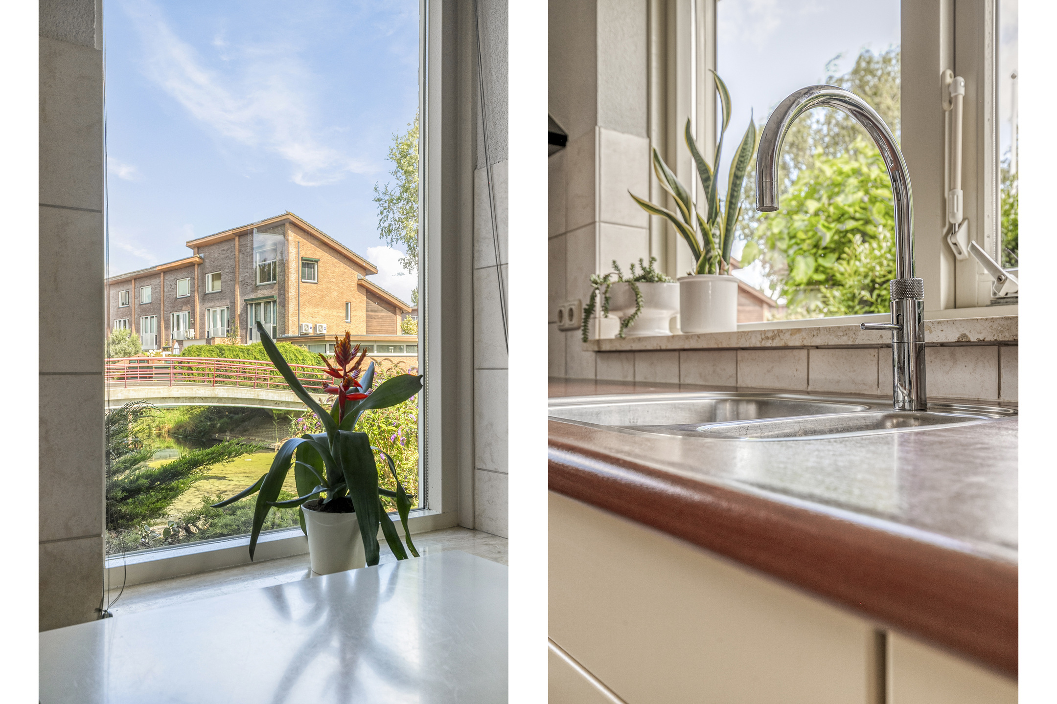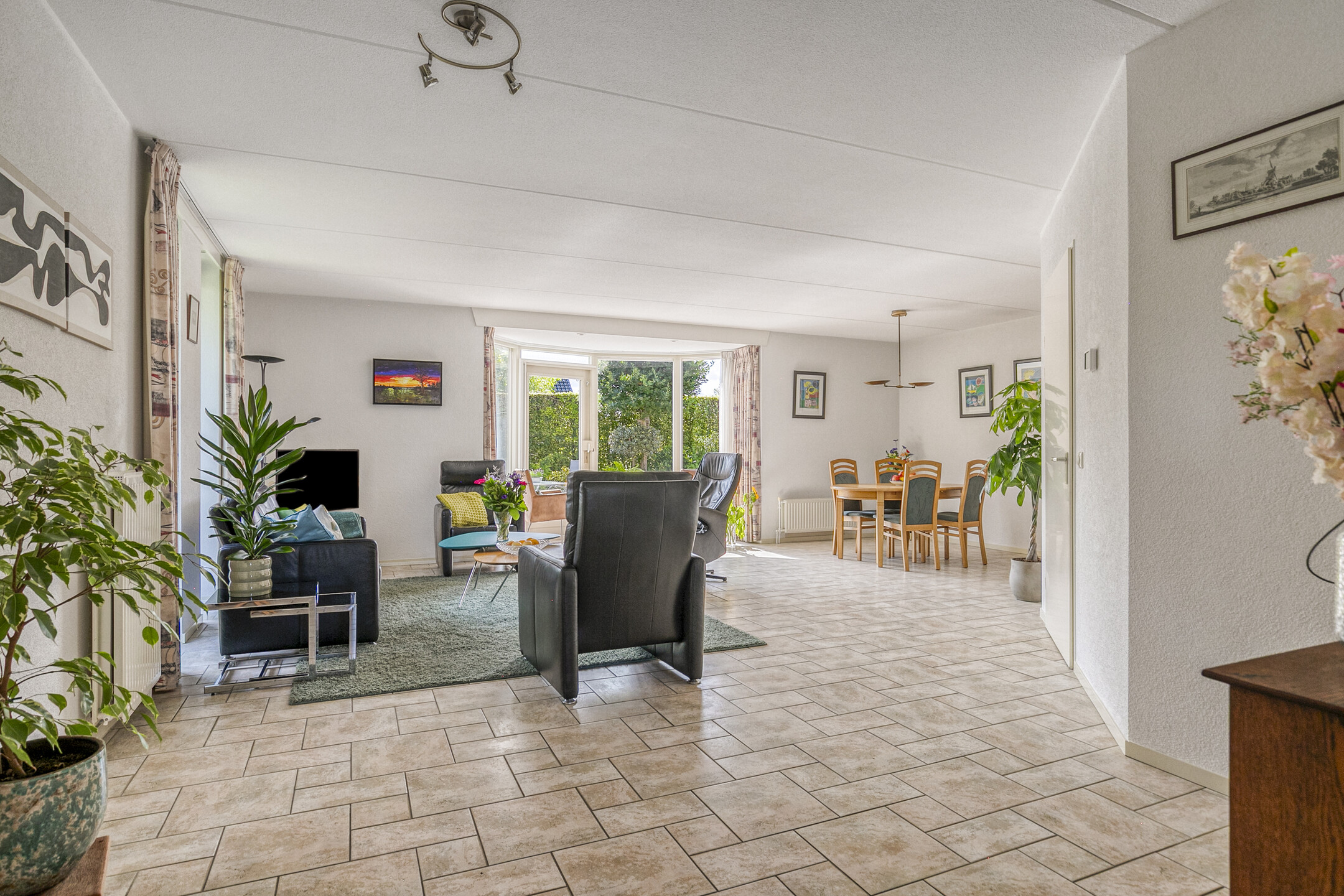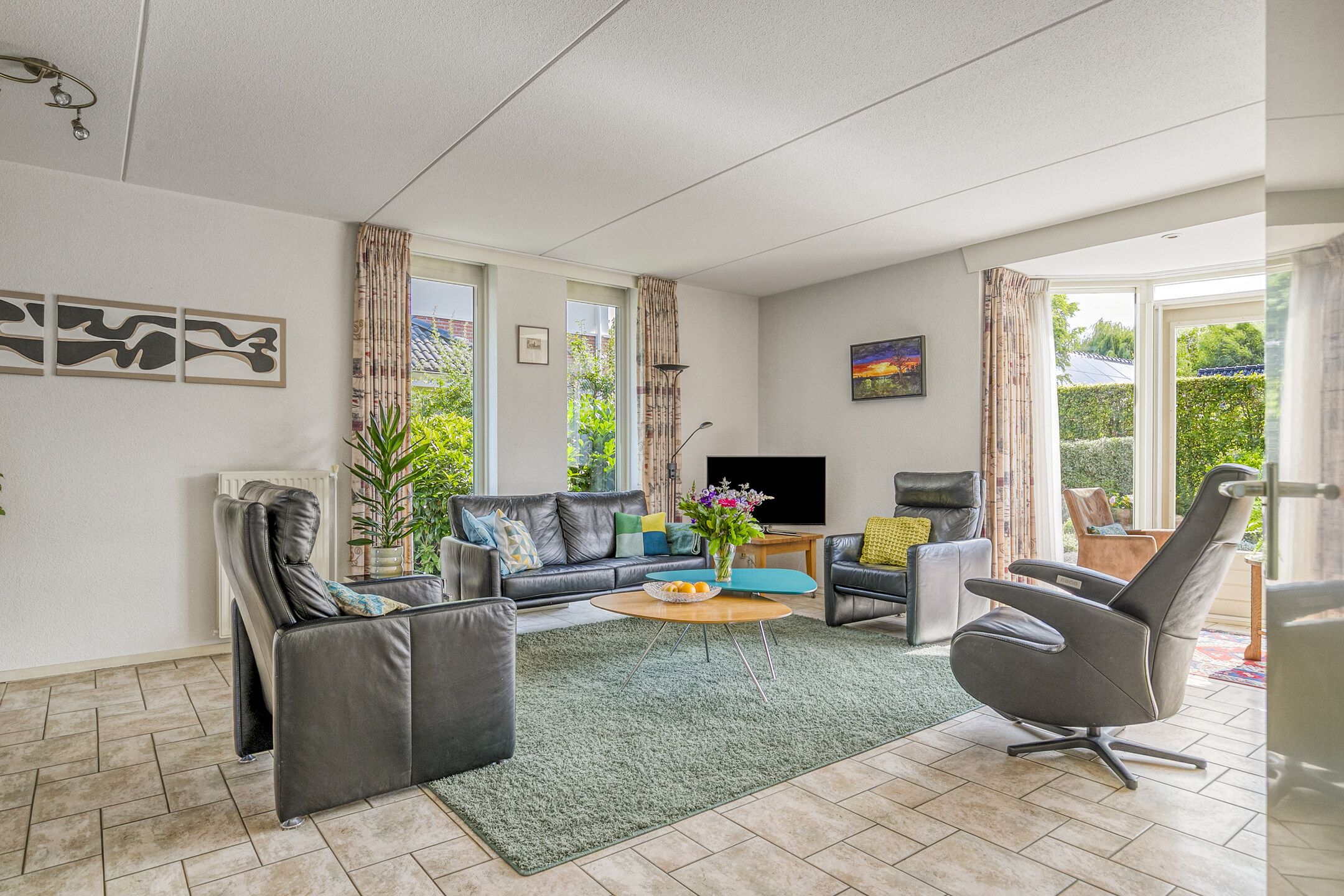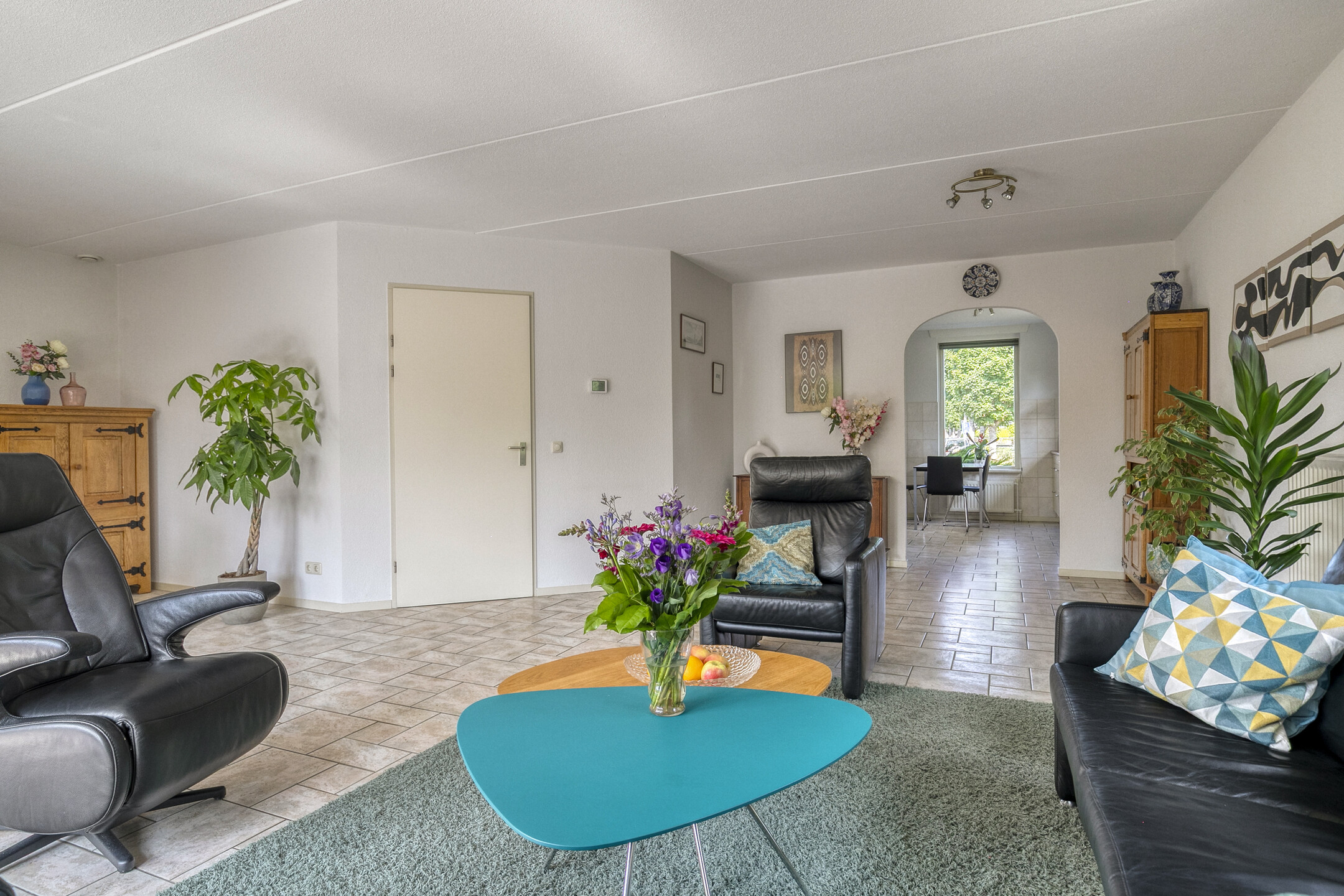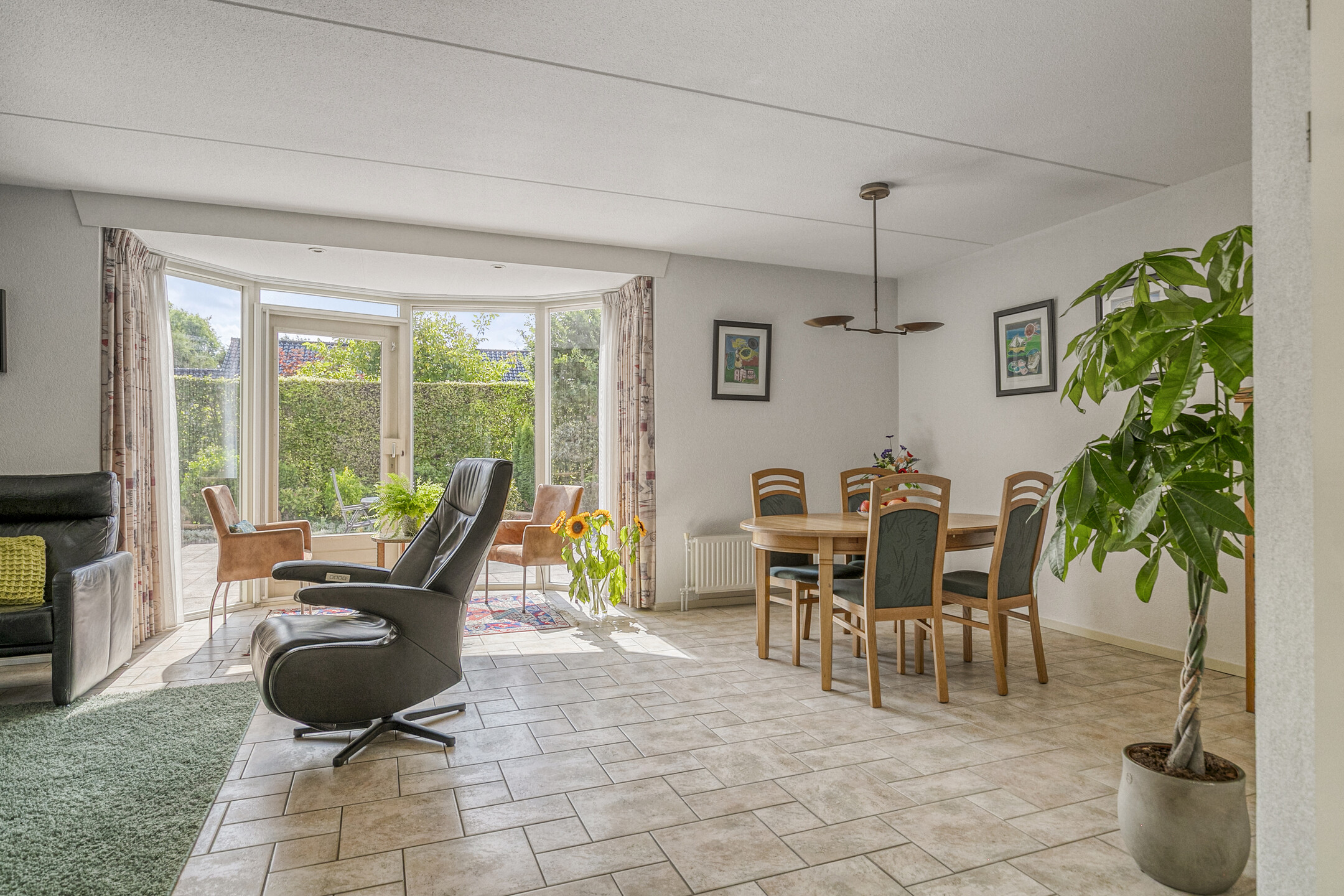 Aan de achterzijde van de woning bevindt zich de royale en lichte woonkamer met sfeervolle erker en een deur naar de tuin. De erker zorgt voor extra lichtinval en een prachtig uitzicht op het groen.
