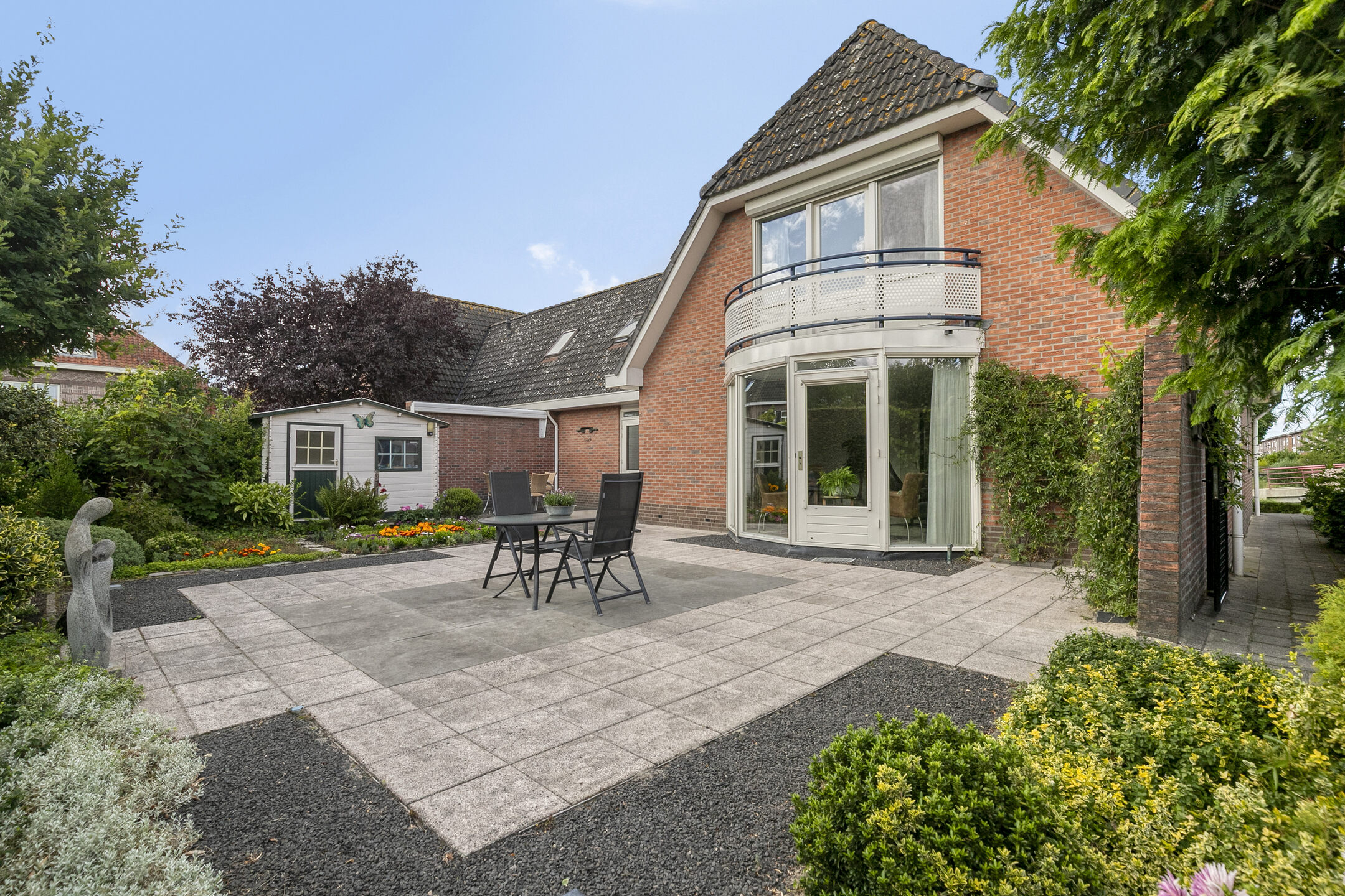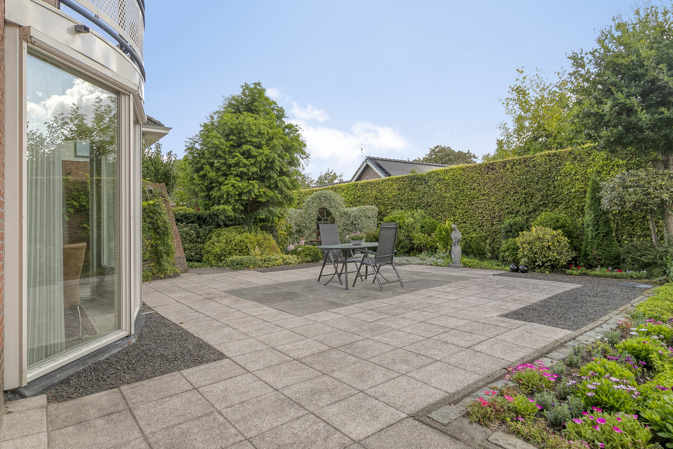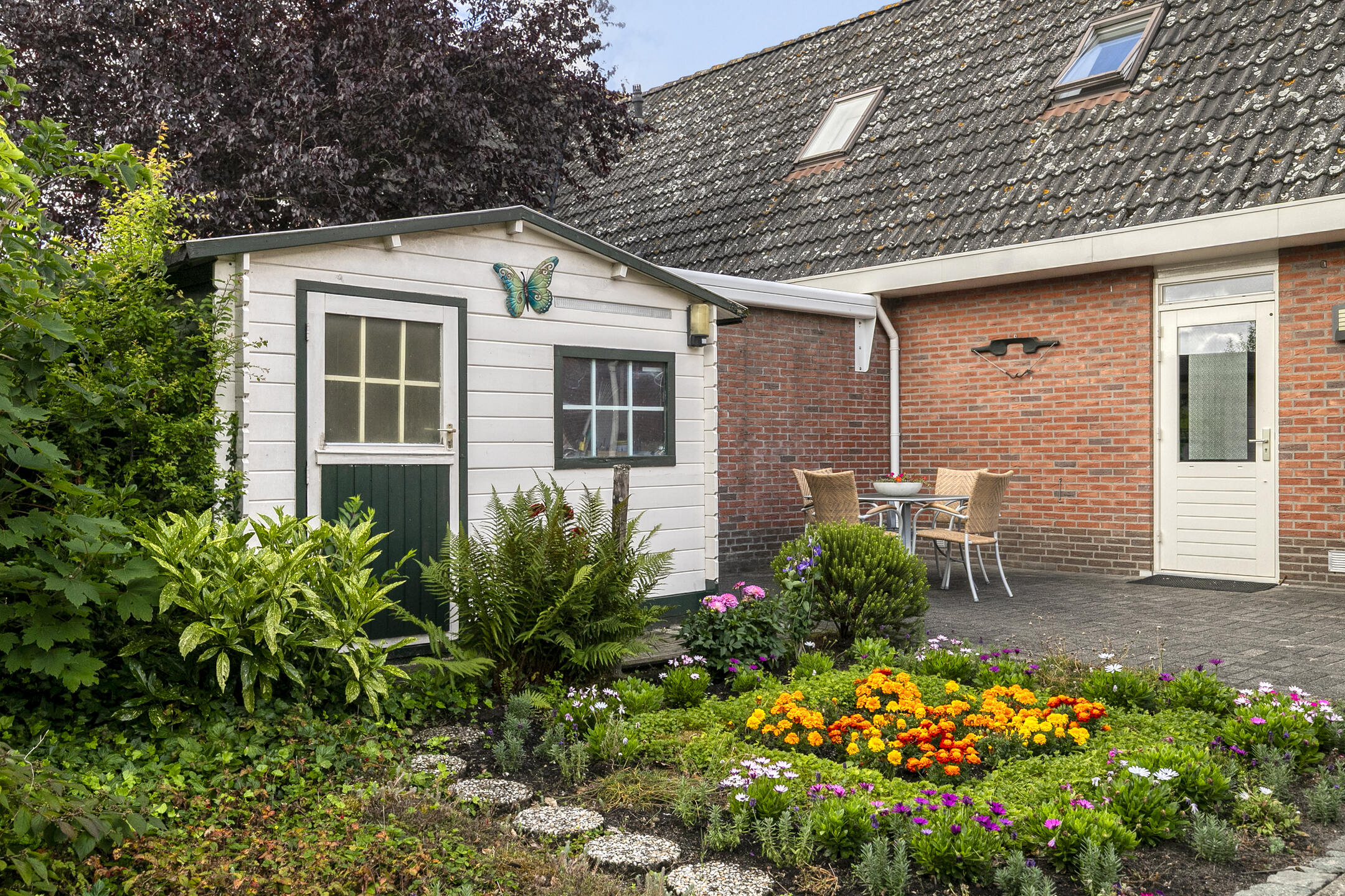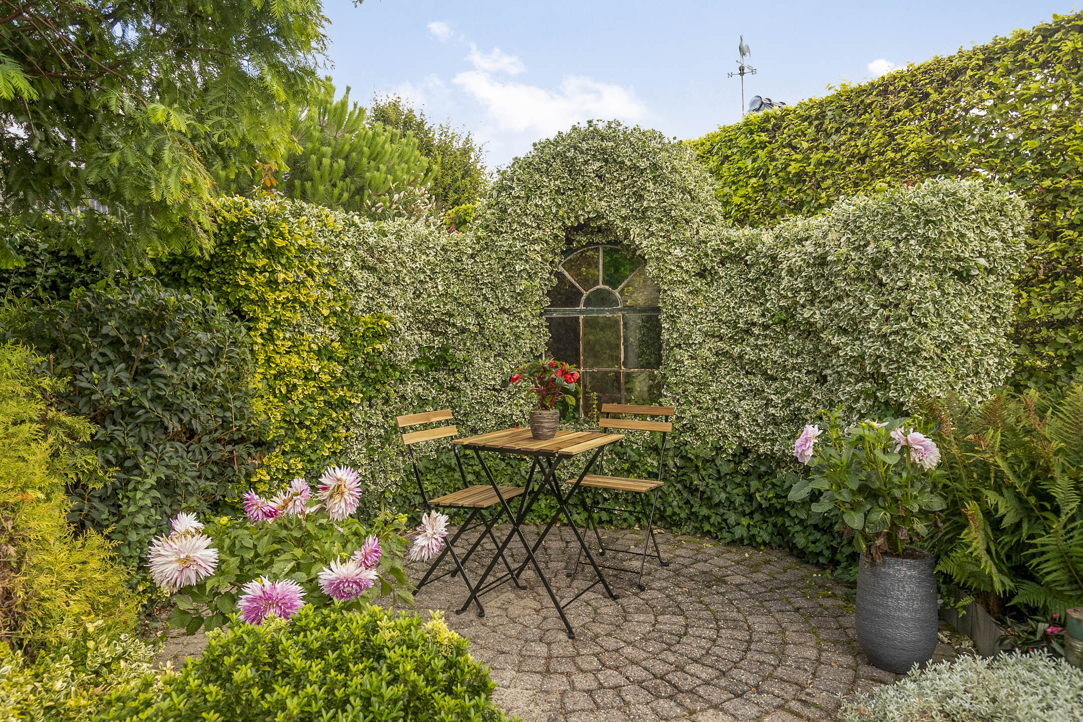 De fraai aangelegde achtertuin ligt op het zonnige zuidoosten en biedt een prachtige variatie aan bloemen en beplanting. Meerdere terrassen zorgen ervoor dat u op elk moment van de dag een plekje in de zon of schaduw kunt vinden. Een bijzonder detail is het gezellige hoekje voor de avondzon, sfeervol aangekleed met een glas-in-looddecoratie. Achterin de tuin bevindt zich een houten berging voor het opbergen van tuingereedschap en fietsen.